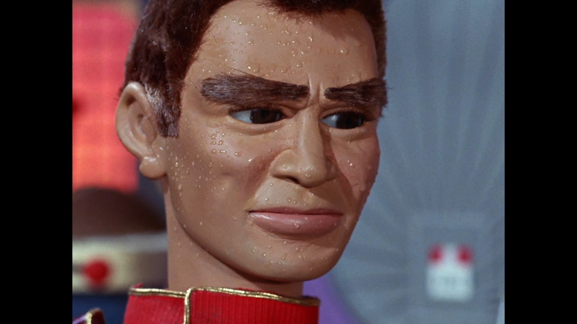 Thanks to the wonders of high definition, we can see the wires which the WASP jets are being yanked along as fast as possible. The fact we can see these wires is not a bad thing as far as I’m concerned. I point these things out for the fun of it. I’ve heard criticism that Supermarionation shows shouldn’t be available in HD because of wires being so visible and apparently ruining it. I’ve never understood the correlation some people draw between the quality of the finished product, and how visible the wires are. Of course there are flippin’ wires, it’s how the flippin’ shows are made. Surely it only takes a split second to get over it and become absorbed in the story? And it’s only a few steps away from moaning about wires to saying, “oh I enjoyed that movie, but it’s a shame they used cameras to make it. If they hadn’t gone and filmed the bloomin’ thing it would have been much more believable.” And d’you know what? I can’t resist it any longer – here’s a quote from Garth Marenghi’s Darkplace, one of the greatest television shows in the entire universe: “If you go to a Punch and Judy show and you’re only watching the wires – you’re a freak.” End of discussion.