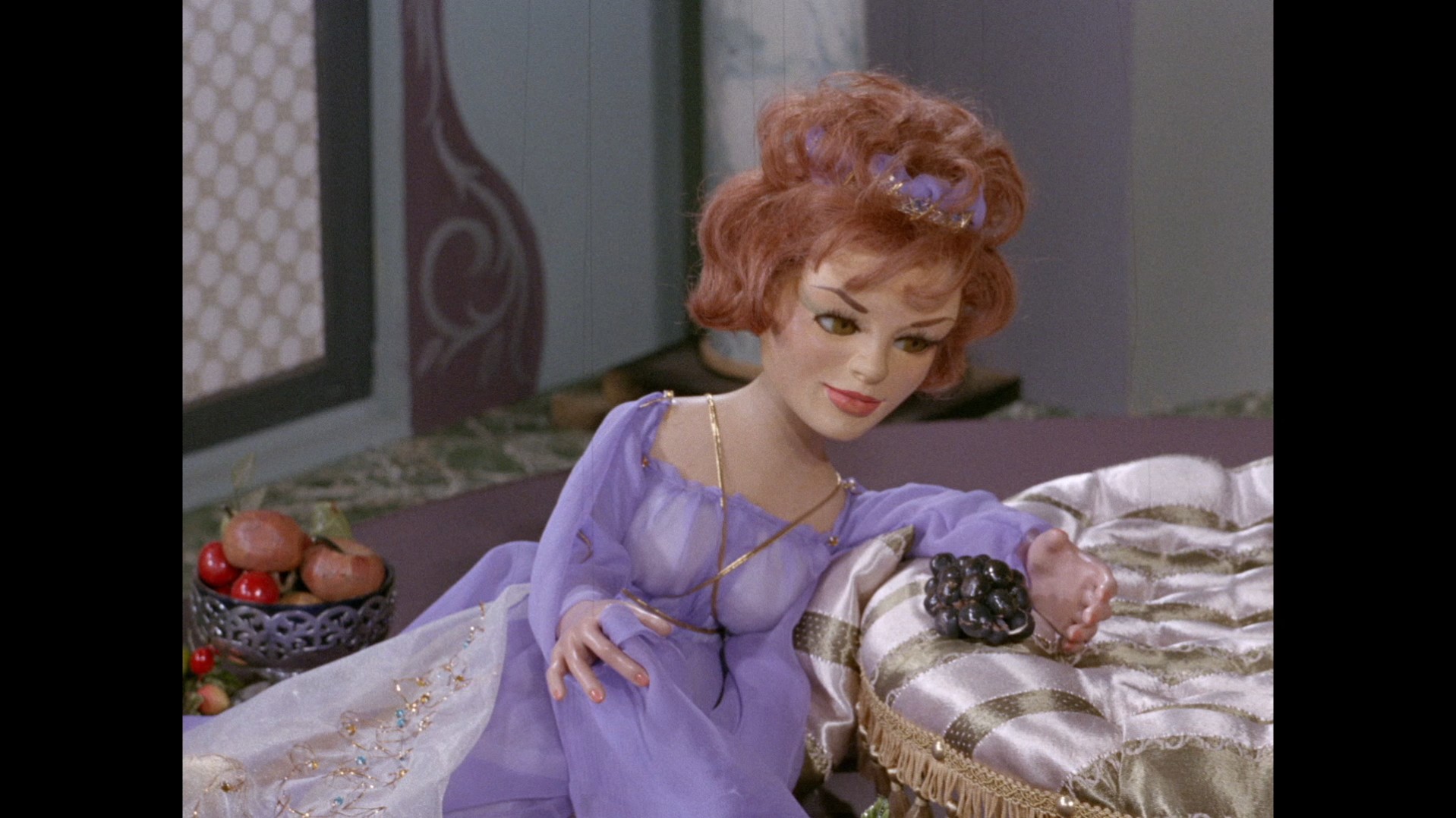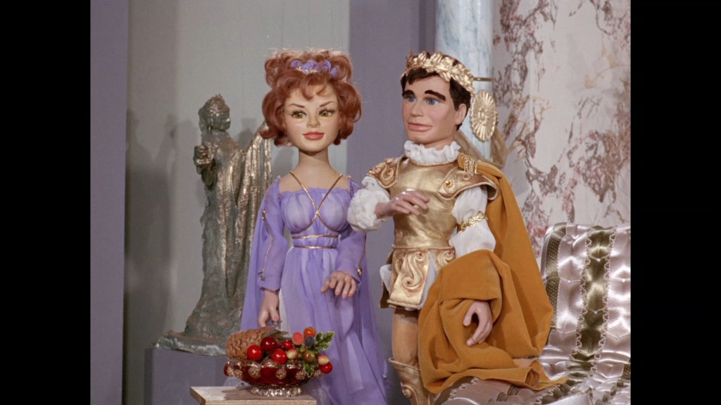 Marina, who has finally received a change of outfit for the first time, is also an accomplished harp player in Troy’s fantasy. In reality, all the harp sections for this episode are being performed by Tryphena Partridge under Barry Gray’s direction.