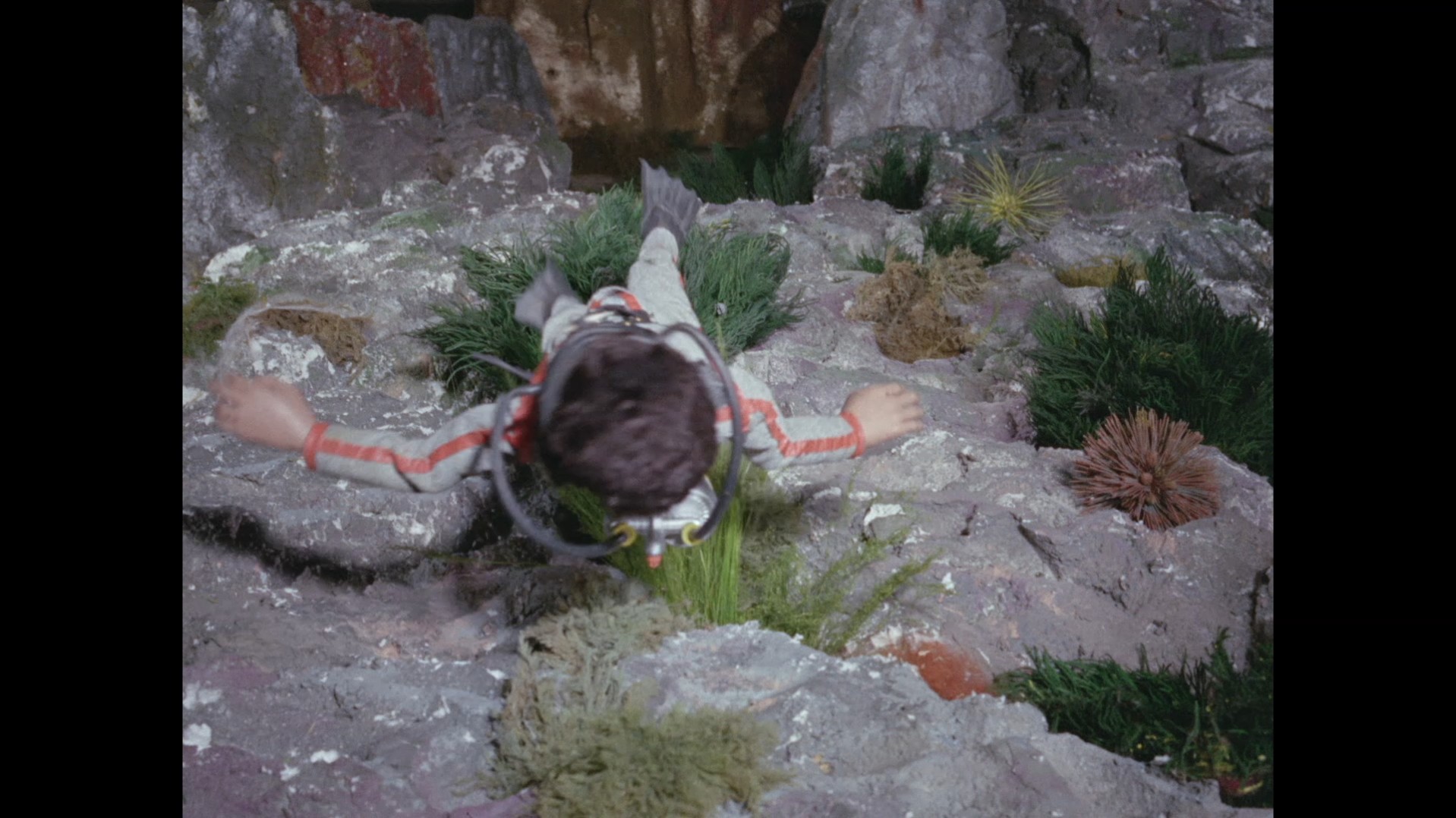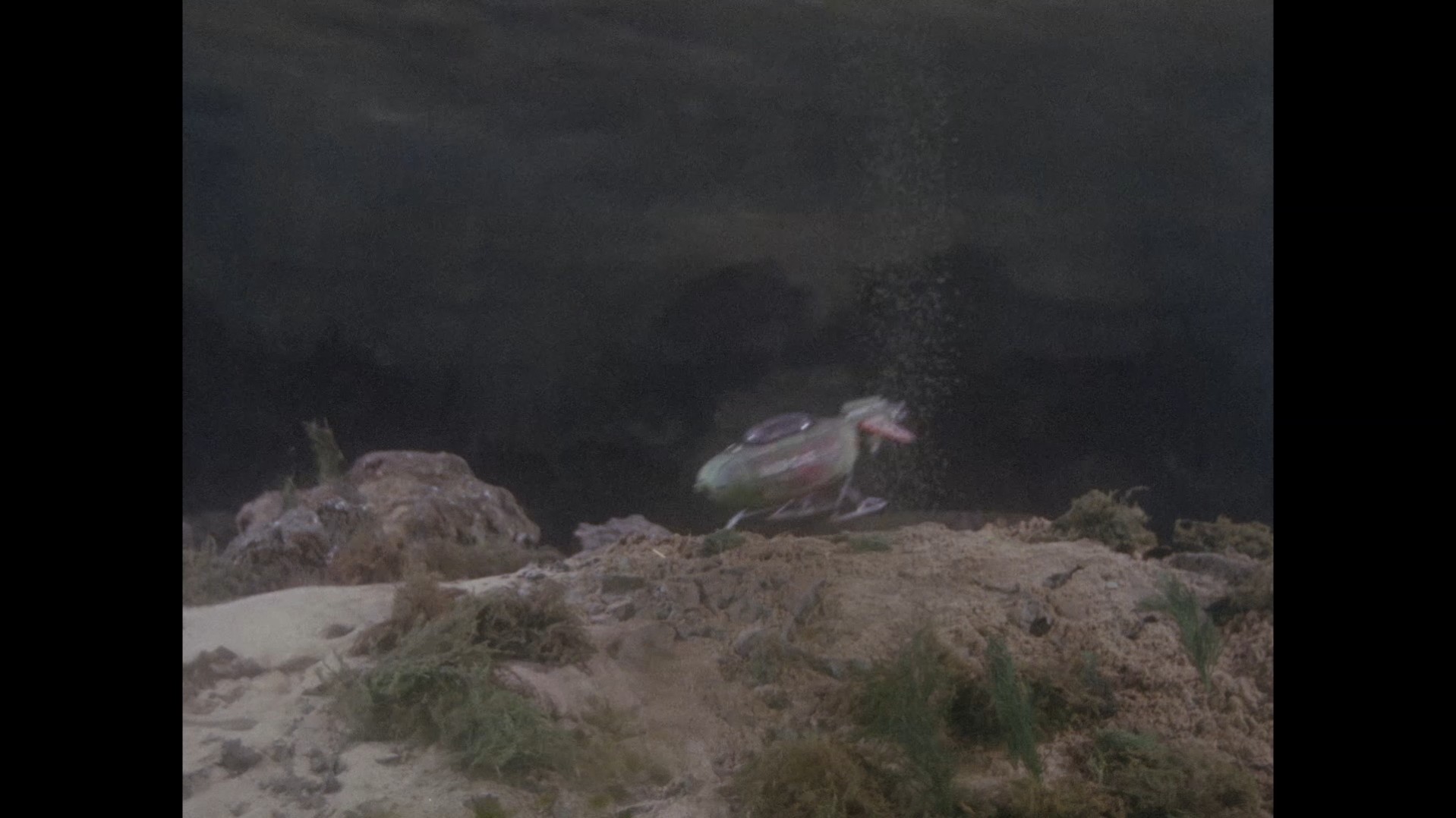 Hepcat hits the bottom of the ocean with remarkably little fuss. Not even a puff of dust. Just a sudden cut to the two lads knocked out inside the cabin. What’s really interesting is that this shot reveals the Supercar canopy has been installed back to front. The front of Supercar’s canopy has a rectangular gap cut out of the middle to make room for the clear-vu monitor, while the rear is a smooth curve which is what we can see here.
