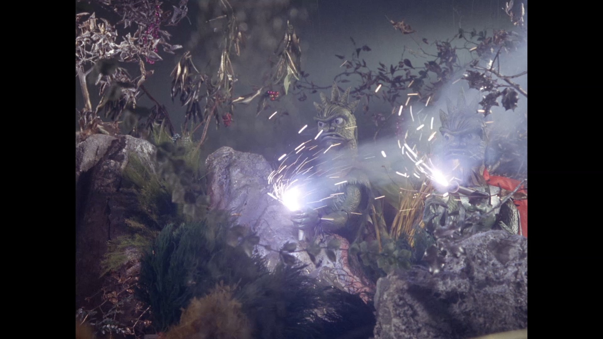 As panic ensues inside the palace, a whole army of Aquaphibians open fire and begin their attack. The mood of Troy’s dream quickly turns to despair. Only two identical Aquaphibian puppets were created for the series, so to create the illusion of a whole troop of them, each soldier has a unique item of clothing so that we can tell them apart and believe there’s a large number of them. From shoulder pads, to an orange scarf, to a green cape, it’s fair to say the wardrobe department had possibly run out of time at this point, after creating all the wonderful outfits for Troy, Phones, Atlanta, and Marina.