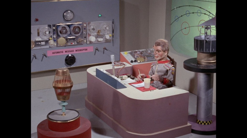 For the first time, we get to actually see the Marineville Tracking Station. Previously just a disembodied voice in the ceiling, it turns out there are people who actually work there. The room is packed with equipment that we’ve seen previously such as the swingy-spinny-thing from Weather Station 4 seen in The Invaders, X20’s tape recorder from Countdown and Marty’s remote directing station from Stand By For Action. Lt. Misen wears a slight variation on the WASP uniform with different epaulettes and a new badge on his arm. The Automatic Message Interceptor unit on the wall is, of course, made up using some of the same components we’d later see aboard Thunderbird 5.