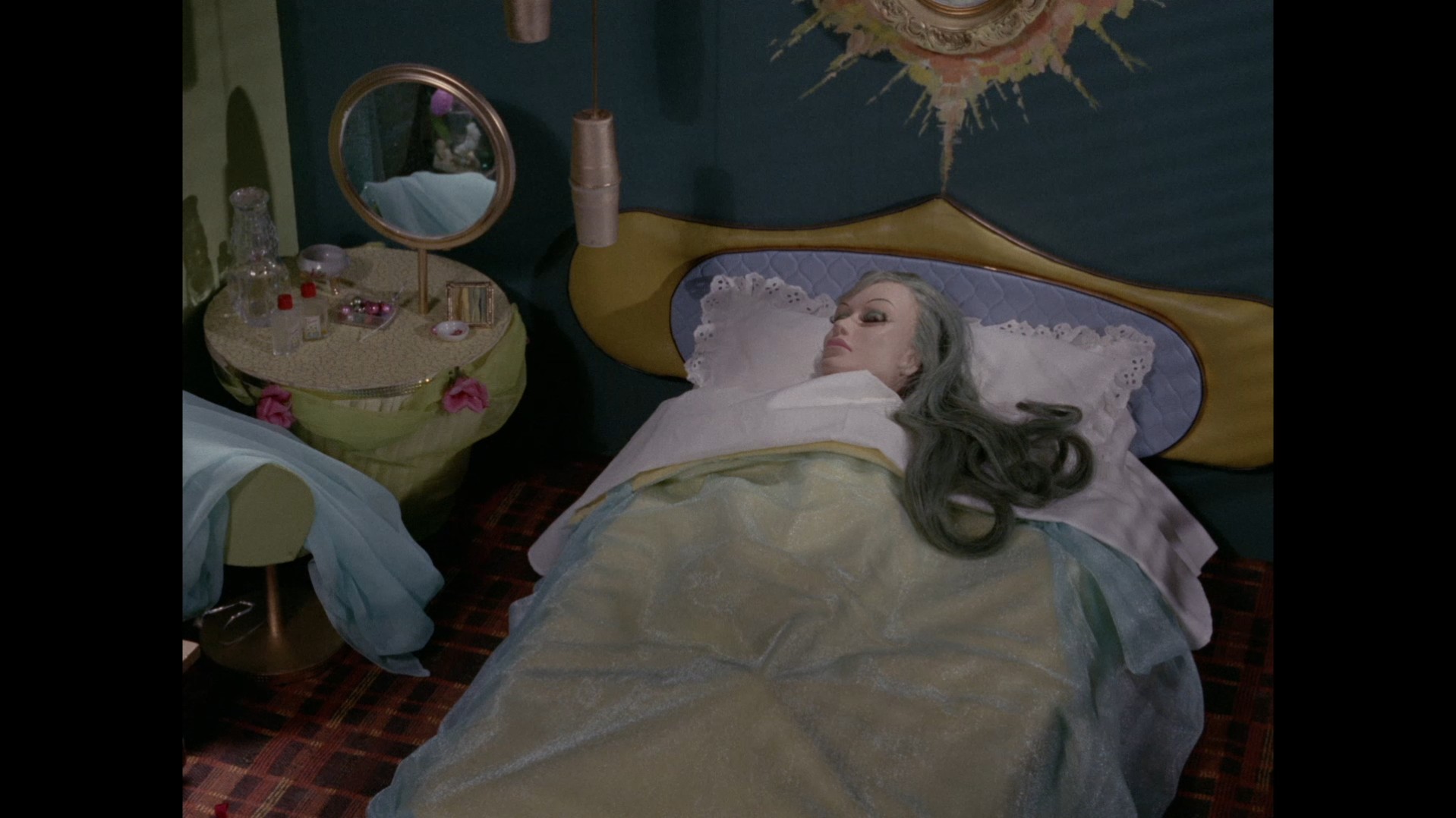 Atlanta’s bedroom is pretty much unchanged since its last appearance in The Disappearing Ships. The chair in the middle of the room has been swapped for a different one, and she also keeps that same black and white photo of Troy on her bedside table. If you look at the very left of frame, you’ll actually see that she has exactly the same makeup table that we just saw in Marina’s bedroom a few seconds ago. How wild is that? You can also spot that the floor pattern at the end of the bed is curling up slightly, suggesting that it’s actually wallpaper or something like that which has been used to suggest the tiled flooring. Quite a clever technique, just a shame the join is rather obvious.