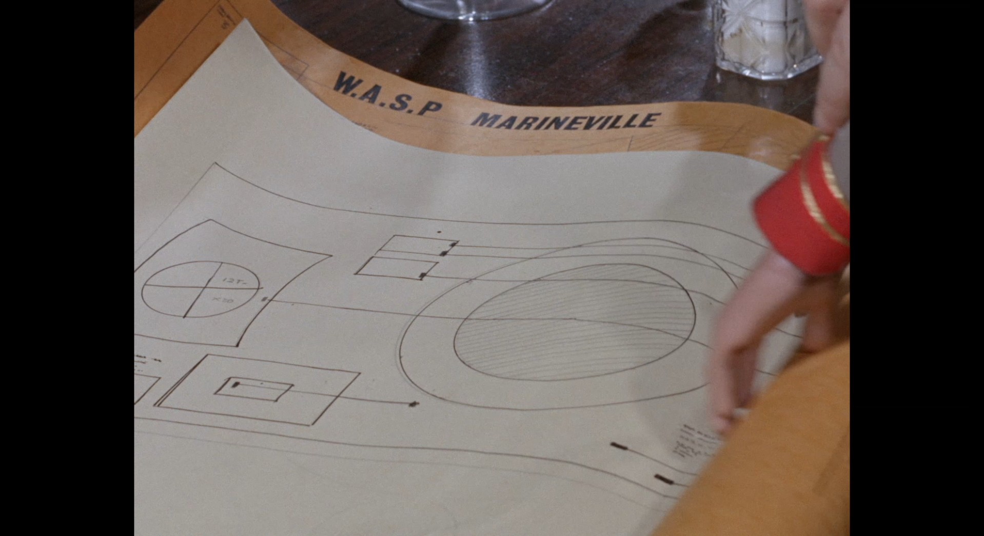 The top secret plans turn out to be diagrams mapping out Marineville. The floor puppeteer’s fingers can be seen helping Phones out with unrolling the documents. The only really meaningful details visible on the plans are a label for the control tower and another for Stingray’s pen, suggesting that the two are in relatively close proximity to each other which we already knew.