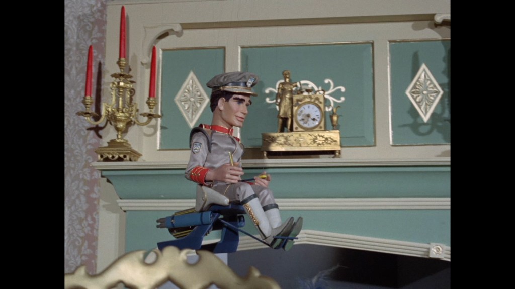 Marina’s monocopter has reappearaed next to the television, but she doesn’t join Troy and Phones just yet while they fly over to look at the table. Hope she’s okay getting out of that drawer. It’s really quite surreal watching the puppets fly through a shot like this. Even though the set is massive, the characters still look like themselves, by which I mean they still have that magical Supermarionation illusion of appearing to be alive when they’re really just inanimate objects. Because the puppets are still being lit and shot cinematically, and operated expertly from above, it means they aren’t being lost against the large set. They’re still being filmed like people, not puppets.
