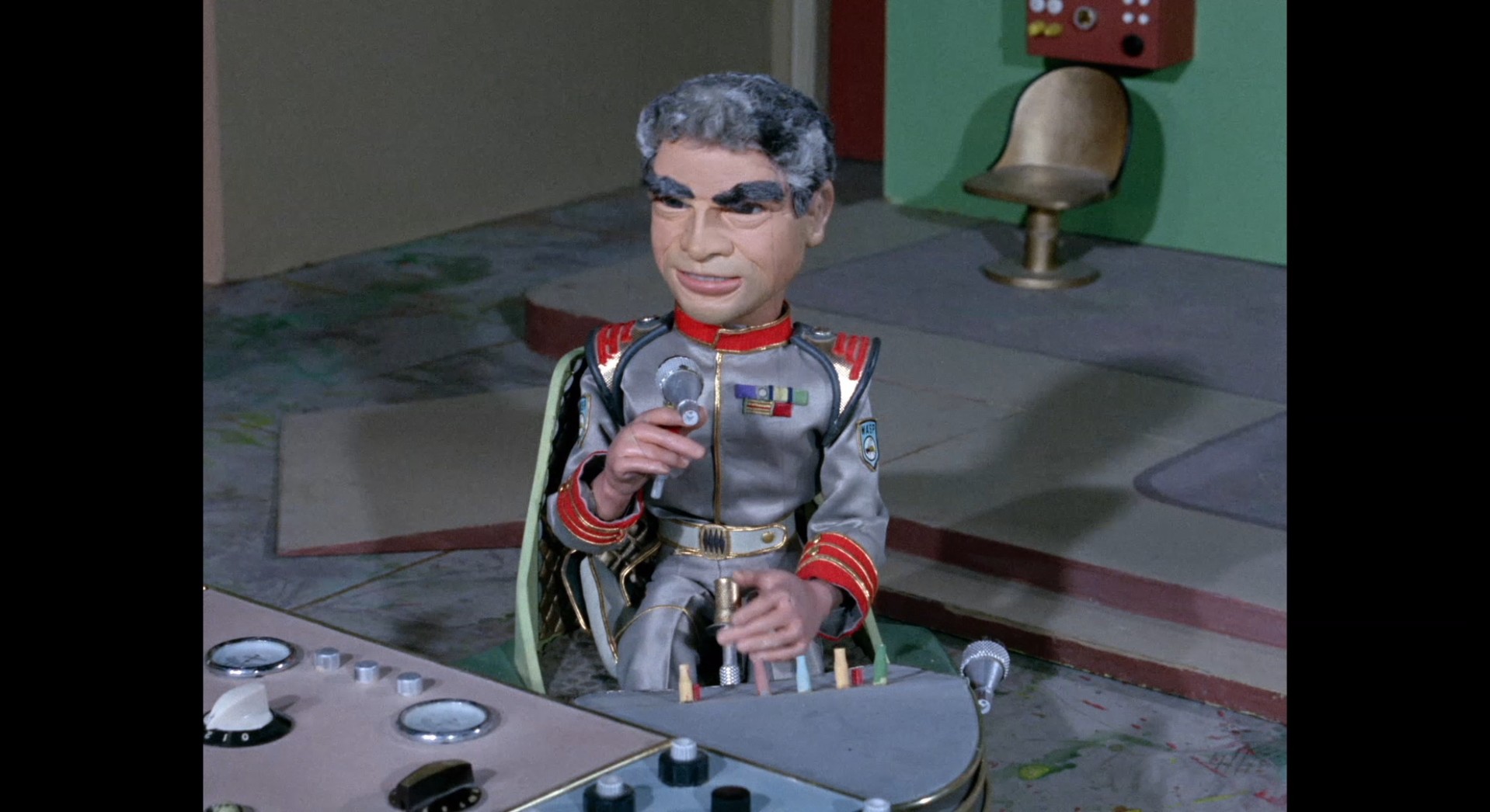Later referred to as ‘Jeevesea’, this Aquaphibian has been promoted from guard duty to being a butler. That either makes him quite important, or he kept pointing his gun in the wrong direction and needed to be posted elsewhere for the safety of his colleagues. Back projection is used behind him so that the full-sized doors can be scaled down to puppet size – but for some reason the back projection footage is in monochrome to completely spoil the illusion.