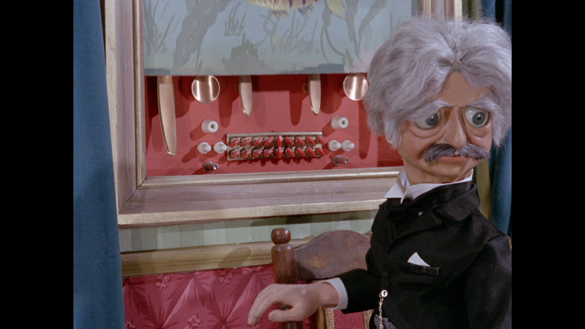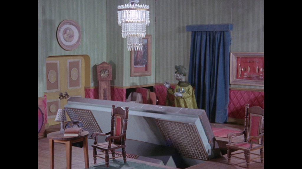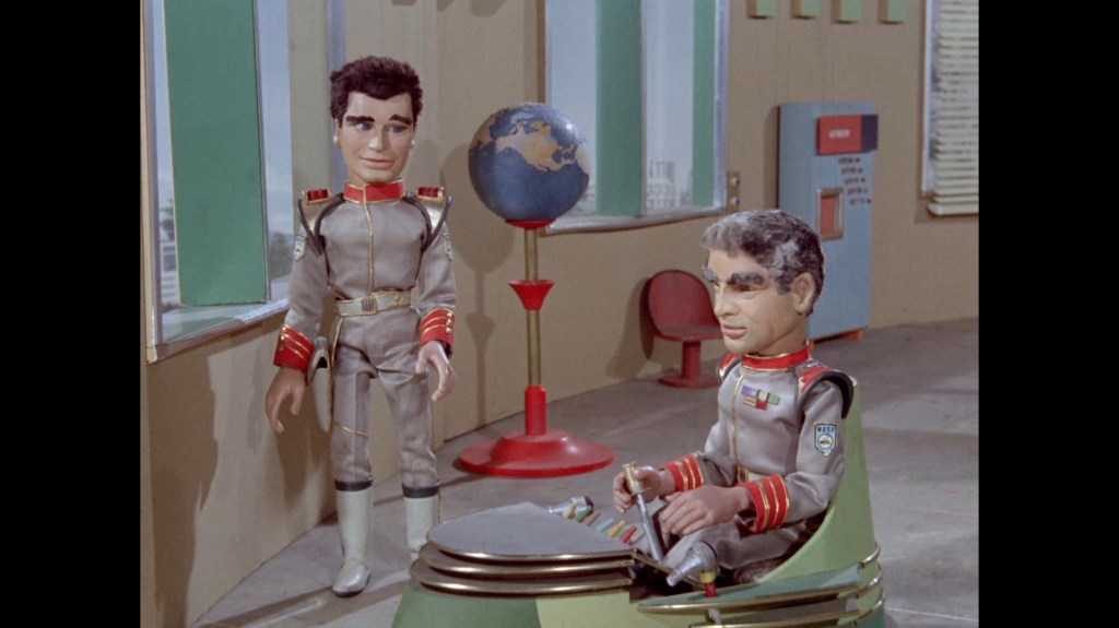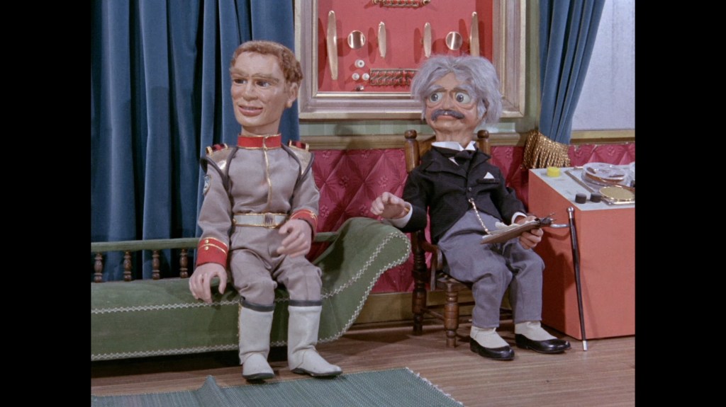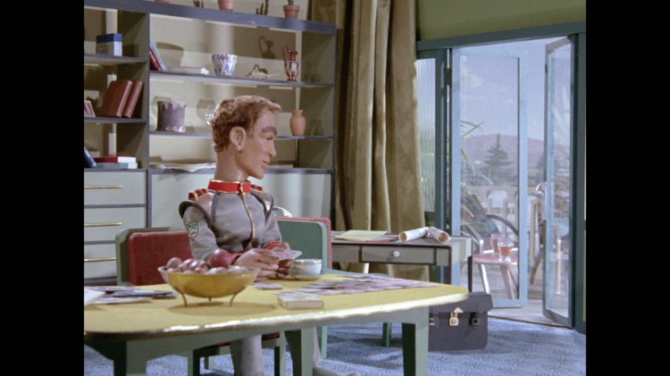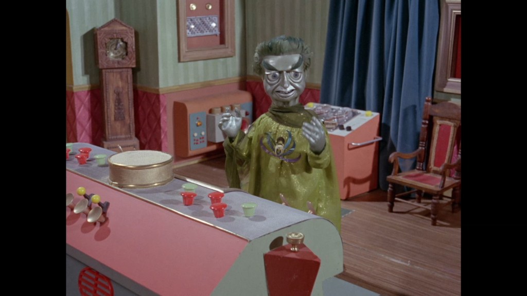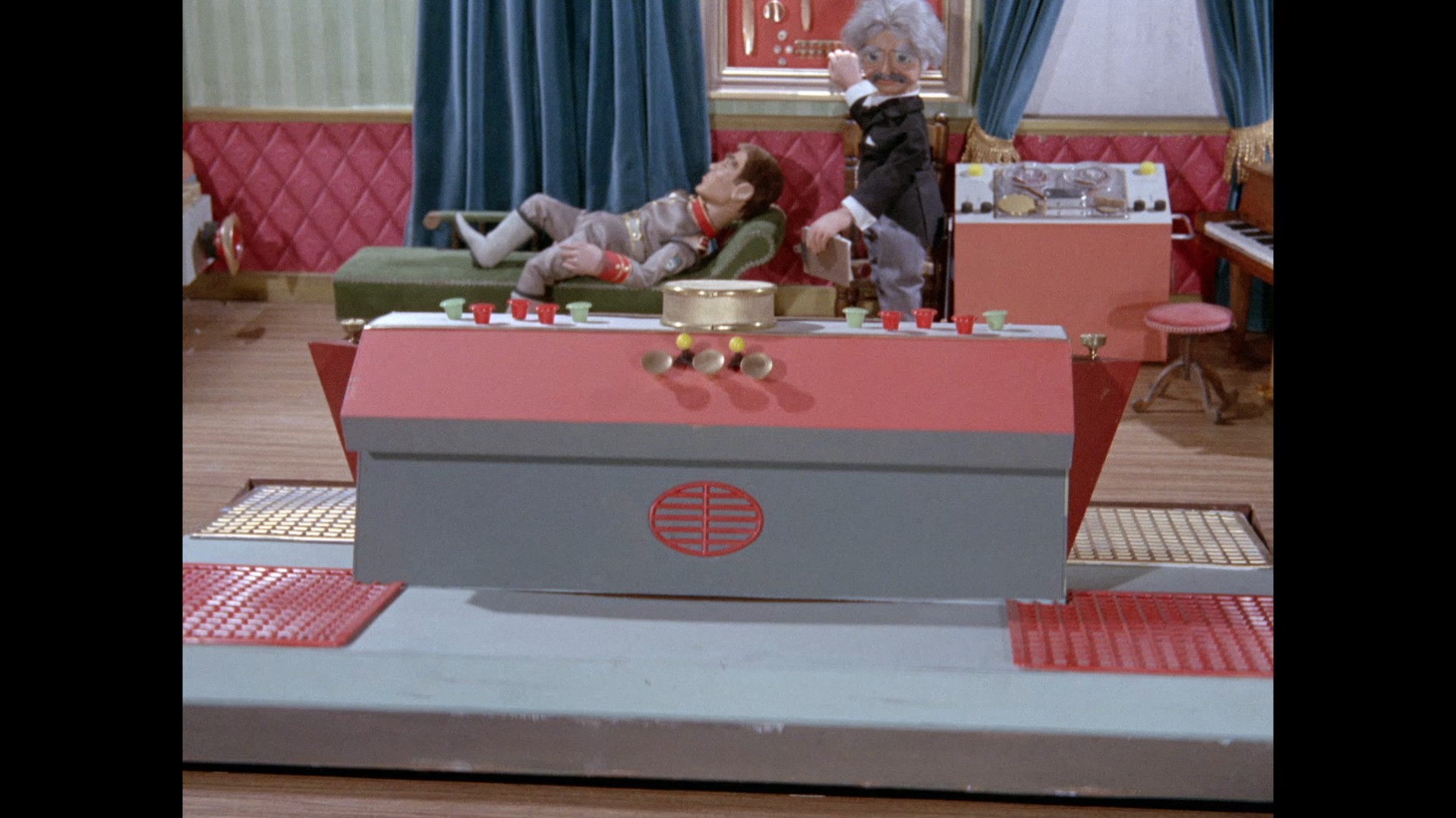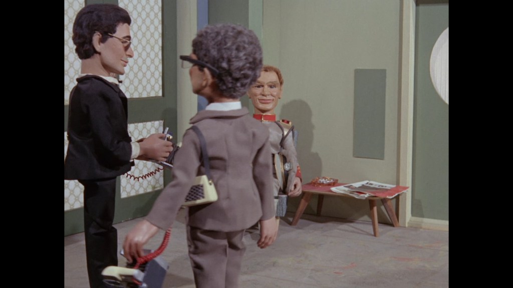 It turns out, our beloved surface agent has treated himself to a new piano. Previously, the corner of the room had been occupied by an old upright piano which dates all the way back to the saloon of Four Feather Falls. This new grand piano prop has a lot in common with the piano seen previously in Plant of Doom (which in turn made appearances in Supercar and Fireball XL5), but has a varnished wood finish rather than being painted. Note all the piano wires which have been painted inside. It’s a beautiful prop, but compare it to the exquisitely detailed concert grand shown in the Joe 90 episode, International Concerto, and you’ll see that this is just one step on the ladder towards the expert craftsmanship the AP Films team were heading towards. I also just love the notion that X20 is the sort of character to indulge himself in such a purchase, and become so engrossed in the fantasy of playing alongside a taped orchestra that he completely ignores a call from his boss. It speaks to the high opinion he has of himself, but also hints that he has talents which would be better suited to a creative, thoughtful, introverted lifestyle, rather than as an audacious master criminal. And best of all, I’ve made all those high and mighty deducations without a word of dialogue being spoken.