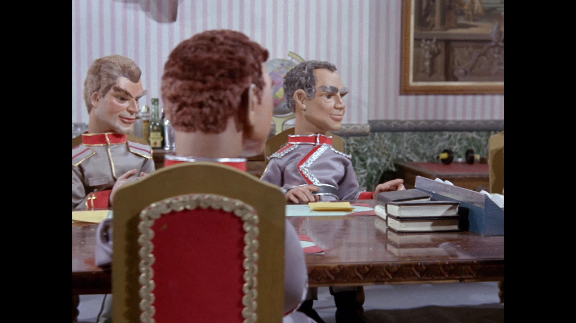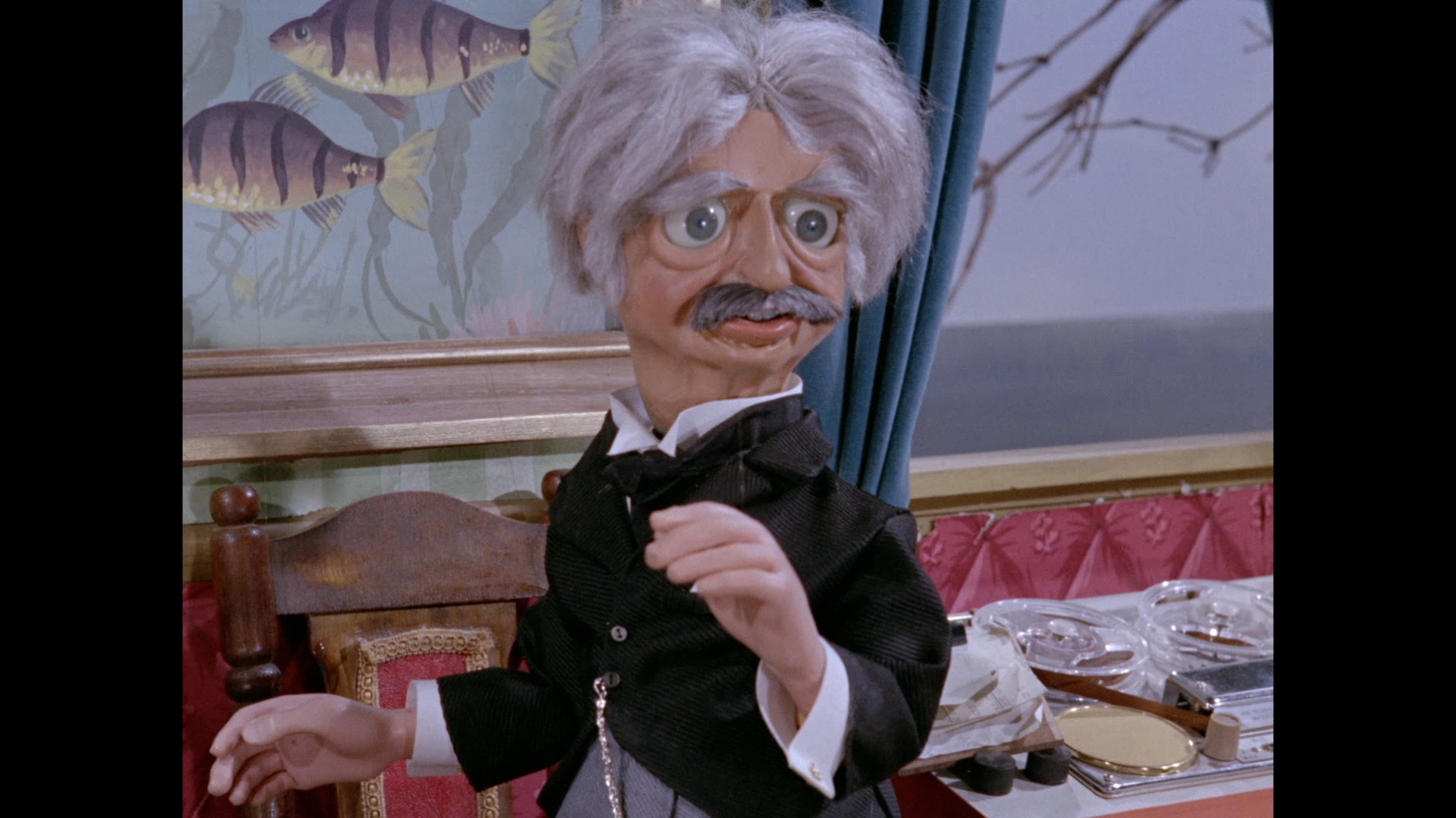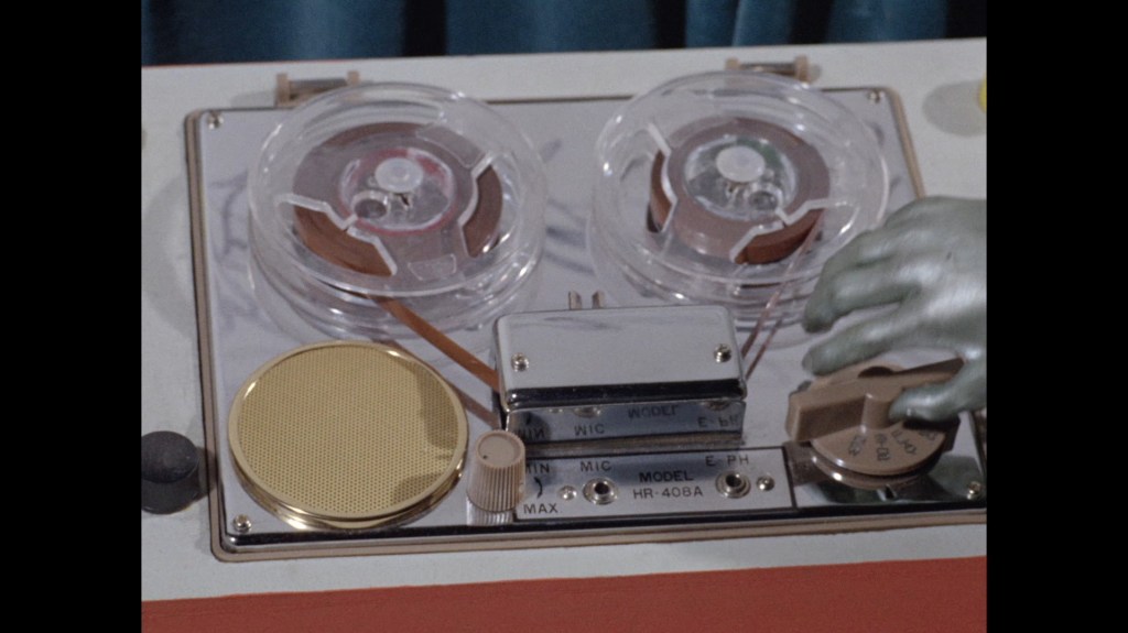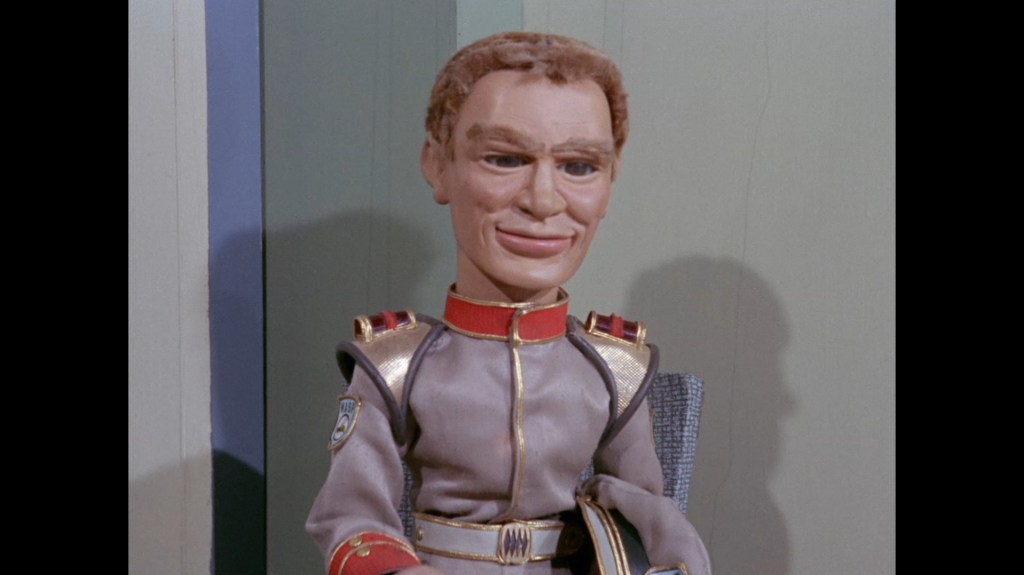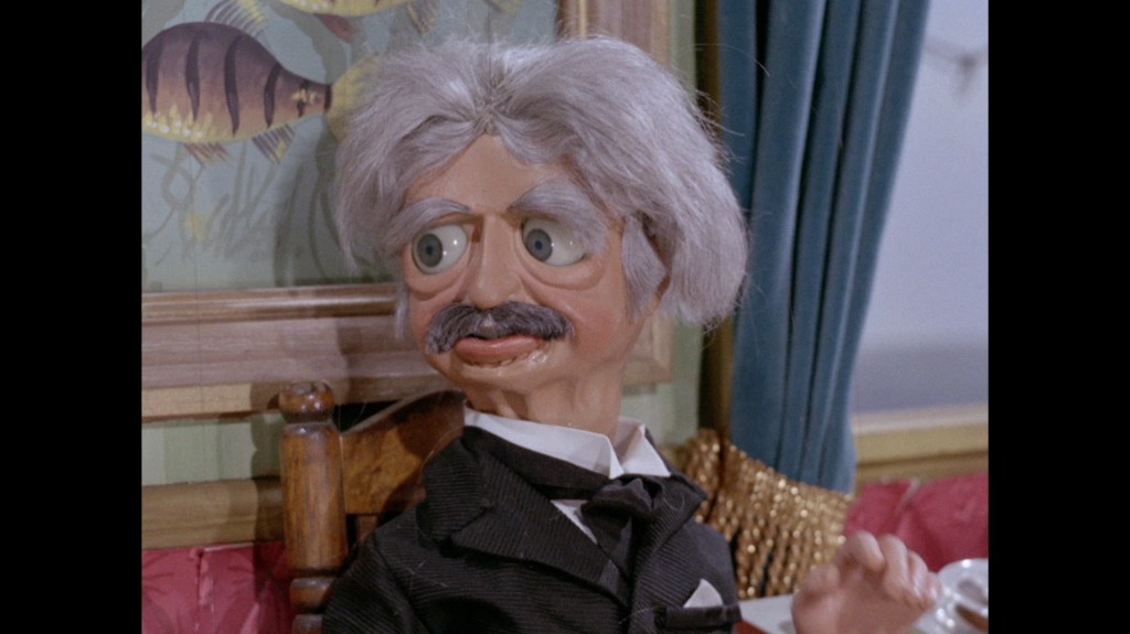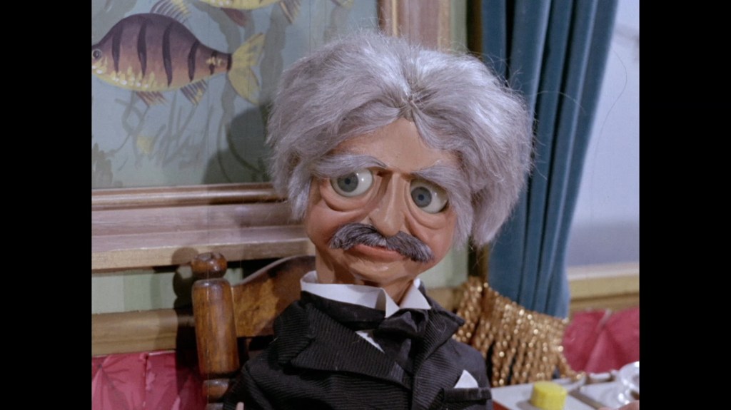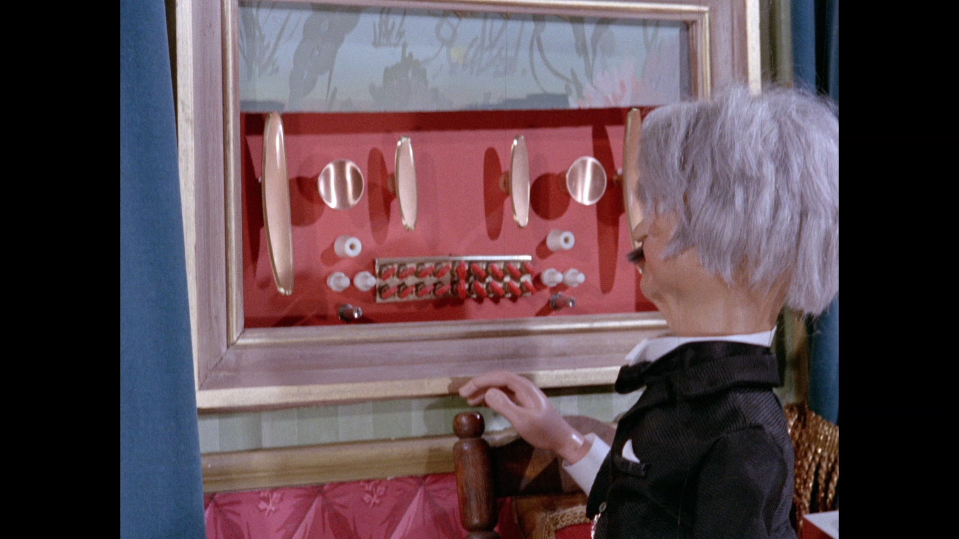 It turns out, our beloved surface agent has treated himself to a new piano. Previously, the corner of the room had been occupied by an old upright piano which dates all the way back to the saloon of Four Feather Falls. This new grand piano prop has a lot in common with the piano seen previously in Plant of Doom (which in turn made appearances in Supercar and Fireball XL5), but has a varnished wood finish rather than being painted. Note all the piano wires which have been painted inside. It’s a beautiful prop, but compare it to the exquisitely detailed concert grand shown in the Joe 90 episode, International Concerto, and you’ll see that this is just one step on the ladder towards the expert craftsmanship the AP Films team were heading towards. I also just love the notion that X20 is the sort of character to indulge himself in such a purchase, and become so engrossed in the fantasy of playing alongside a taped orchestra that he completely ignores a call from his boss. It speaks to the high opinion he has of himself, but also hints that he has talents which would be better suited to a creative, thoughtful, introverted lifestyle, rather than as an audacious master criminal. And best of all, I’ve made all those high and mighty deducations without a word of dialogue being spoken.
