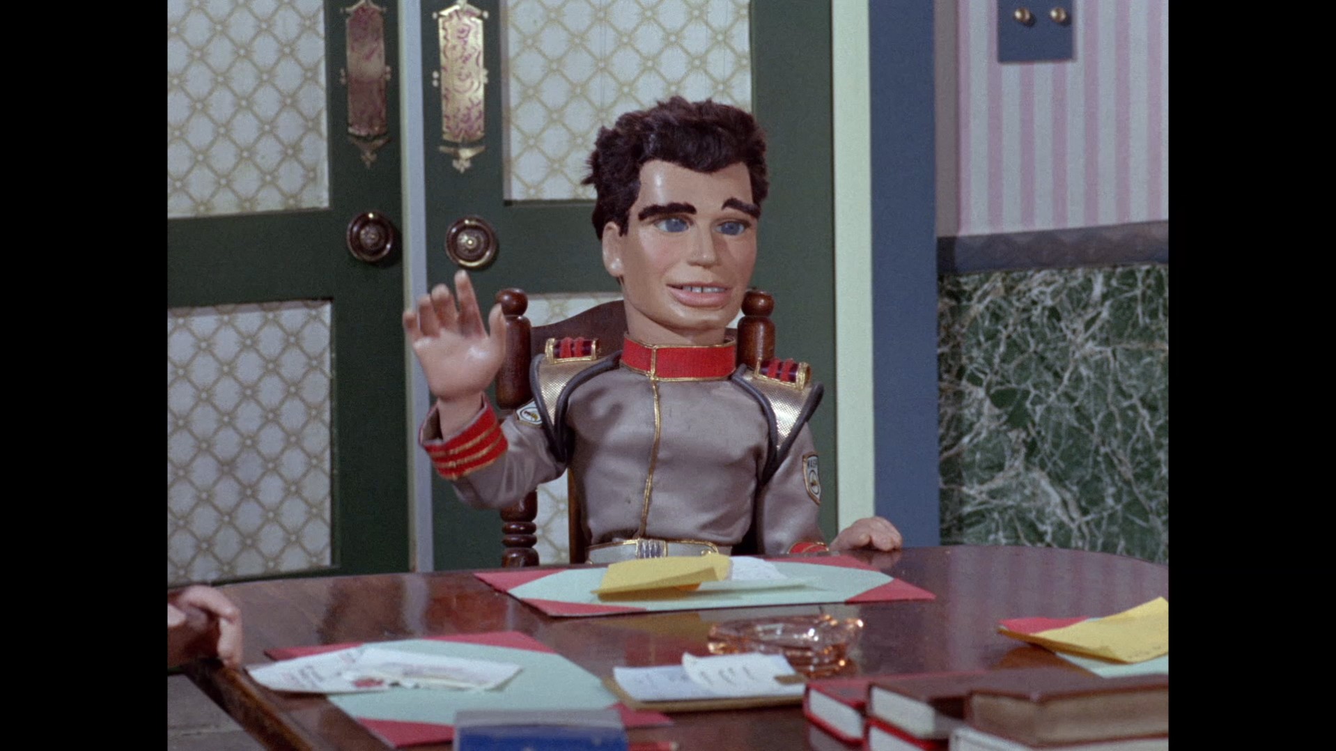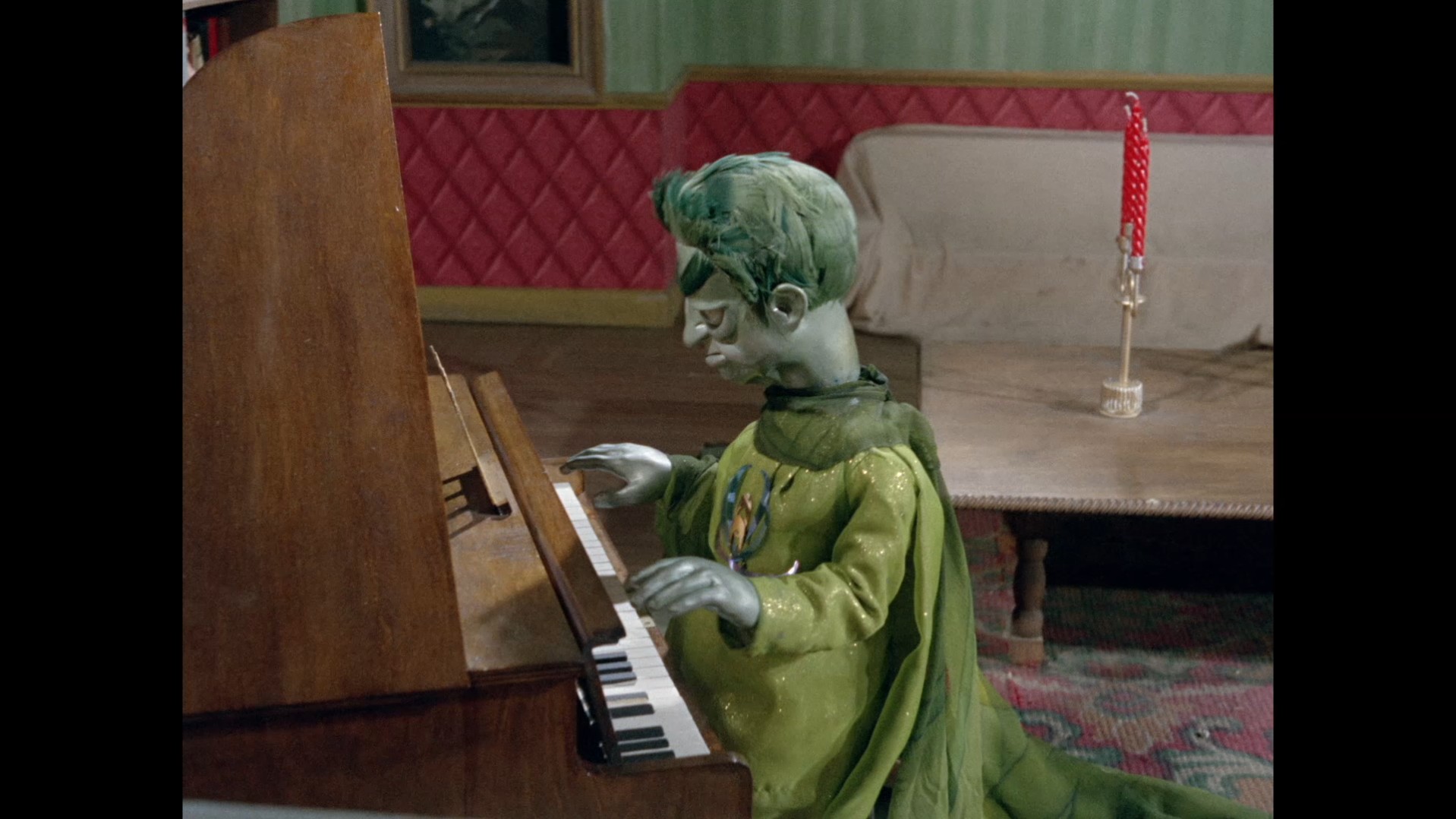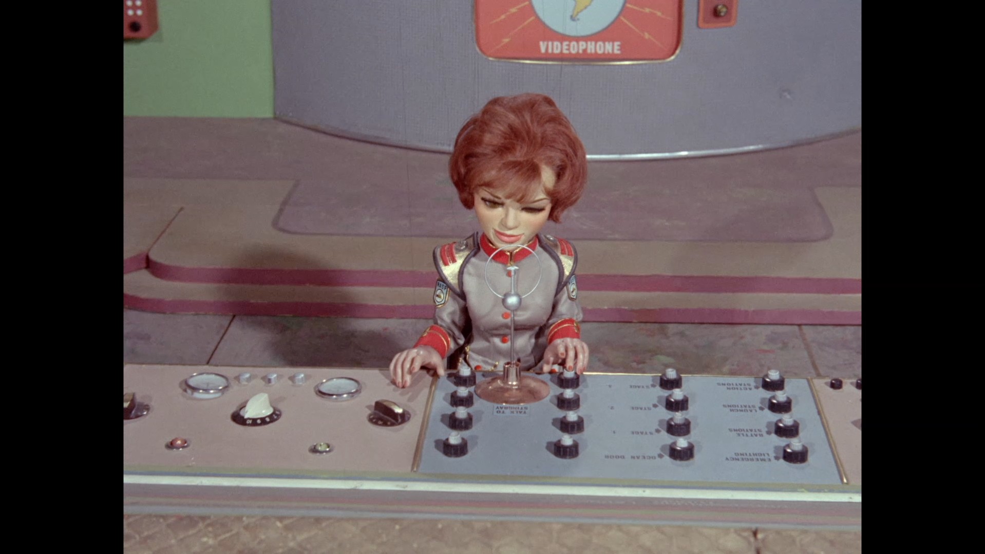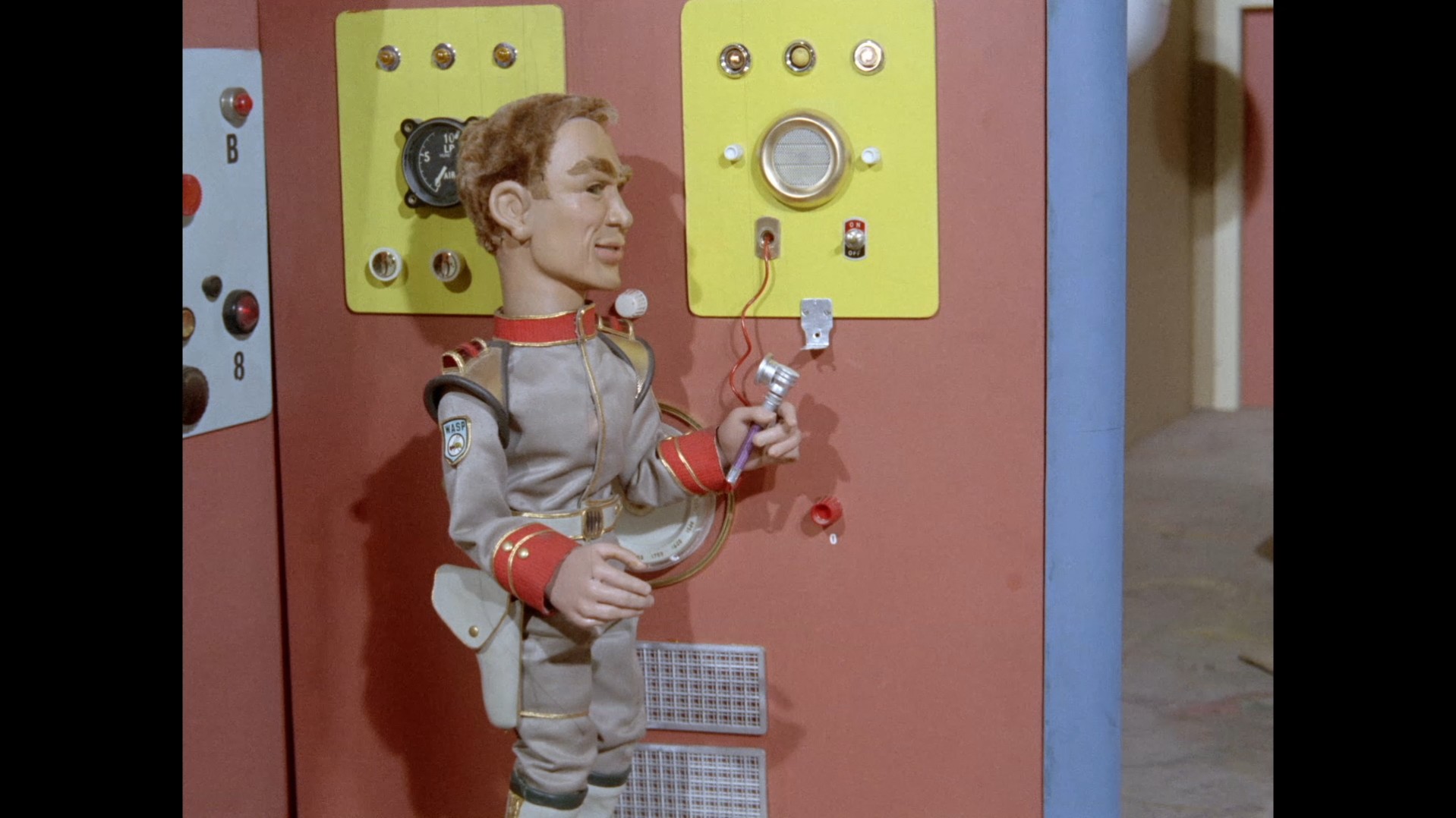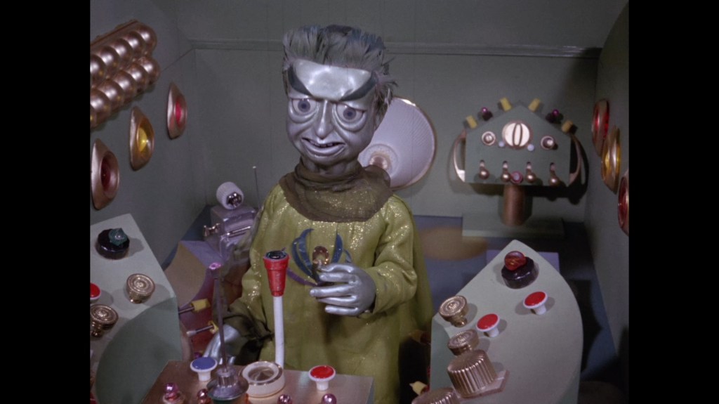 It turns out, our beloved surface agent has treated himself to a new piano. Previously, the corner of the room had been occupied by an old upright piano which dates all the way back to the saloon of Four Feather Falls. This new grand piano prop has a lot in common with the piano seen previously in Plant of Doom (which in turn made appearances in Supercar and Fireball XL5), but has a varnished wood finish rather than being painted. Note all the piano wires which have been painted inside. It’s a beautiful prop, but compare it to the exquisitely detailed concert grand shown in the Joe 90 episode, International Concerto, and you’ll see that this is just one step on the ladder towards the expert craftsmanship the AP Films team were heading towards. I also just love the notion that X20 is the sort of character to indulge himself in such a purchase, and become so engrossed in the fantasy of playing alongside a taped orchestra that he completely ignores a call from his boss. It speaks to the high opinion he has of himself, but also hints that he has talents which would be better suited to a creative, thoughtful, introverted lifestyle, rather than as an audacious master criminal. And best of all, I’ve made all those high and mighty deducations without a word of dialogue being spoken.