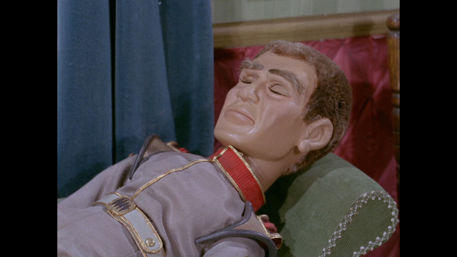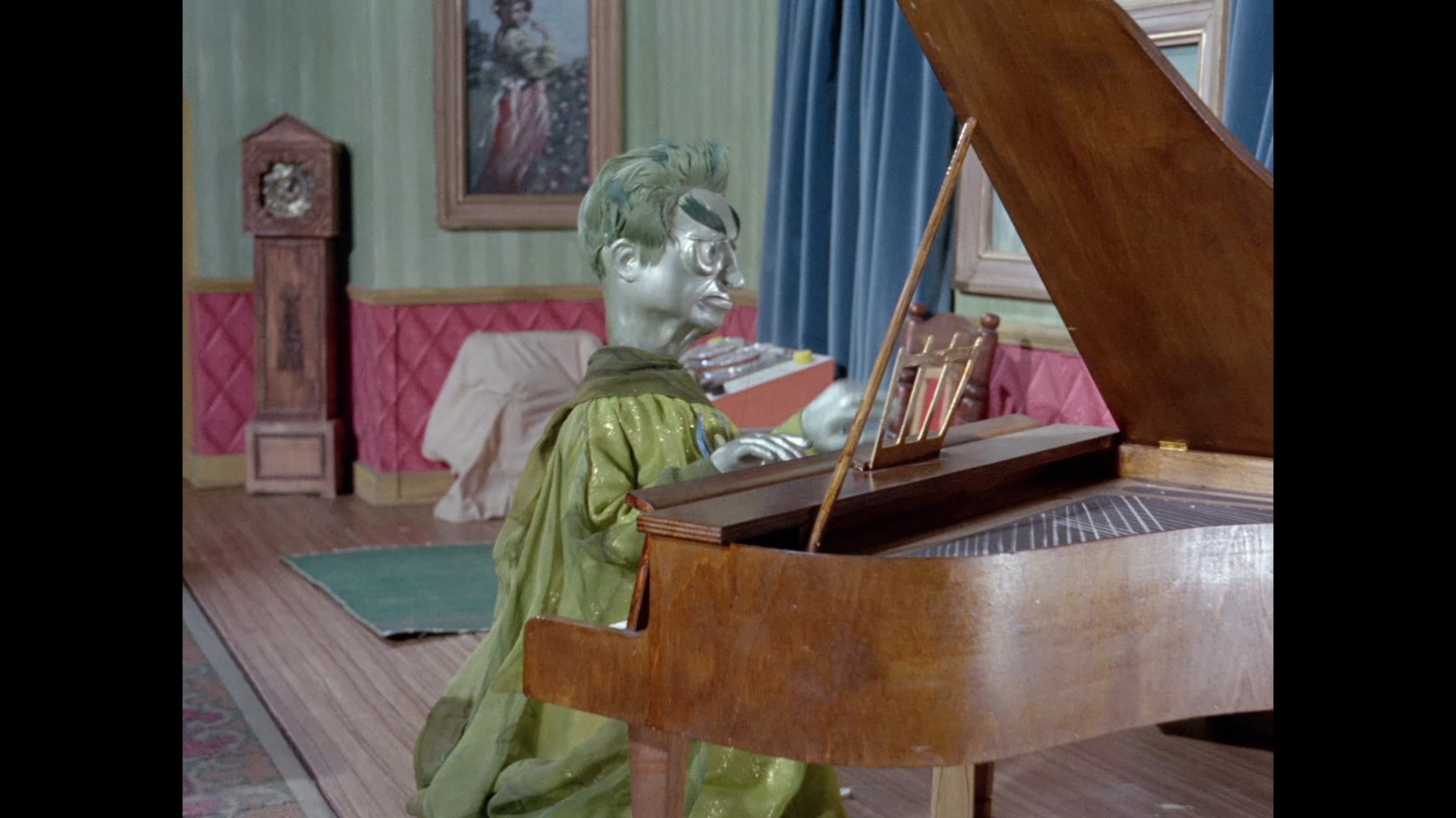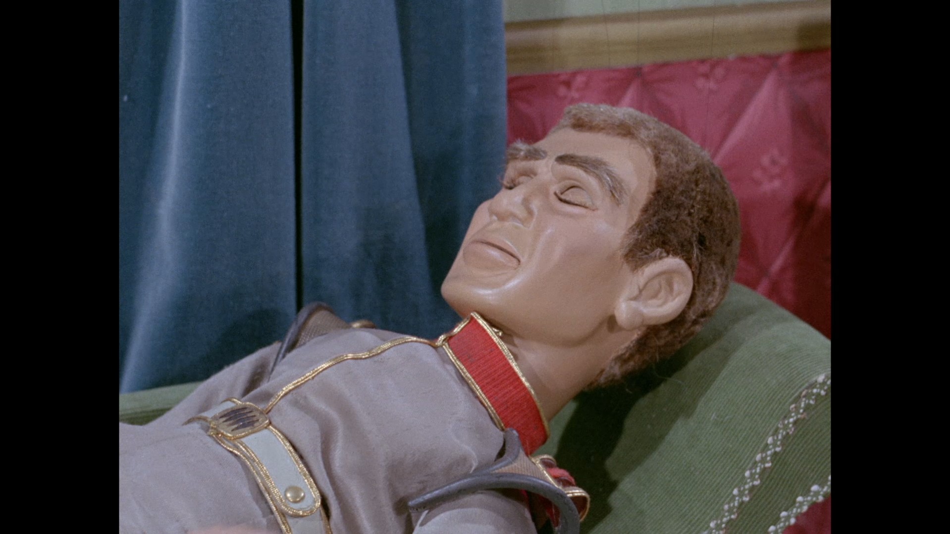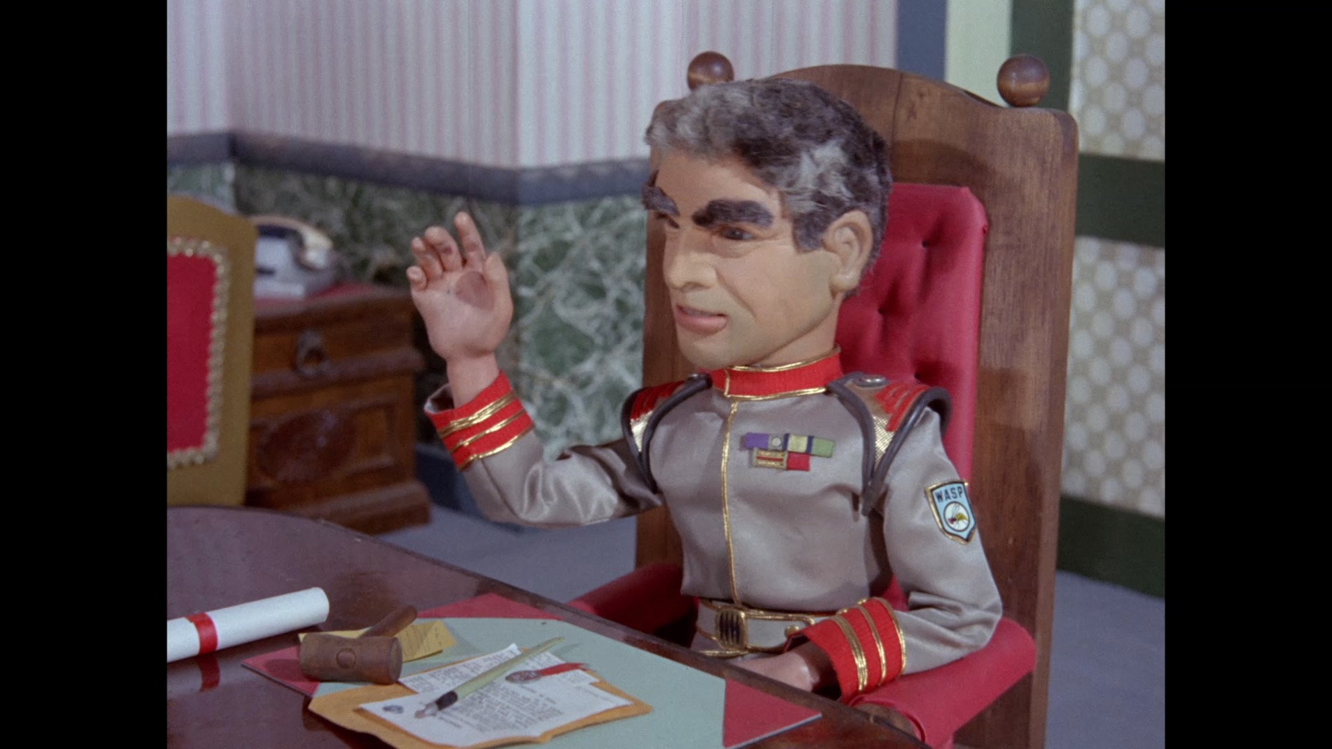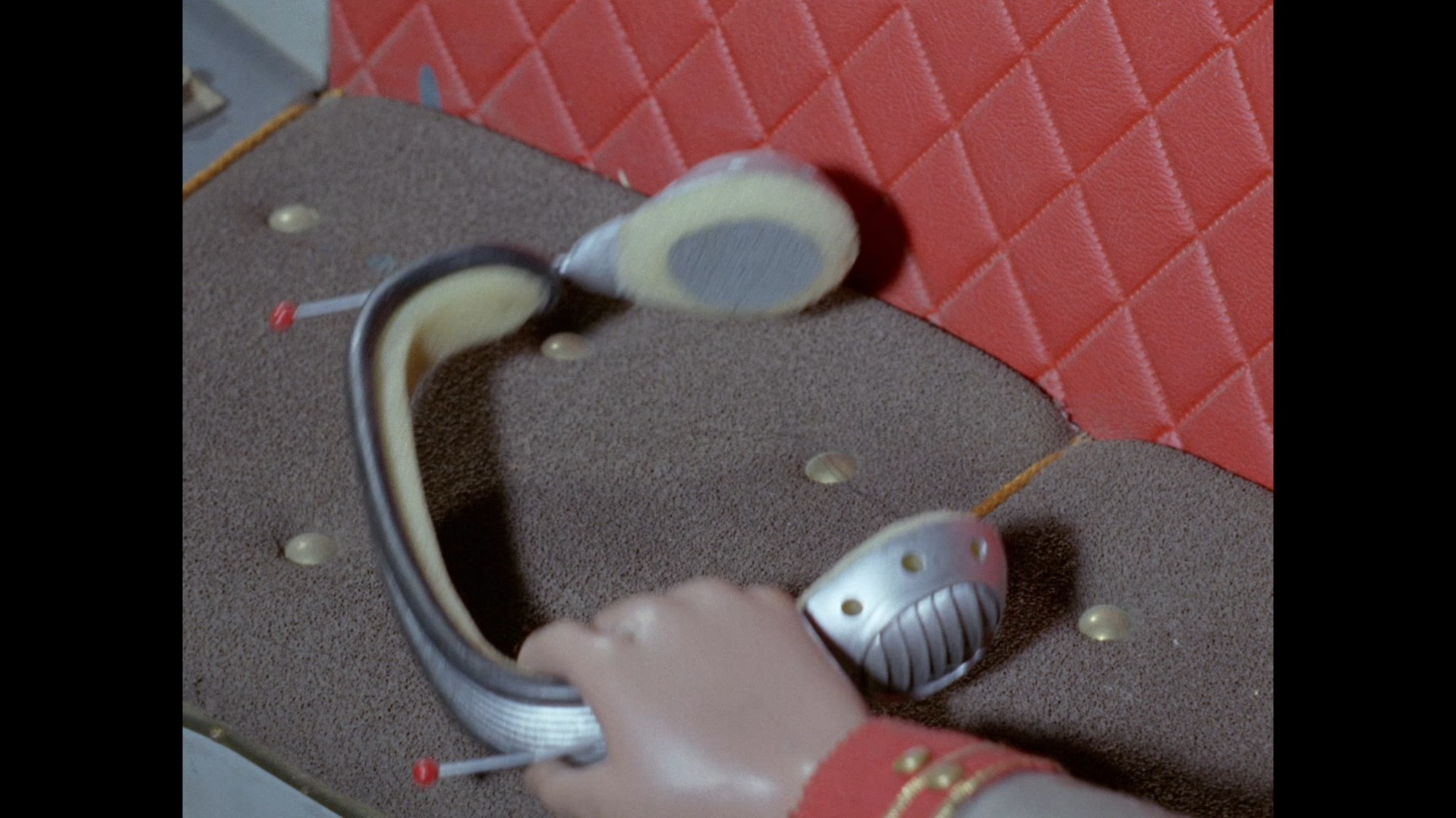 It turns out, our beloved surface agent has treated himself to a new piano. Previously, the corner of the room had been occupied by an old upright piano which dates all the way back to the saloon of Four Feather Falls. This new grand piano prop has a lot in common with the piano seen previously in Plant of Doom (which in turn made appearances in Supercar and Fireball XL5), but has a varnished wood finish rather than being painted. Note all the piano wires which have been painted inside. It’s a beautiful prop, but compare it to the exquisitely detailed concert grand shown in the Joe 90 episode, International Concerto, and you’ll see that this is just one step on the ladder towards the expert craftsmanship the AP Films team were heading towards. I also just love the notion that X20 is the sort of character to indulge himself in such a purchase, and become so engrossed in the fantasy of playing alongside a taped orchestra that he completely ignores a call from his boss. It speaks to the high opinion he has of himself, but also hints that he has talents which would be better suited to a creative, thoughtful, introverted lifestyle, rather than as an audacious master criminal. And best of all, I’ve made all those high and mighty deducations without a word of dialogue being spoken.