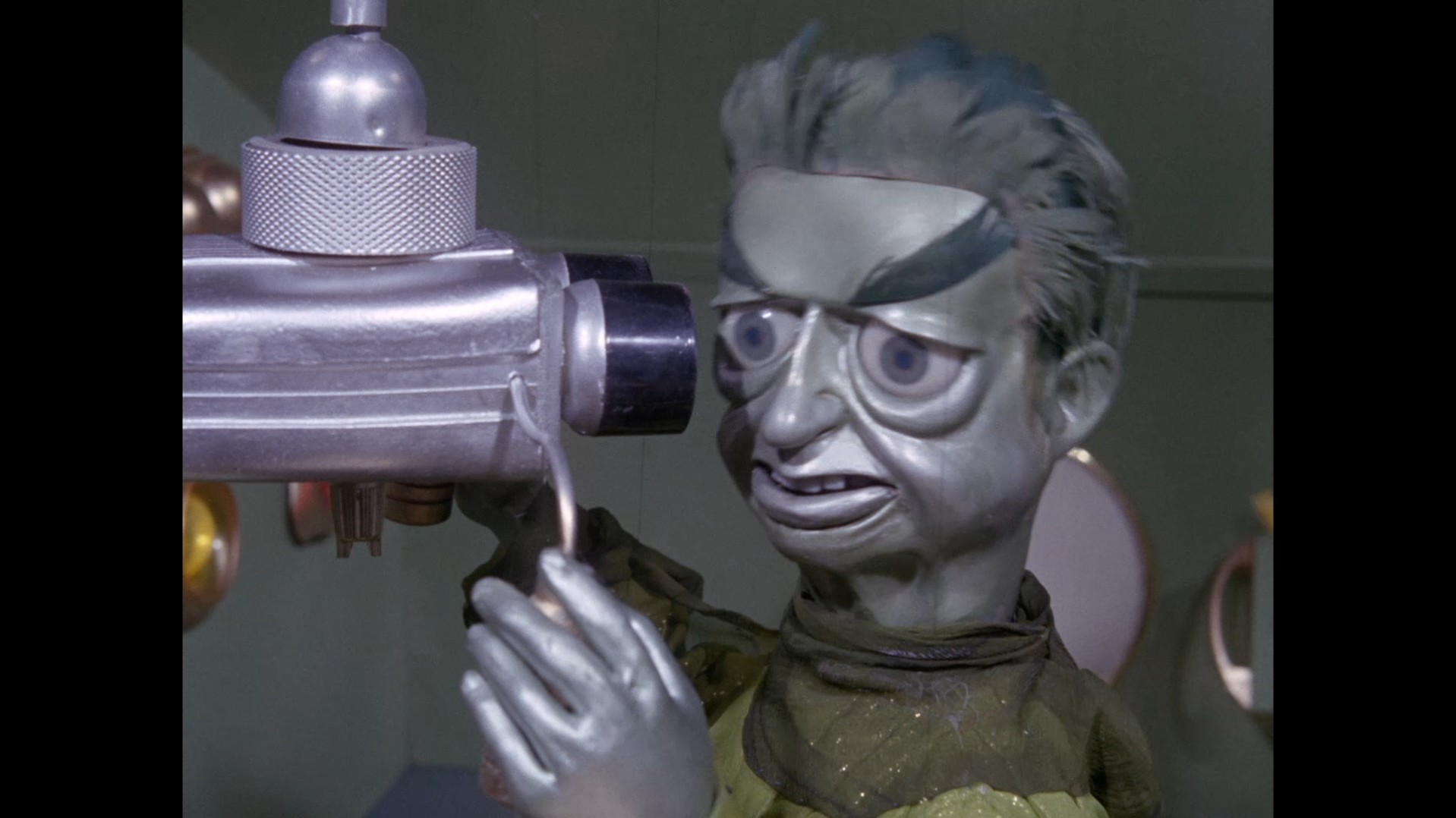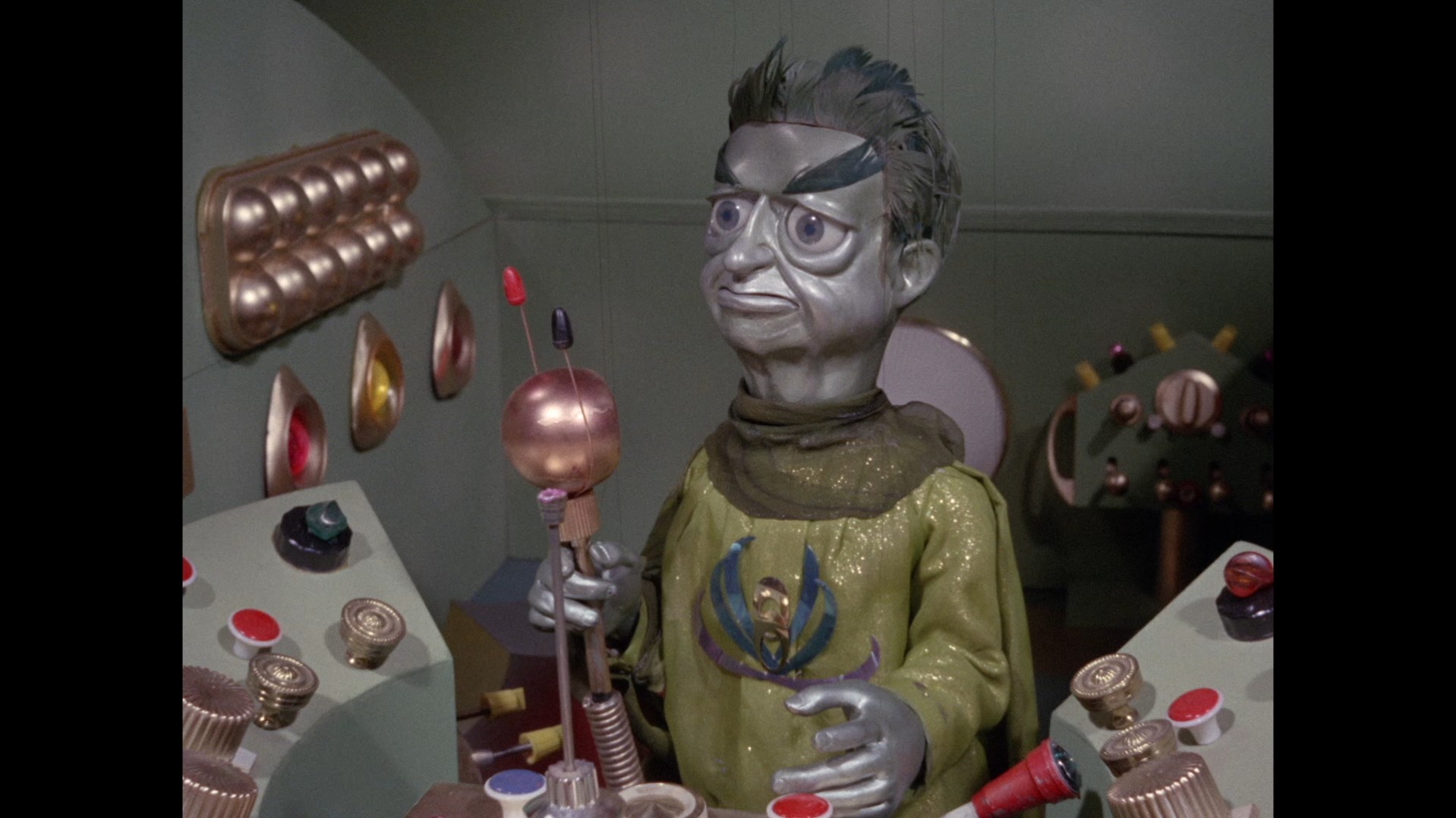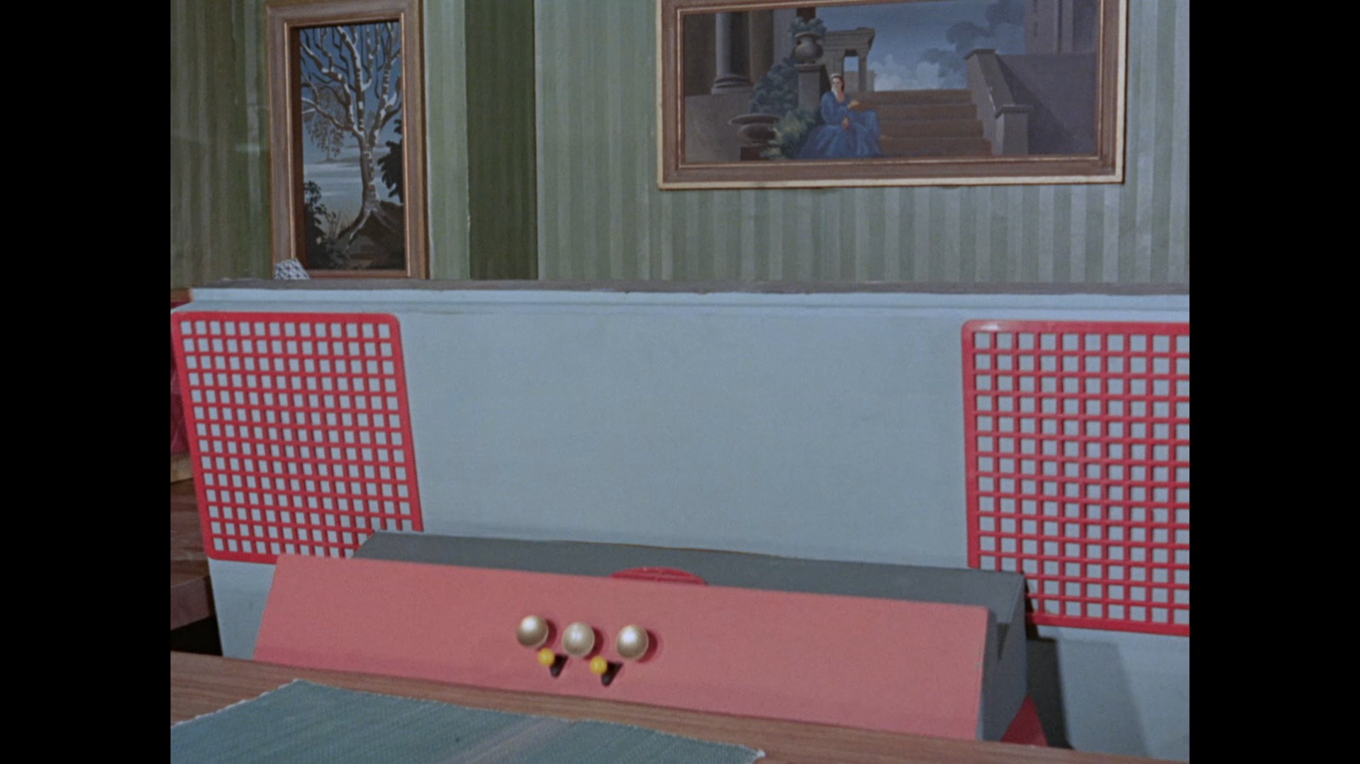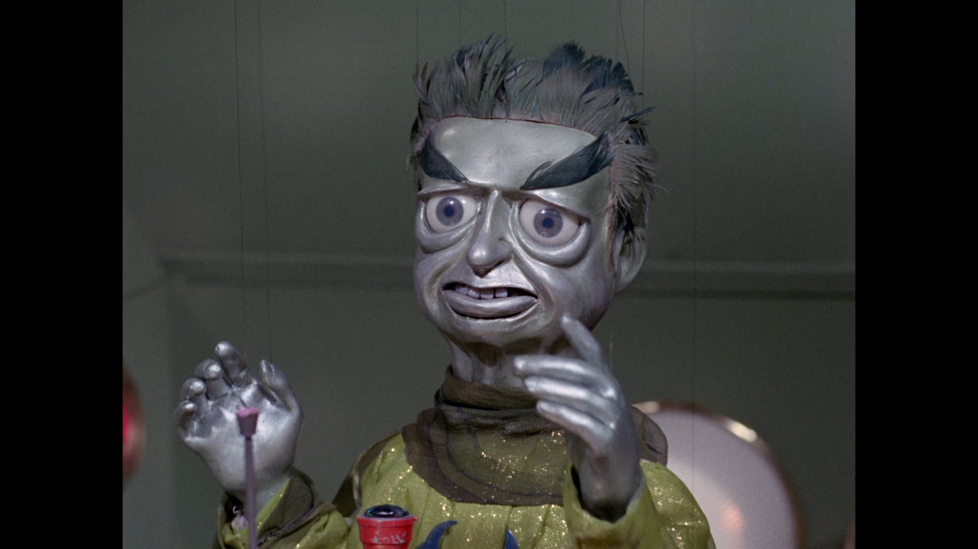 It turns out, our beloved surface agent has treated himself to a new piano. Previously, the corner of the room had been occupied by an old upright piano which dates all the way back to the saloon of Four Feather Falls. This new grand piano prop has a lot in common with the piano seen previously in Plant of Doom (which in turn made appearances in Supercar and Fireball XL5), but has a varnished wood finish rather than being painted. Note all the piano wires which have been painted inside. It’s a beautiful prop, but compare it to the exquisitely detailed concert grand shown in the Joe 90 episode, International Concerto, and you’ll see that this is just one step on the ladder towards the expert craftsmanship the AP Films team were heading towards. I also just love the notion that X20 is the sort of character to indulge himself in such a purchase, and become so engrossed in the fantasy of playing alongside a taped orchestra that he completely ignores a call from his boss. It speaks to the high opinion he has of himself, but also hints that he has talents which would be better suited to a creative, thoughtful, introverted lifestyle, rather than as an audacious master criminal. And best of all, I’ve made all those high and mighty deducations without a word of dialogue being spoken.