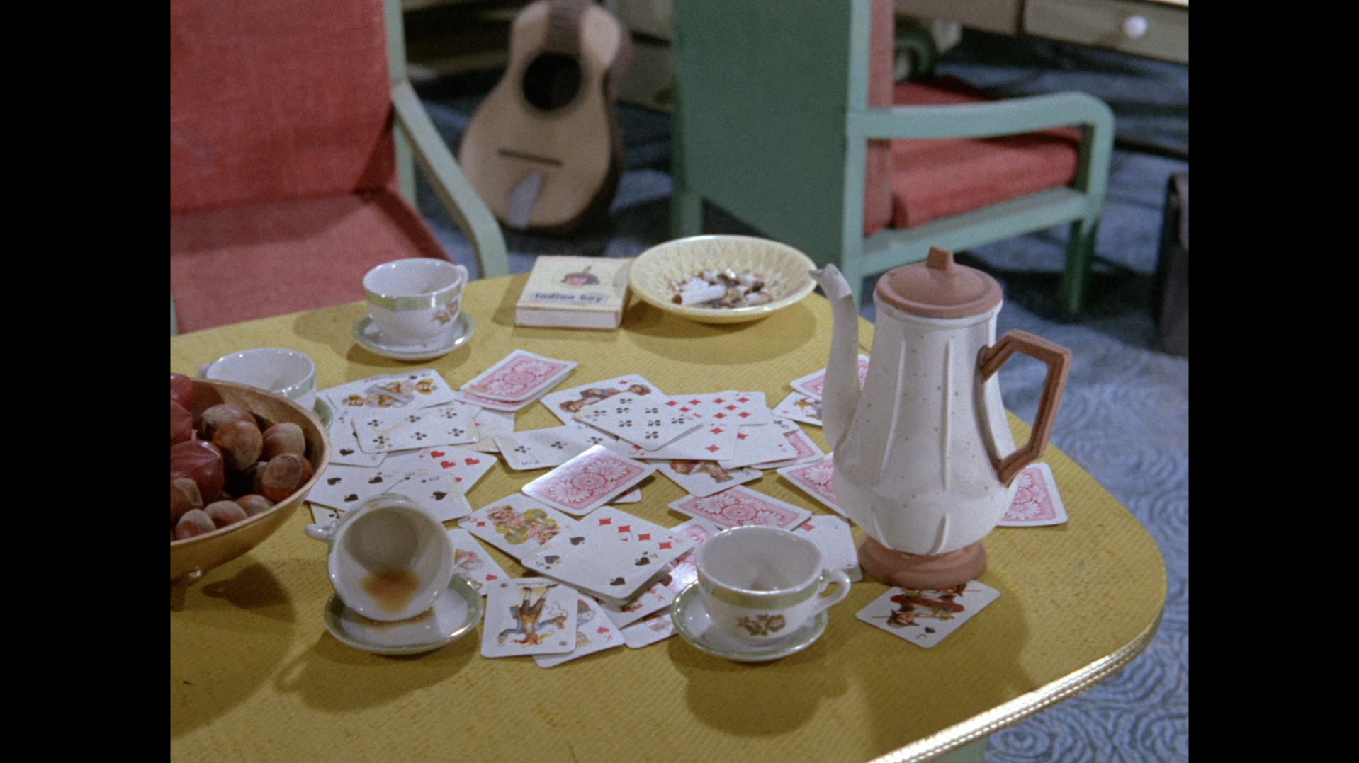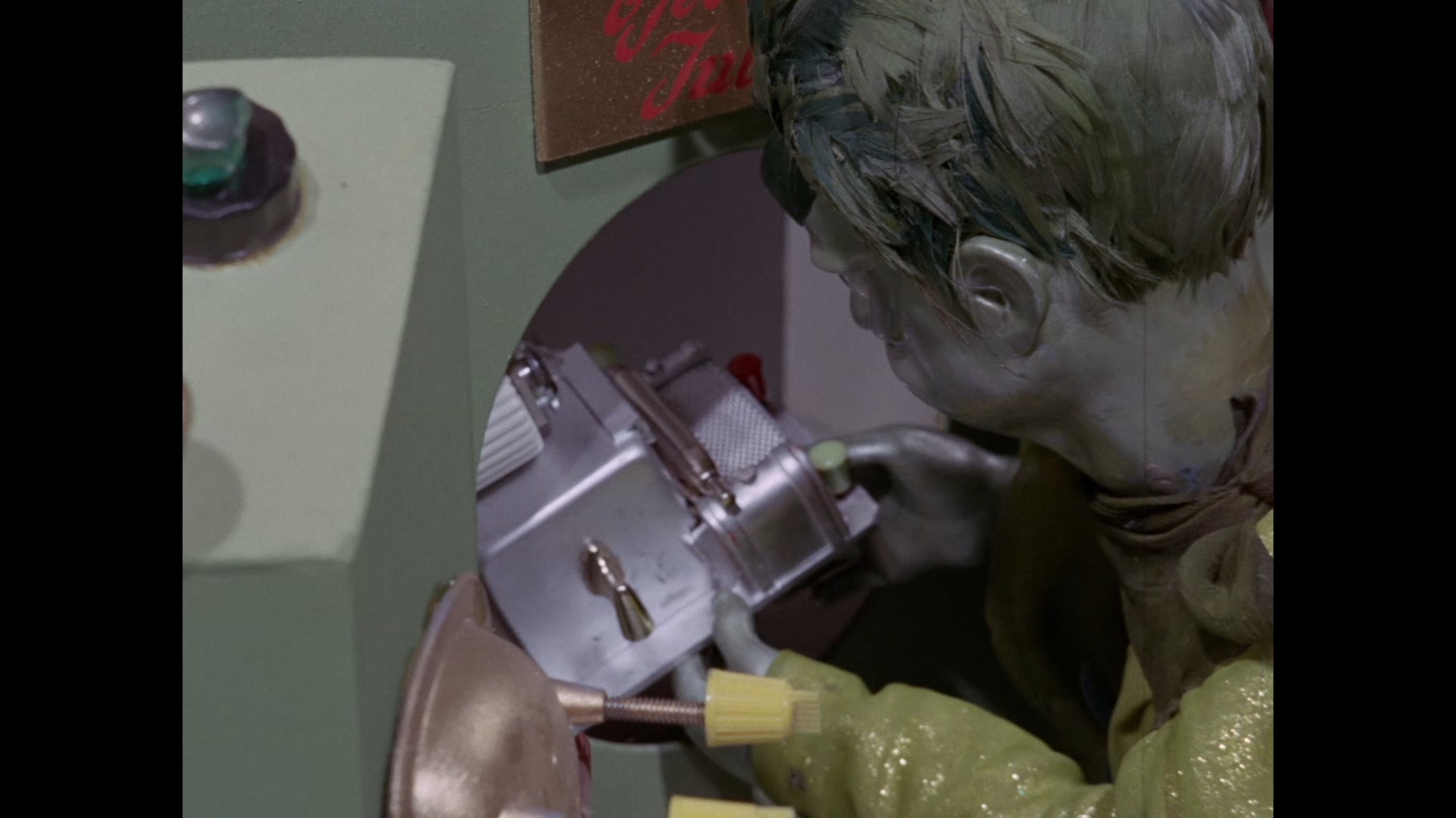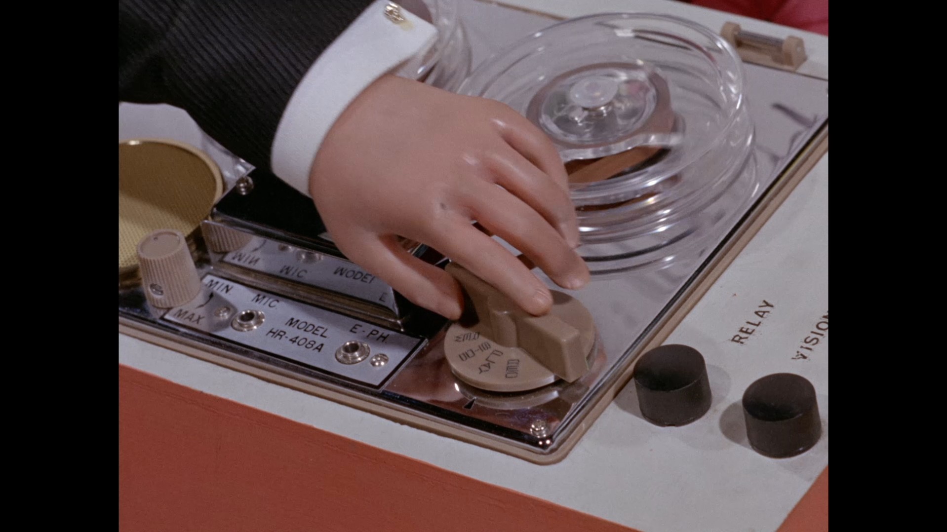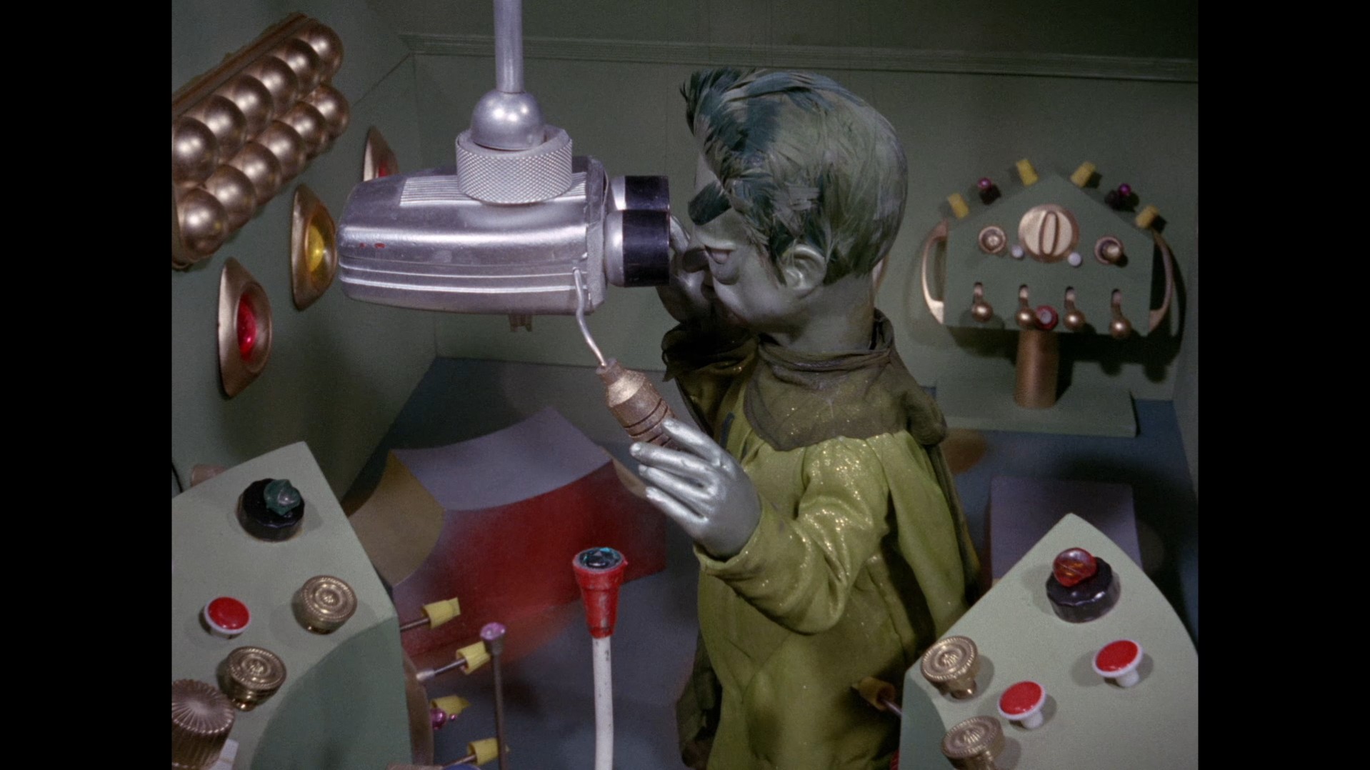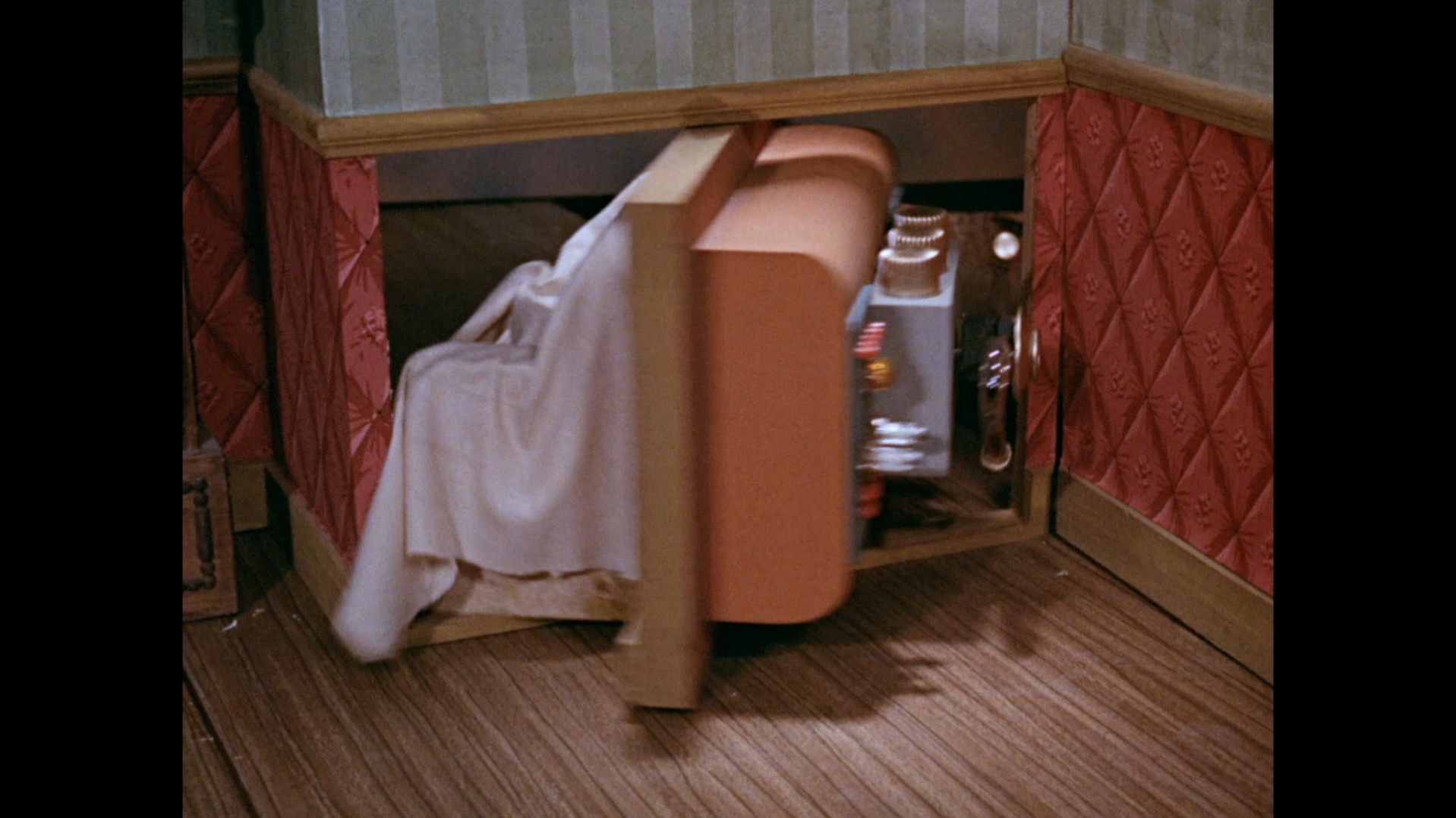 It turns out, our beloved surface agent has treated himself to a new piano. Previously, the corner of the room had been occupied by an old upright piano which dates all the way back to the saloon of Four Feather Falls. This new grand piano prop has a lot in common with the piano seen previously in Plant of Doom (which in turn made appearances in Supercar and Fireball XL5), but has a varnished wood finish rather than being painted. Note all the piano wires which have been painted inside. It’s a beautiful prop, but compare it to the exquisitely detailed concert grand shown in the Joe 90 episode, International Concerto, and you’ll see that this is just one step on the ladder towards the expert craftsmanship the AP Films team were heading towards. I also just love the notion that X20 is the sort of character to indulge himself in such a purchase, and become so engrossed in the fantasy of playing alongside a taped orchestra that he completely ignores a call from his boss. It speaks to the high opinion he has of himself, but also hints that he has talents which would be better suited to a creative, thoughtful, introverted lifestyle, rather than as an audacious master criminal. And best of all, I’ve made all those high and mighty deducations without a word of dialogue being spoken.
