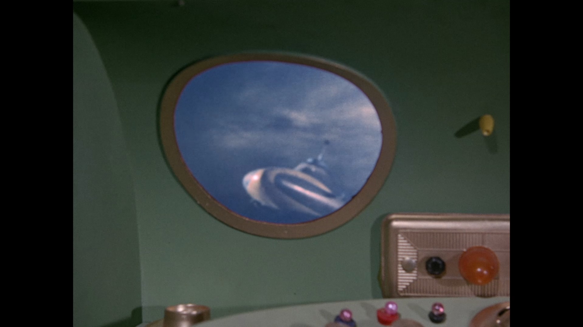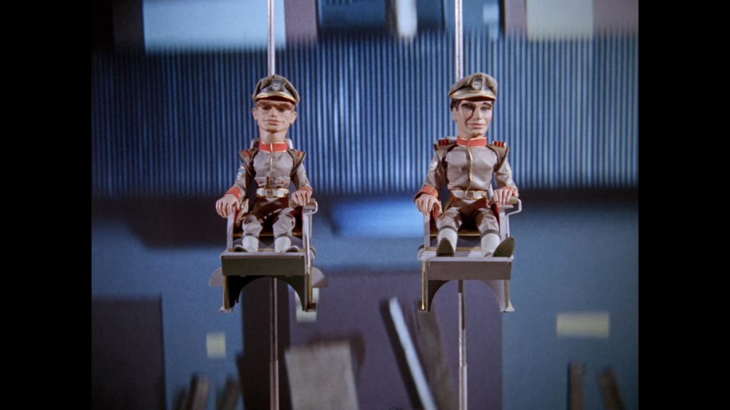 All Troy and Phones can do is surface through the thick smoke and watch in horror. Back projection is used to show the view through the cabin windows. Phones is speechless, no doubt already realising that it was his false sounding which drew Stingray away from its duty. Popping on the characters’ frowner heads probably would have been appropriate at this point – Phones’ default face in particular is a little too smiley for a disaster of this magnitude.