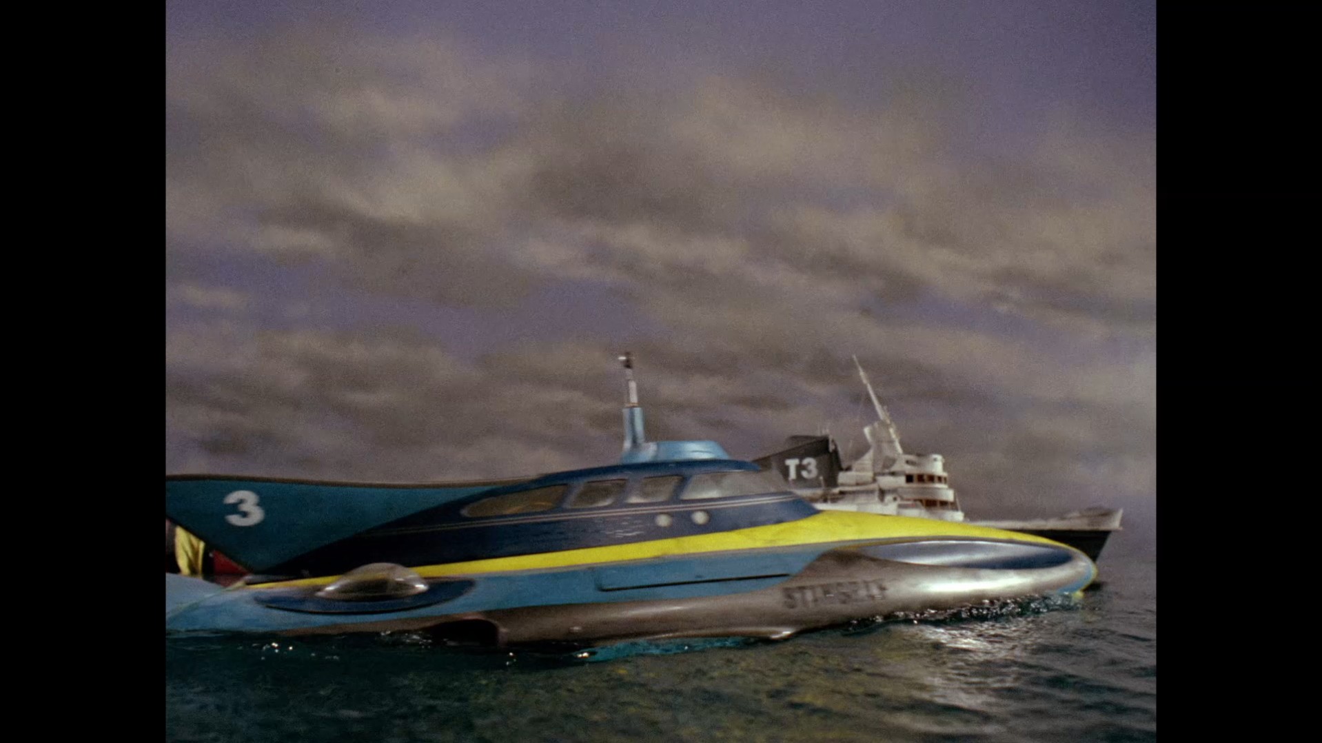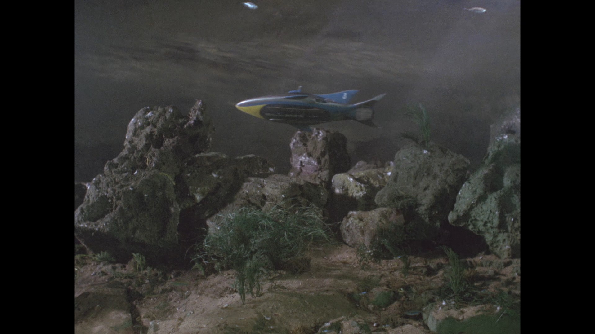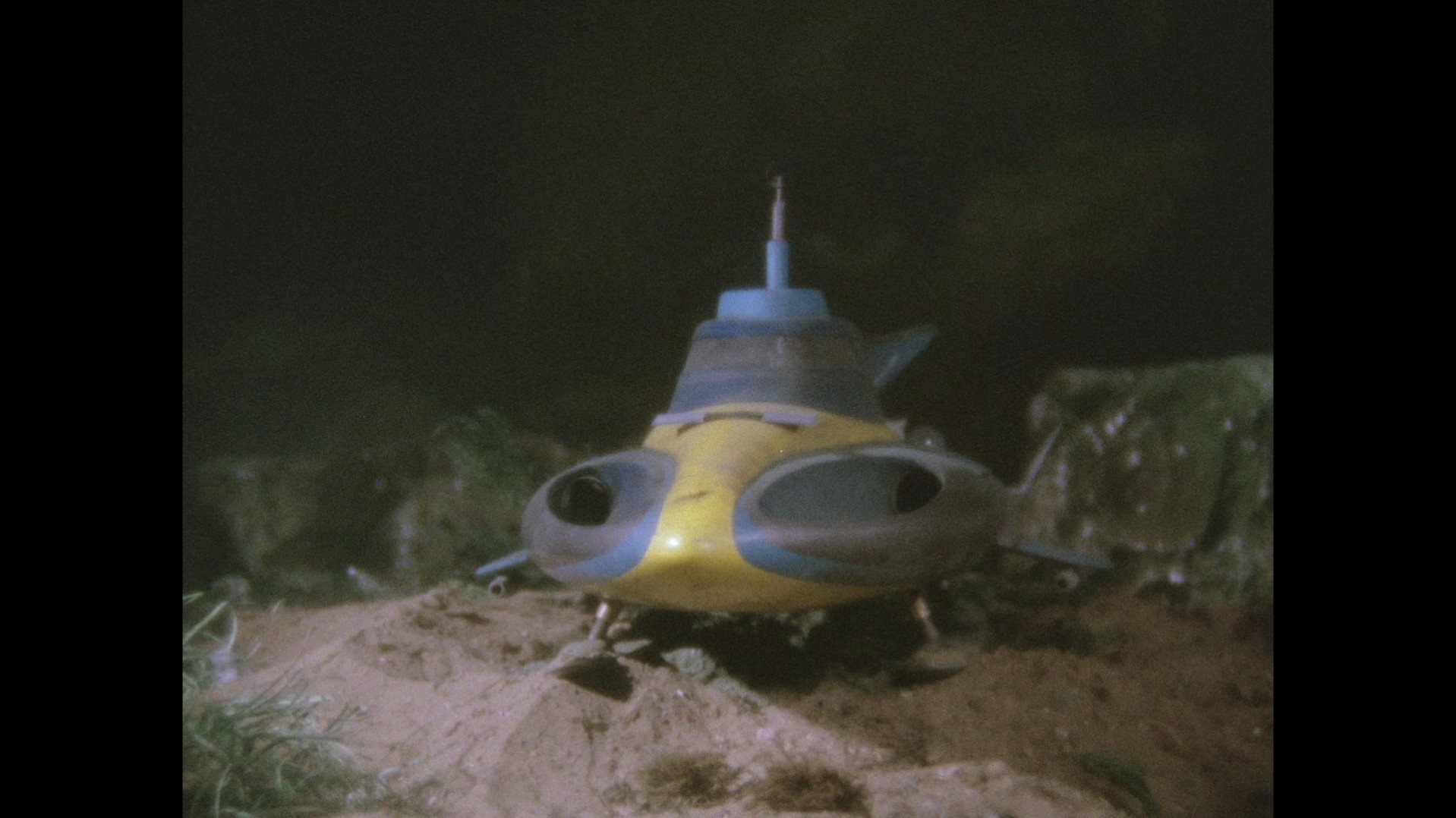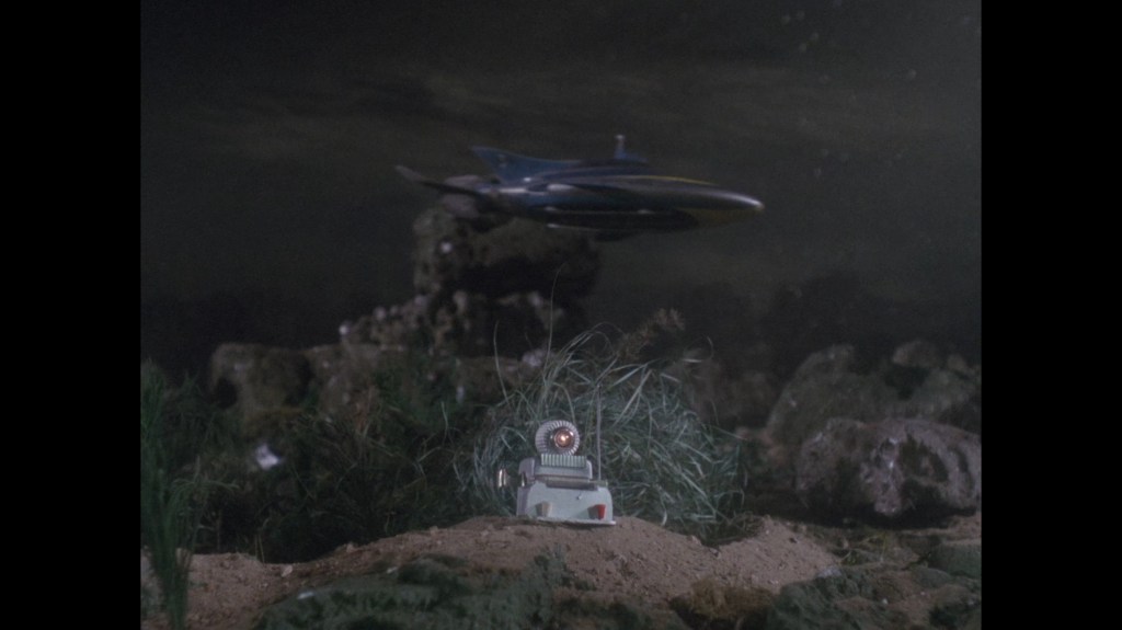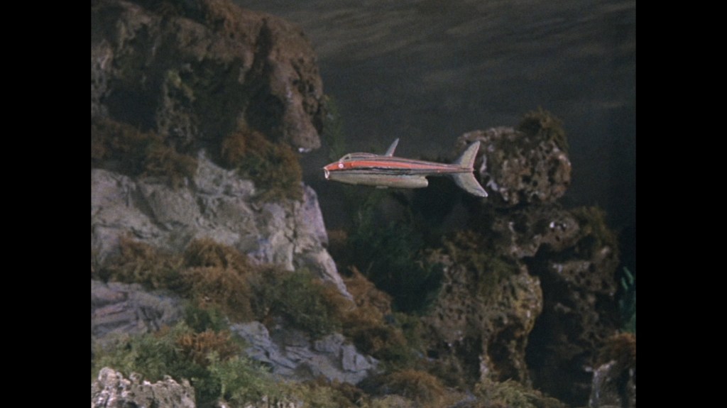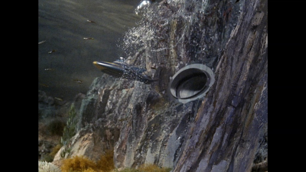 Stingray submerges but finds nothing. This shot of the sonar decoy in the foreground and Stingray in the background does a marvellous job of playing around with scale and perspective.