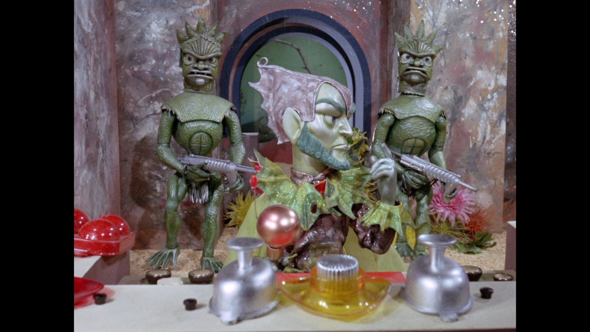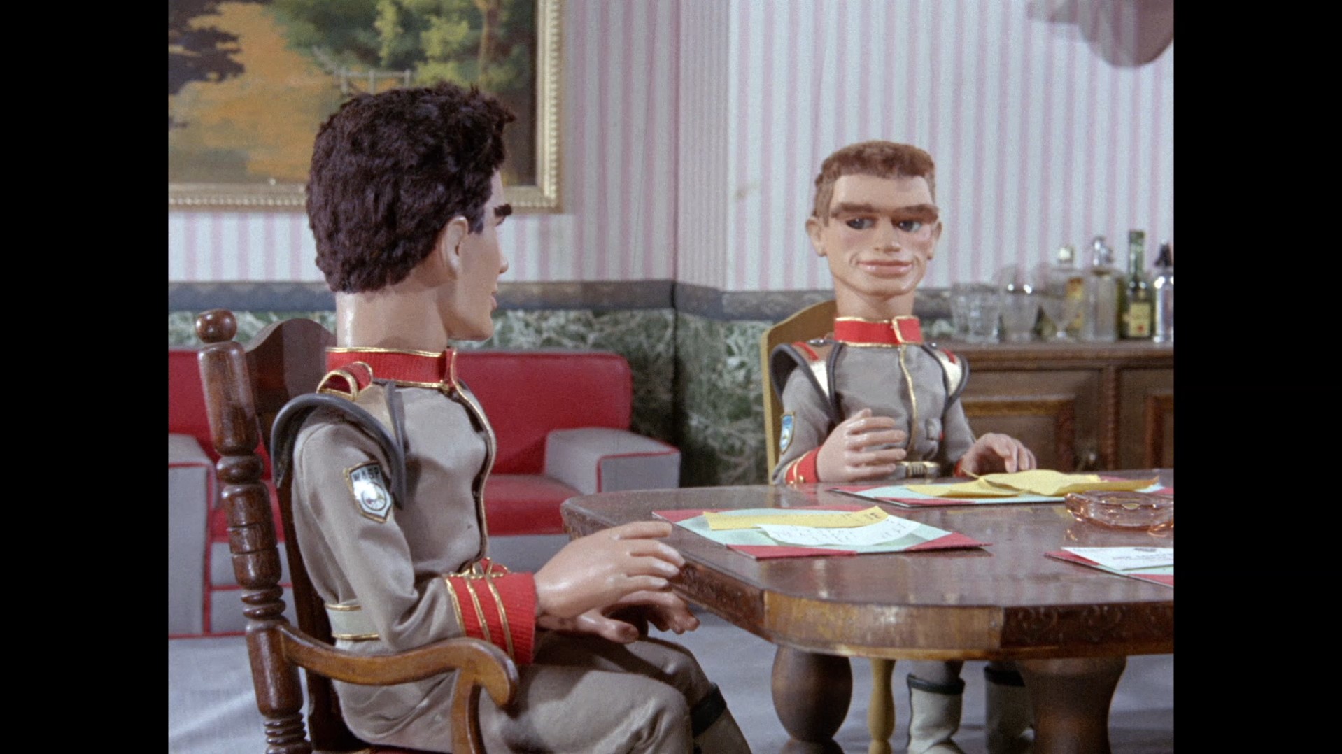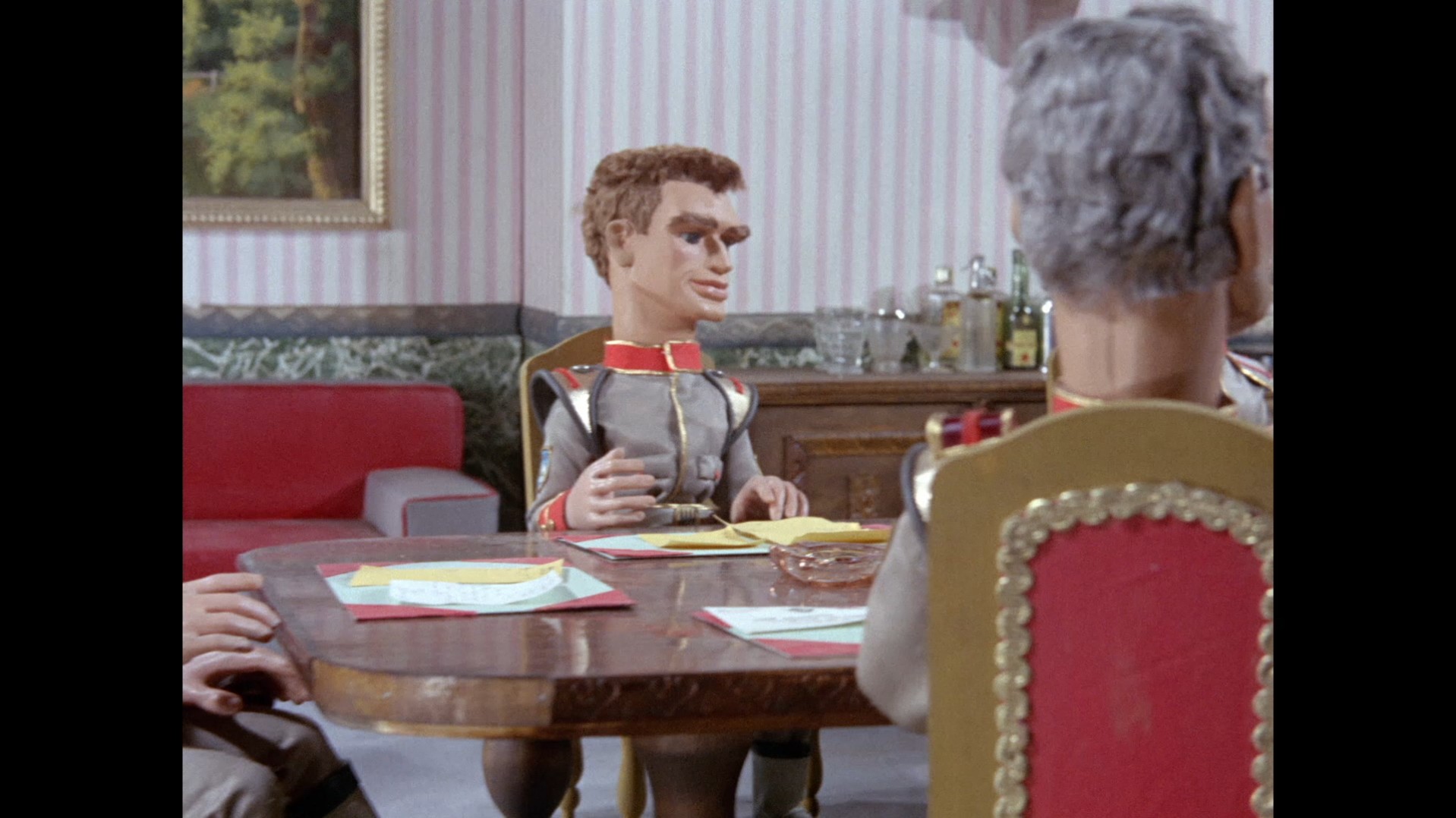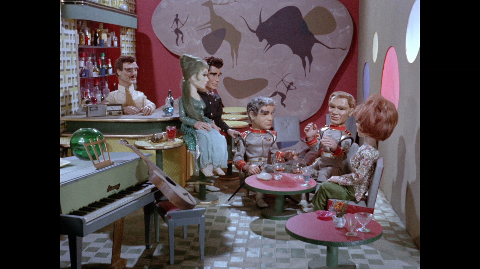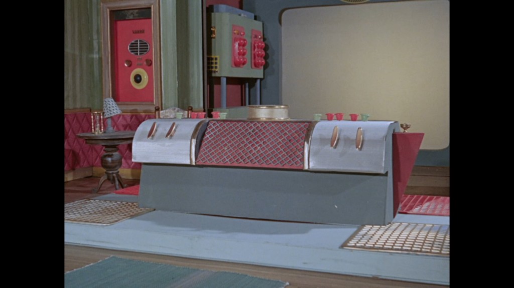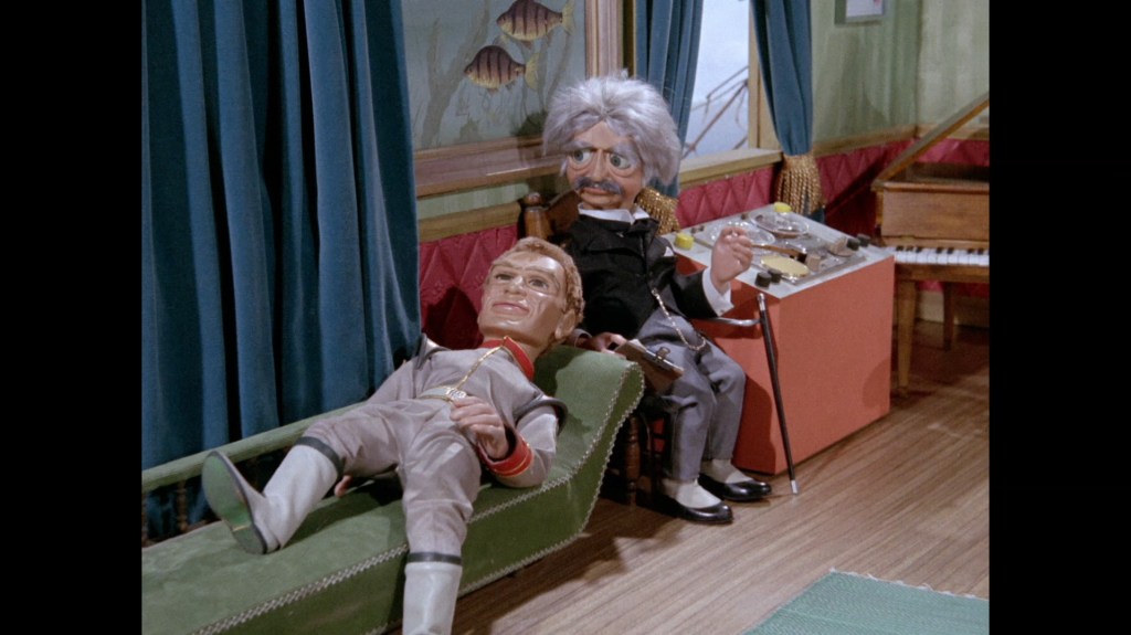We’re back at the Blue Lagoon, the gang’s favored night spot after the Shores got fed up of hosting dinner parties every evening. This time, Chick Kingsland from Secret of the Giant Oyster, who was also a patron of the bar in Stand By For Action, is serving drinks. Marina makes her first and only appearance in the episode. Has she been sat in the bar the entire time? In the foreground is the original grand piano prop which was used by Atlanta in Plant of Doom as well as Fireball XL5 and Supercar. Everyone is celebrating Phones’ return to duty. Note that Shore is holding a walking stick and his chair is not in the room, perhaps suggesting he hasn’t entirely lost the use of his legs.