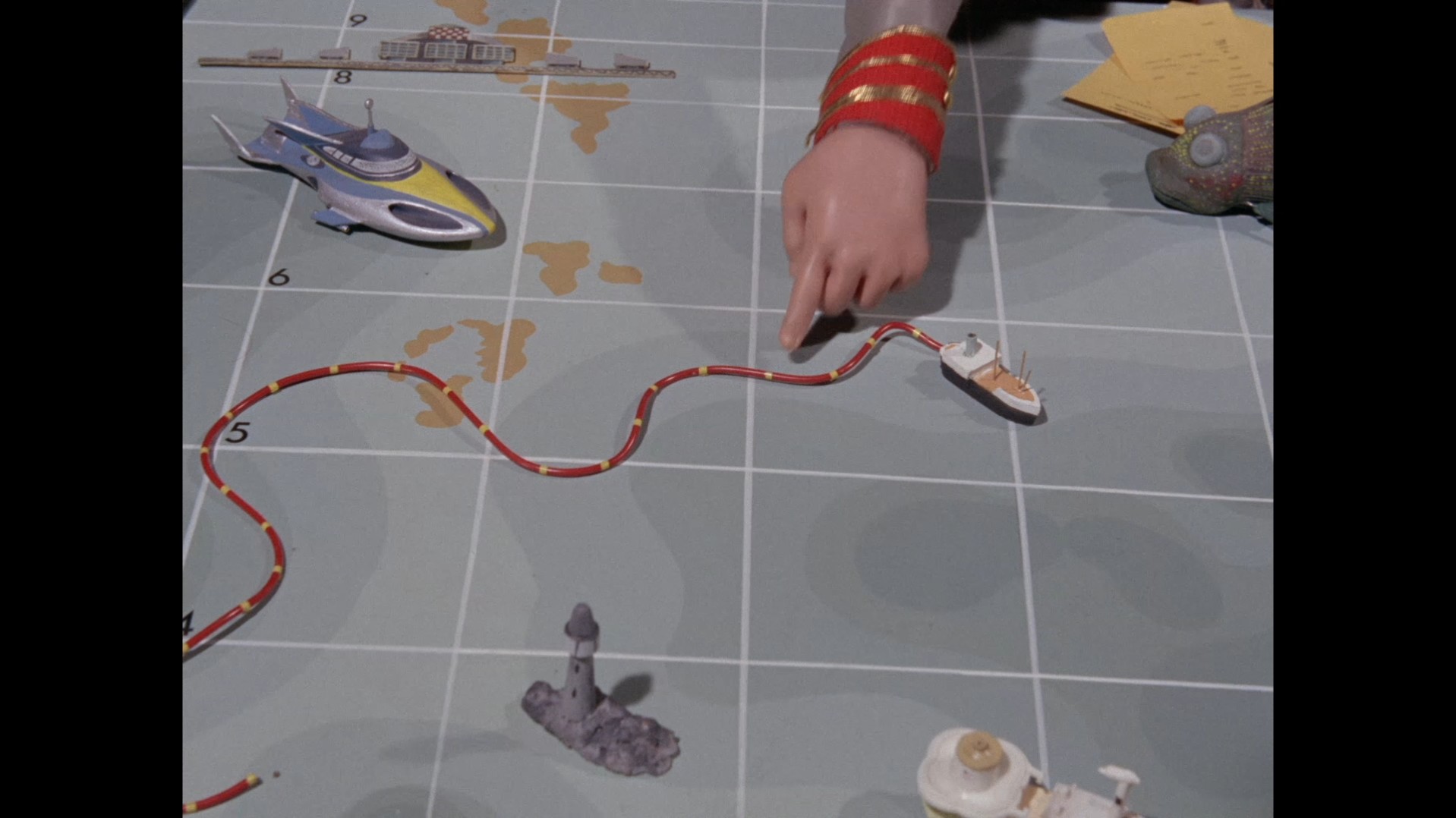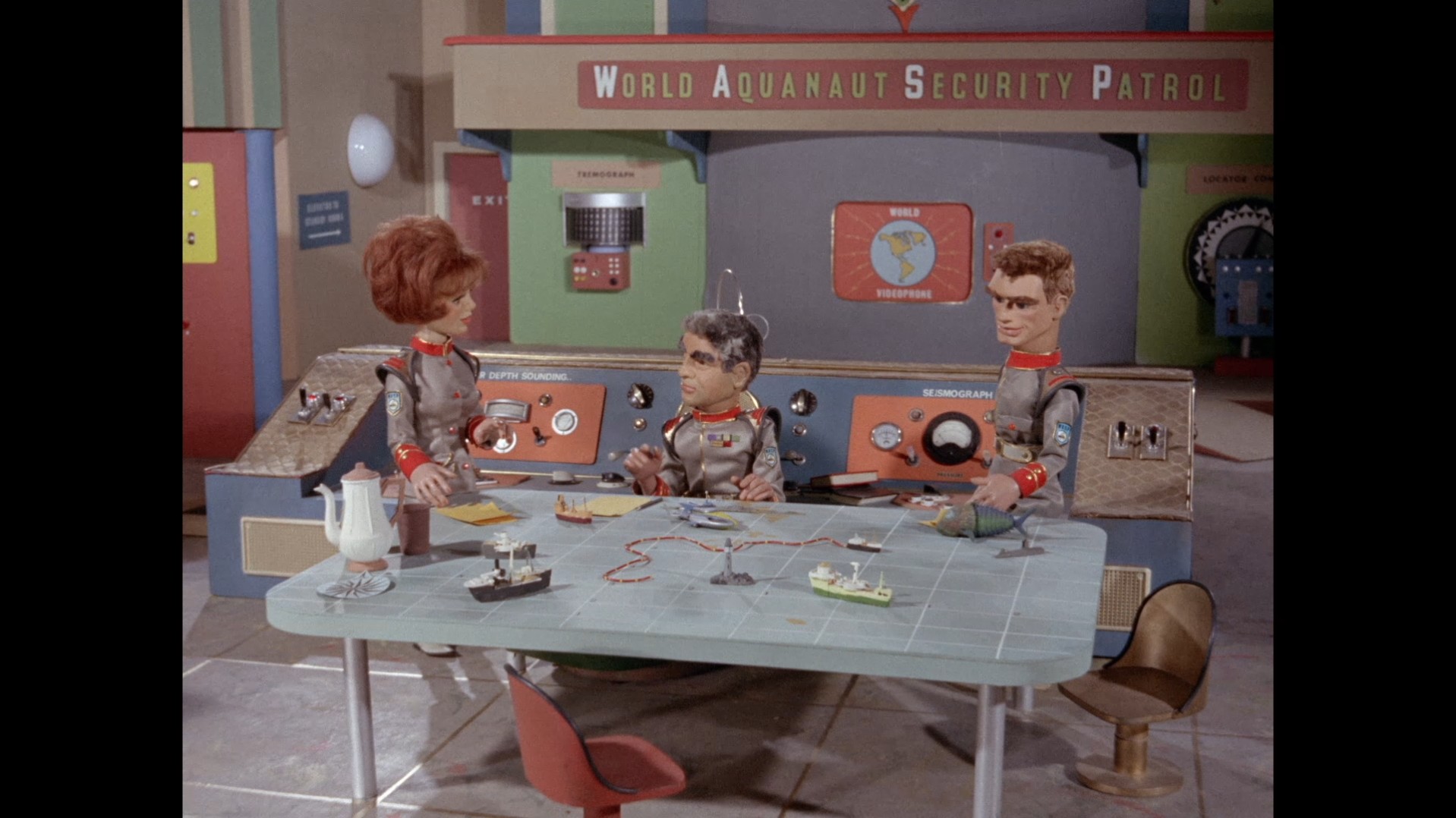 Meanwhile, at Marineville, it’s time for the WASPs to undertake another mission. Commander Shore has pulled out his big table map to explain that Stingray will be escorting a crude oil transporter. There are plenty of adorable little models of various ships which Shore probably loves to play with in the bath when nobody’s looking. He’s also borrowed the little models of Stingray and the Mechanical Fish which were seen on Titan’s big table map previously in The Master Plan. I’m not entirely sure what the Mechanical Fish is doing there but let’s assume they were planning for trouble. Shore explains that just one small ship is being used to transport millions of gallons of oil because it will be towing a long tube made of a new material. We’ll have a history lesson in a few moments on the transportation of oil by sea, don’t worry.