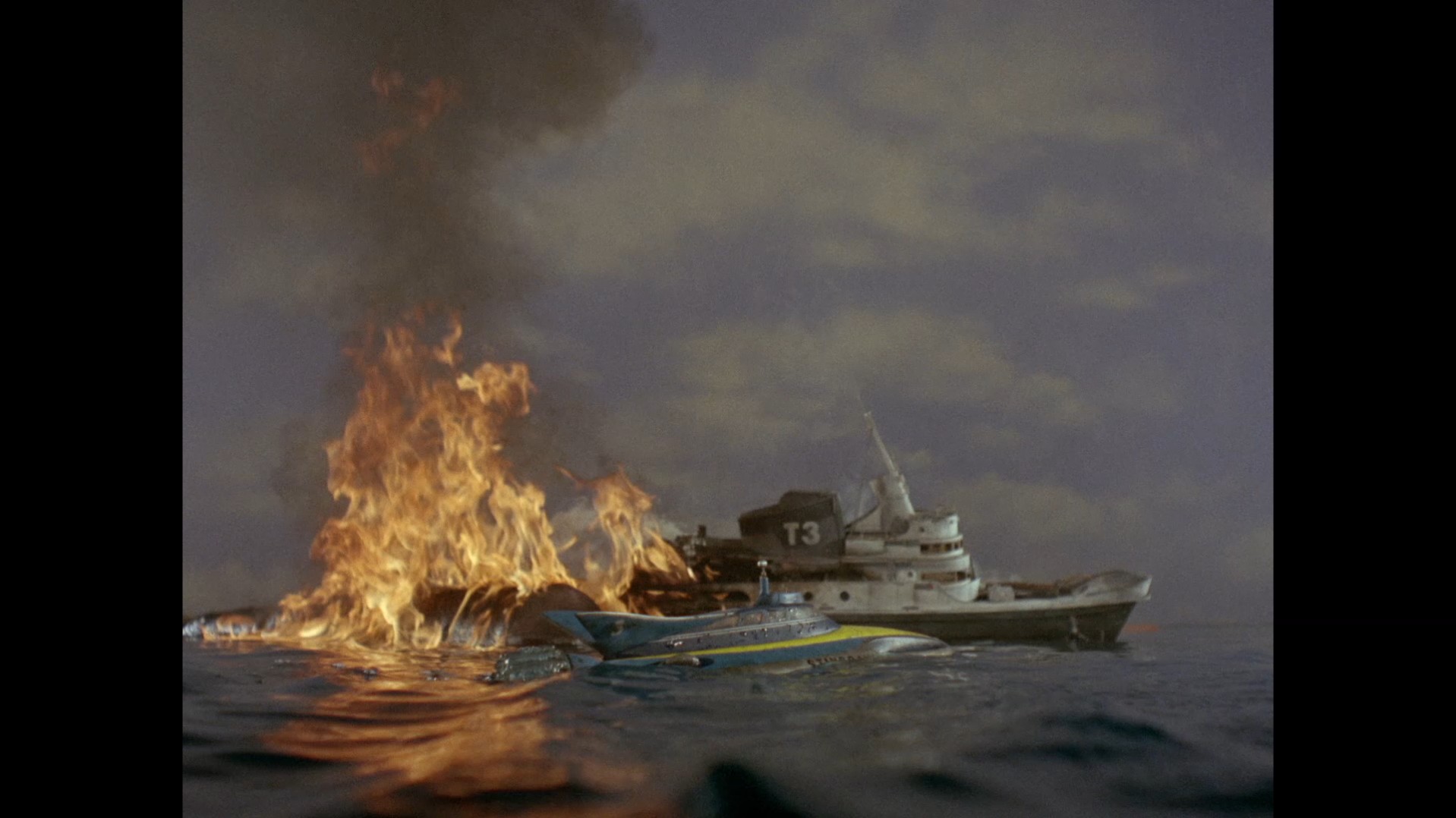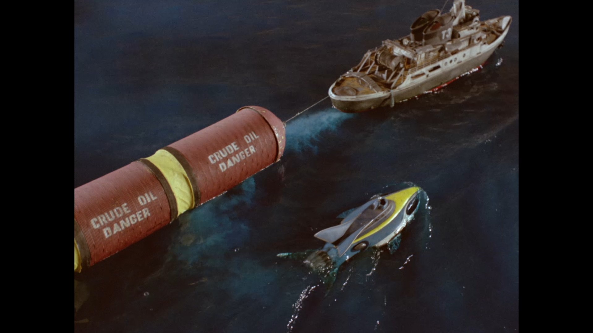 We don’t see it on-screen, but dialogue suggests that the crew of the tow vessel are abandoning ship to be picked up by Stingray. It might have been nice and dramatic to see the people dashing about, dodging the oil and fire raining down upon them, but the fire on the model set is plenty to get across how bad things are. For the grand finale, the towing vessel itself blows up spectacularly, with the entire ship somersaulting through the air. I think it’s fair to say the tub is a write-off.