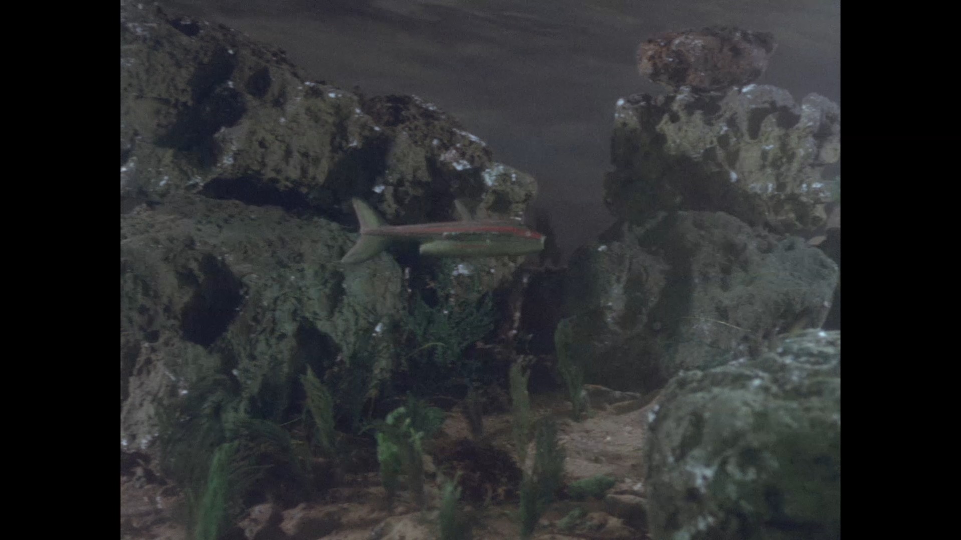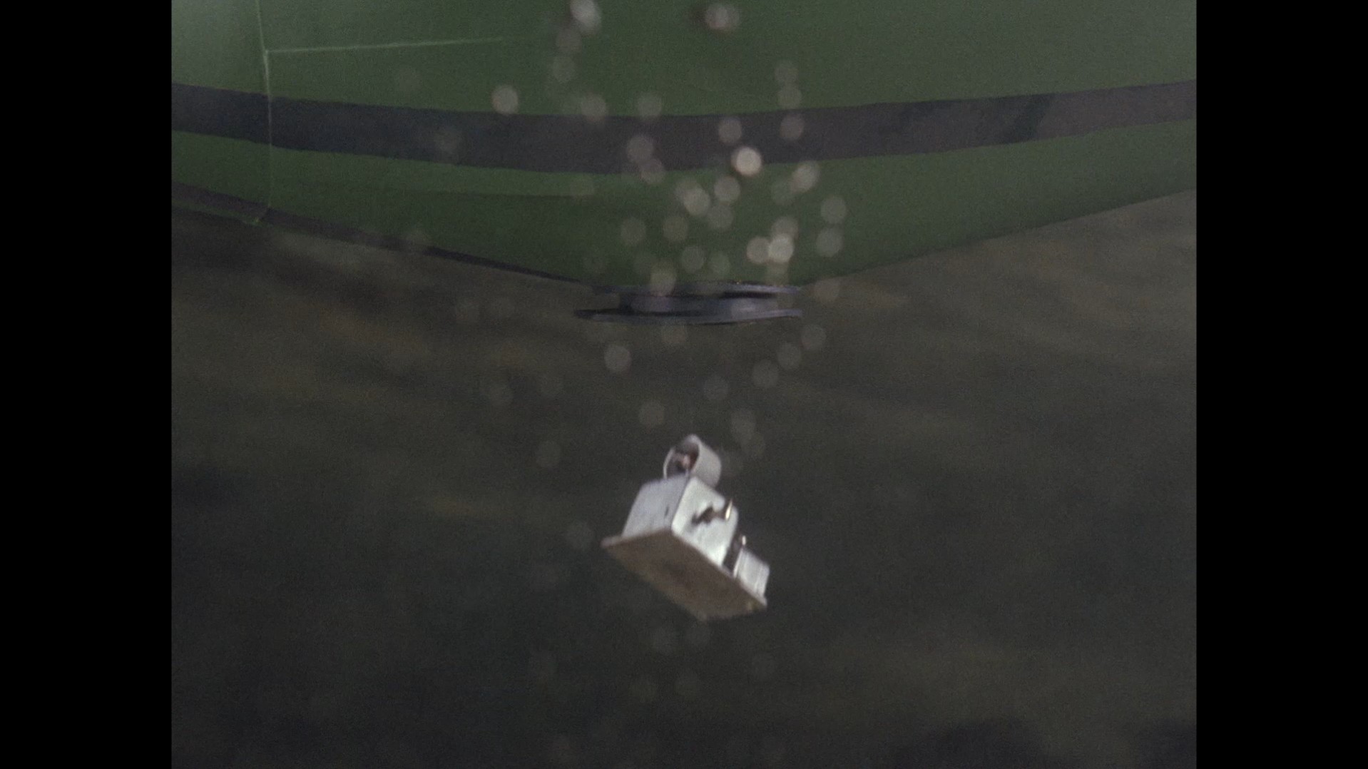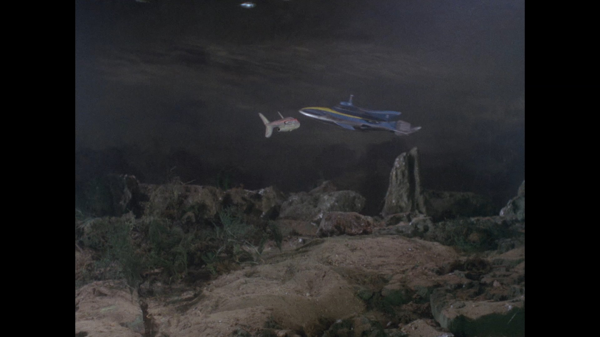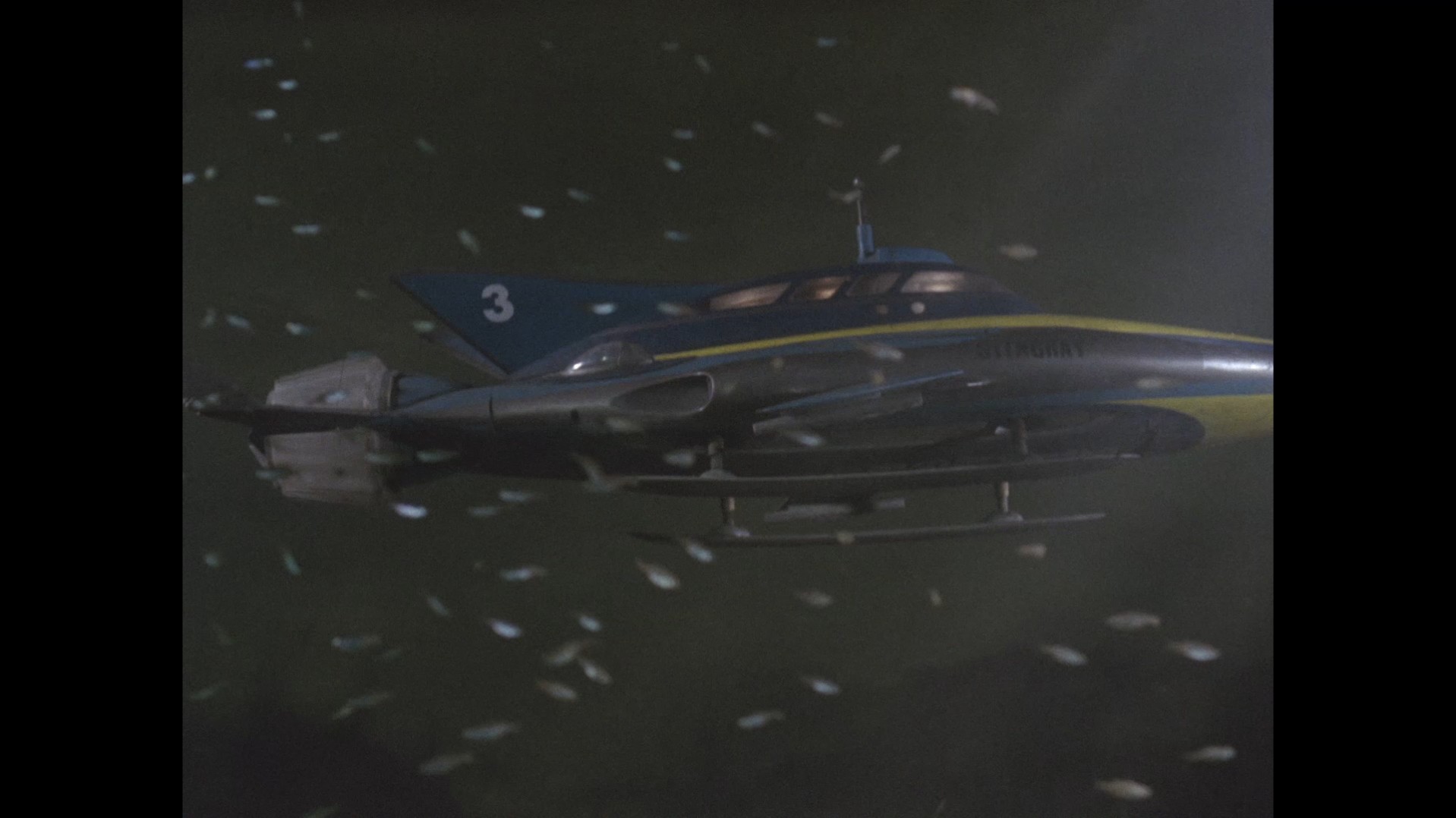 Just as the large Stingray model is finished being lowered into shot, keen viewers might be able to spot a small loop of black wire dangling down in the top left corner of the frame, likely from the rig being held by the operator to “fly” the model.