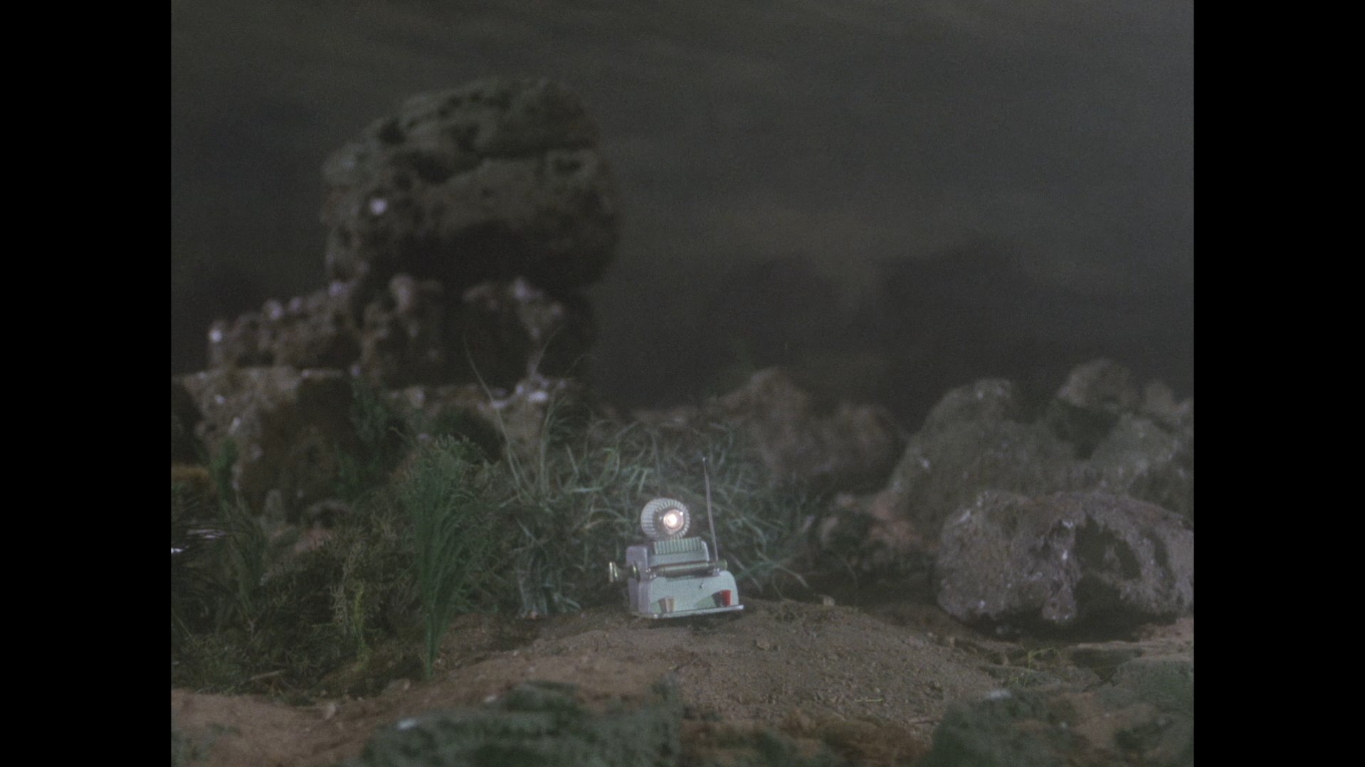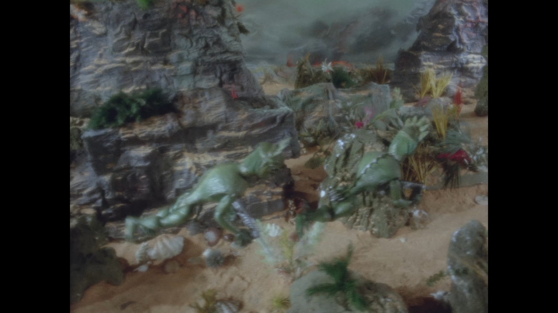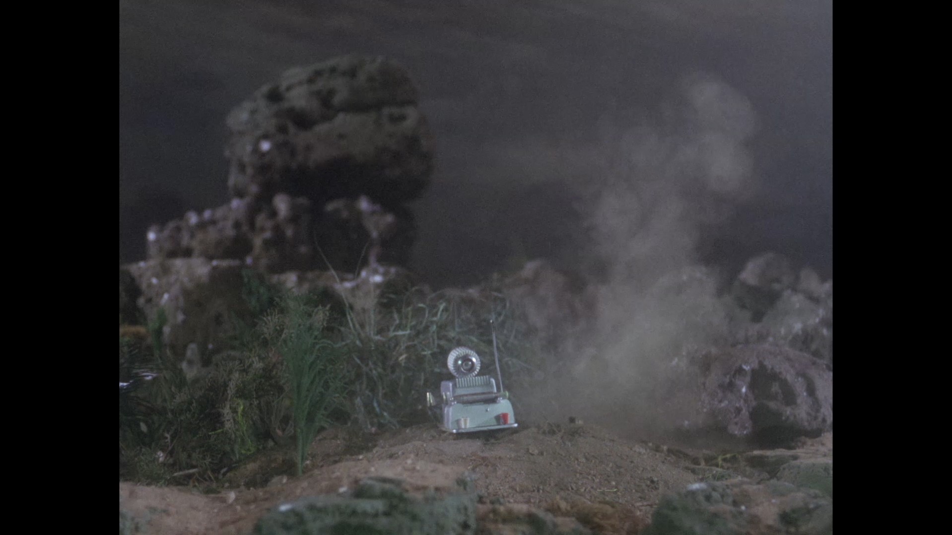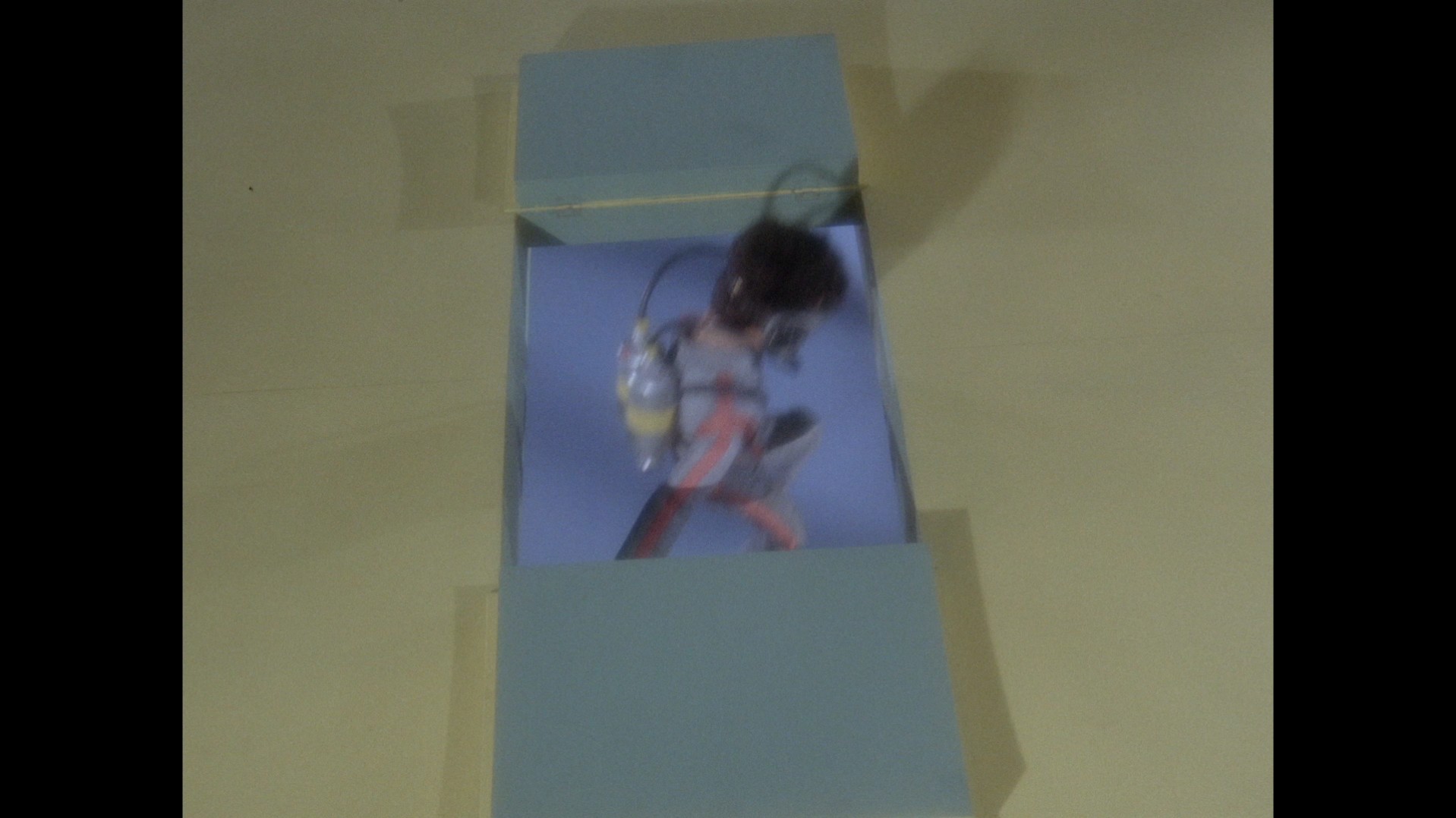 Just as the large Stingray model is finished being lowered into shot, keen viewers might be able to spot a small loop of black wire dangling down in the top left corner of the frame, likely from the rig being held by the operator to “fly” the model.
