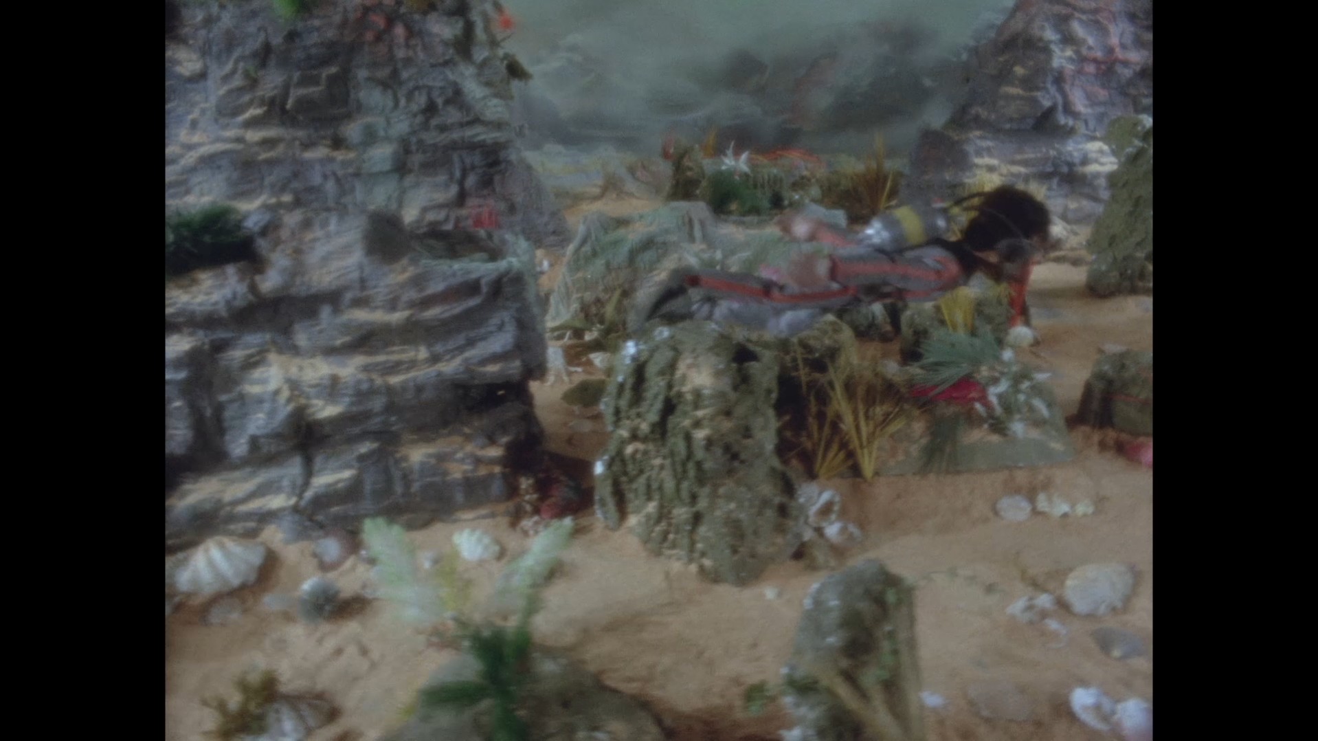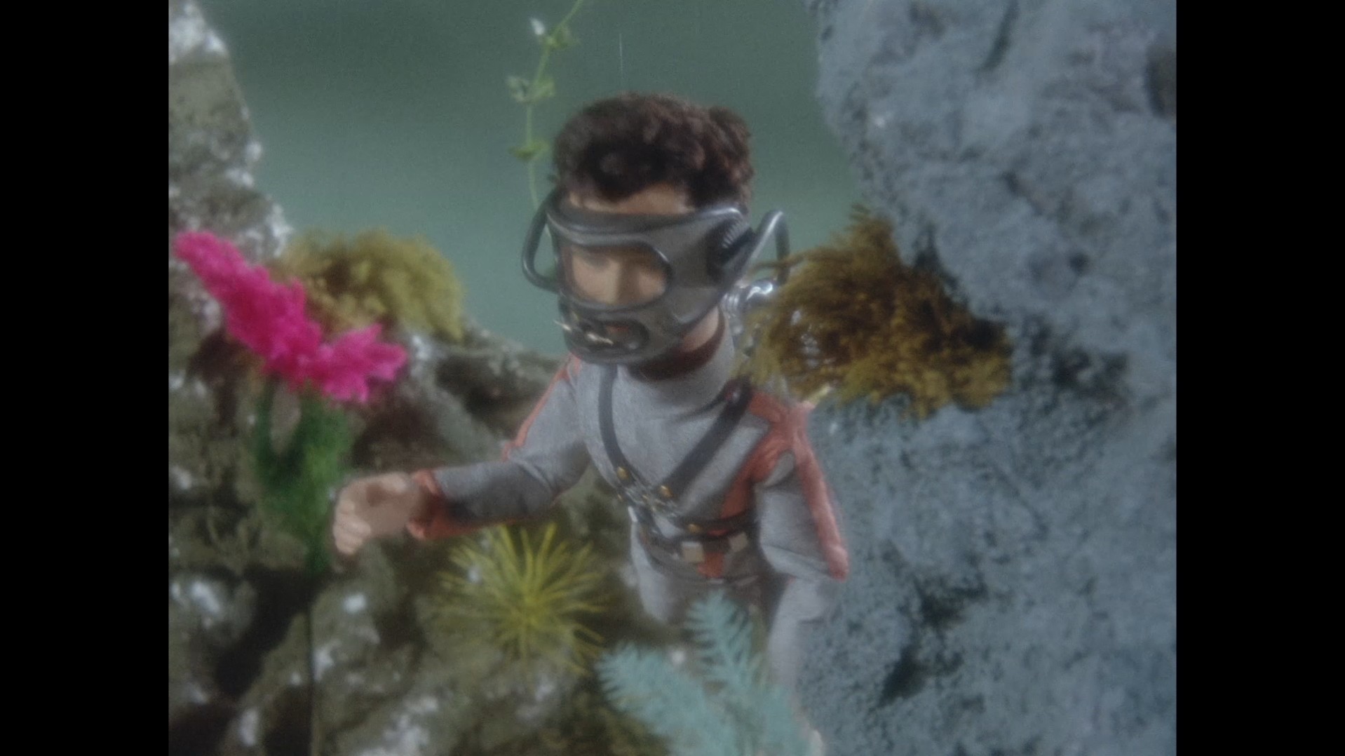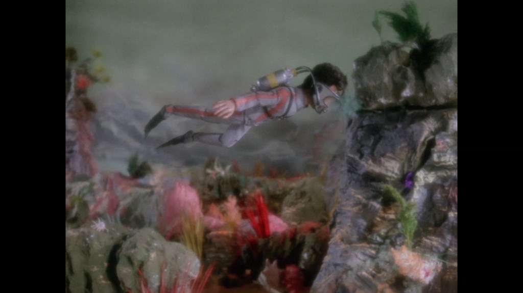 Troy surveys the area, the sea bed covered in beautiful plants and coral which the peasants watching in black and white at home won’t be able to enjoy.