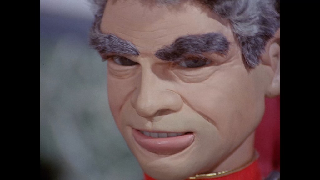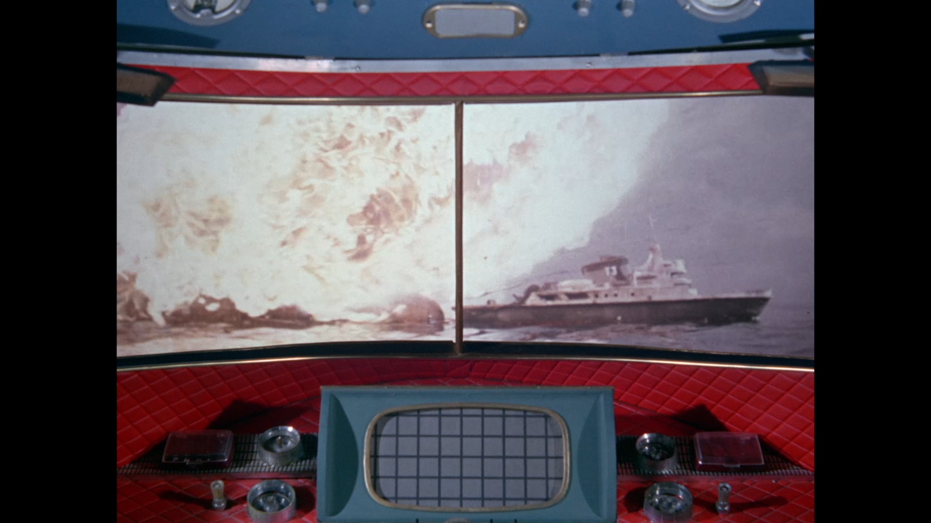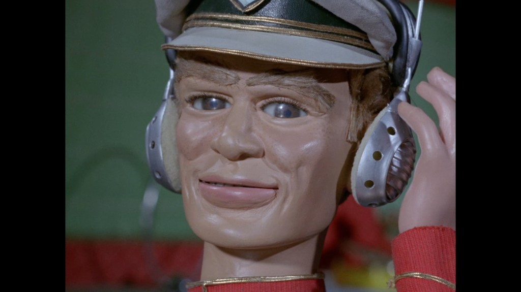 As X20 switches off the sounder, news reaches Stingray of the disaster. How they failed to notice the explosive shockwave rippling through the water I don’t know. Here’s an interesting thing – on the Blu-ray release the close-up shot of the speaker grille (which has been used previously in the series), is double exposed and blurry. This wasn’t an issue on the earlier DVD releases. So is this an issue with the original negatives which was fixed for the DVDs but not here, or just an issue with the Blu-ray transfer? Anyway, more importantly, Troy and Phones now have to go and deal with this ruddy great fire.