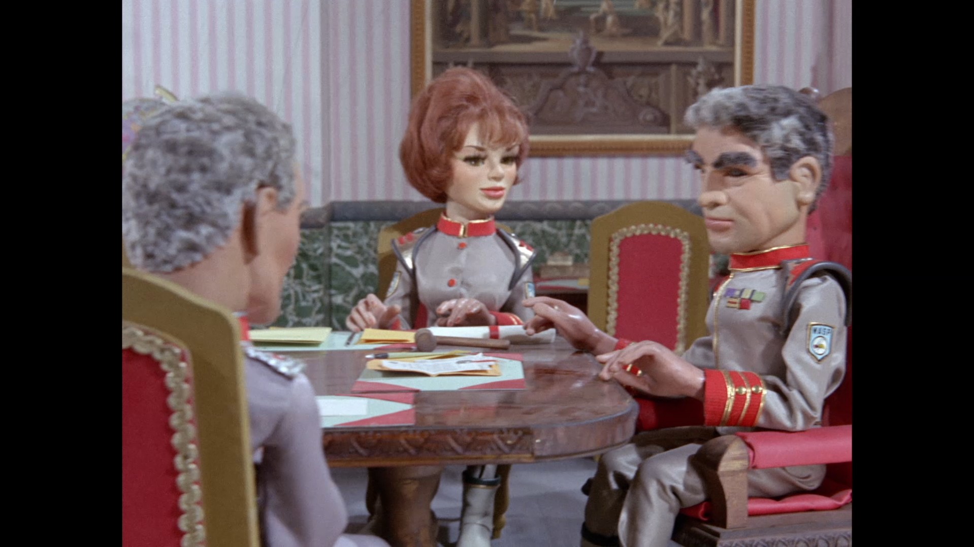 Shore calls for order like he’s working in a crowded burger joint. The camera dramatically tracks down the table to look at all the attendees, a familiar device for making board room scenes feel more tense. The focus shifts from what is being said to how it is being received by everyone else in the scene. The conference scene in the feature film Thunderbirds Are Go also uses this technique to great effect.