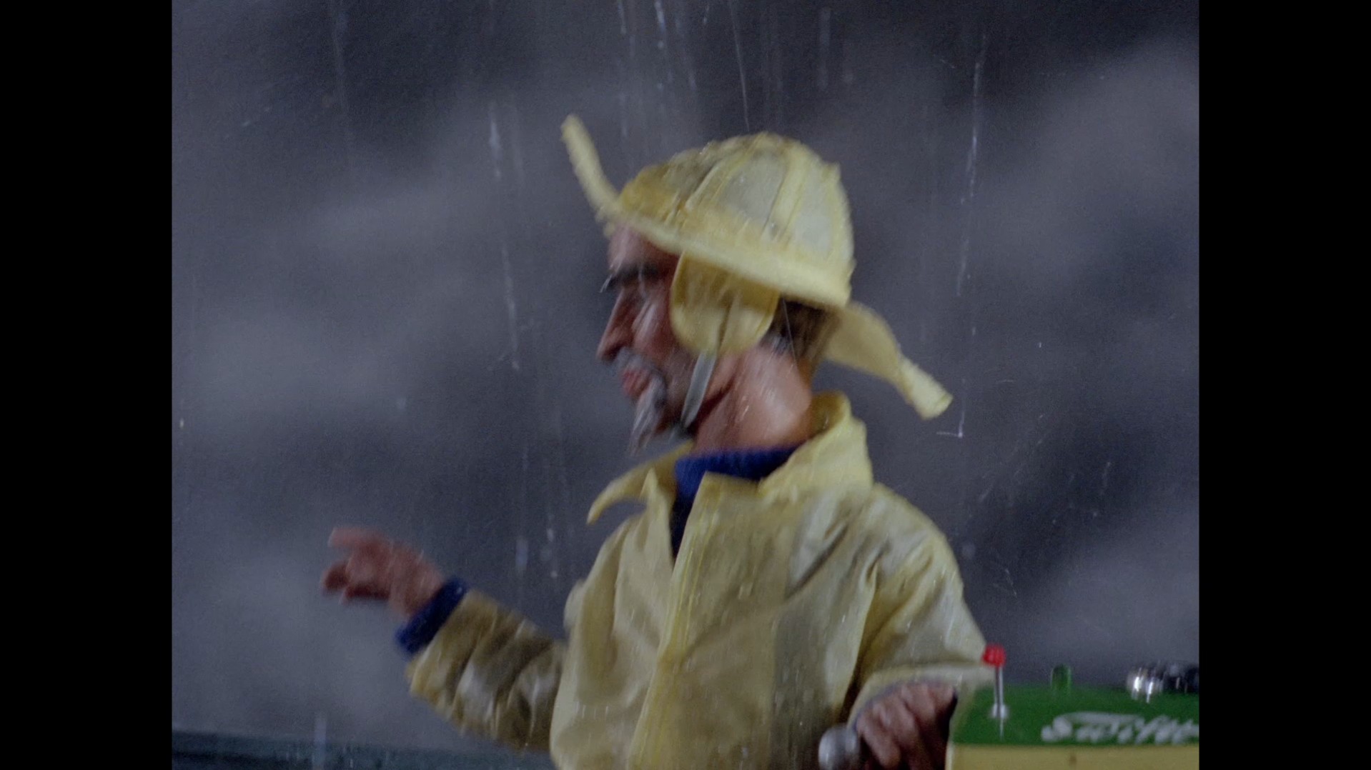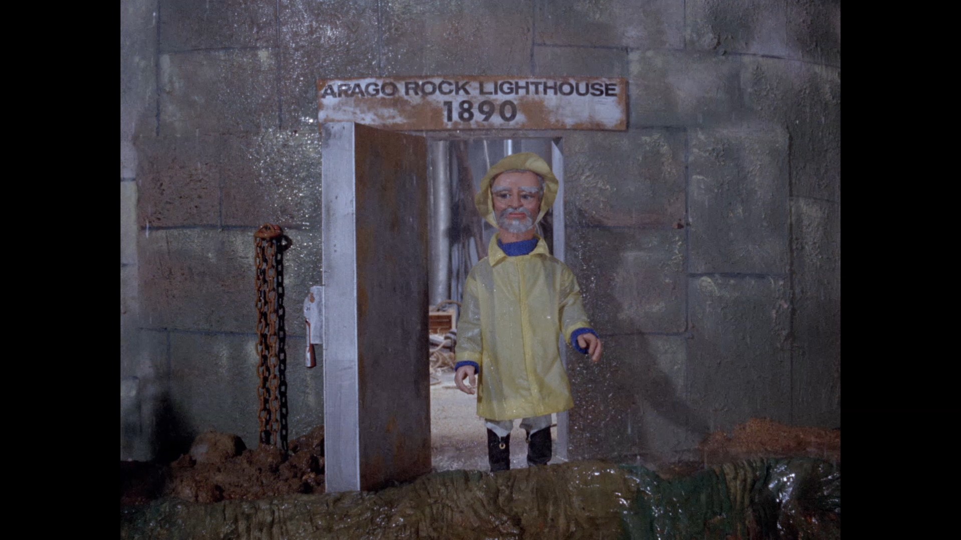 A small miniature wooden boat is seen departing the lighthouse (a model which survives to this day), but on the puppet set Frank is being tossed about in the blue boat used previously by Admiral Denver in Loch Ness Monster and Thompson in Invisible Enemy. The reason for this mismatch is unclear, seeing as a miniature of the blue boat did exist and was used on those prior episodes. Frank mournfully says farewell to his lighthouse as the wind and rain howls around him. It’s a really great scene with the emotion of David Graham’s performance just getting sentimental enough without overdoing it, and combining nicely with the wild ride Frank is having to contend with as the waves crash against the boat.