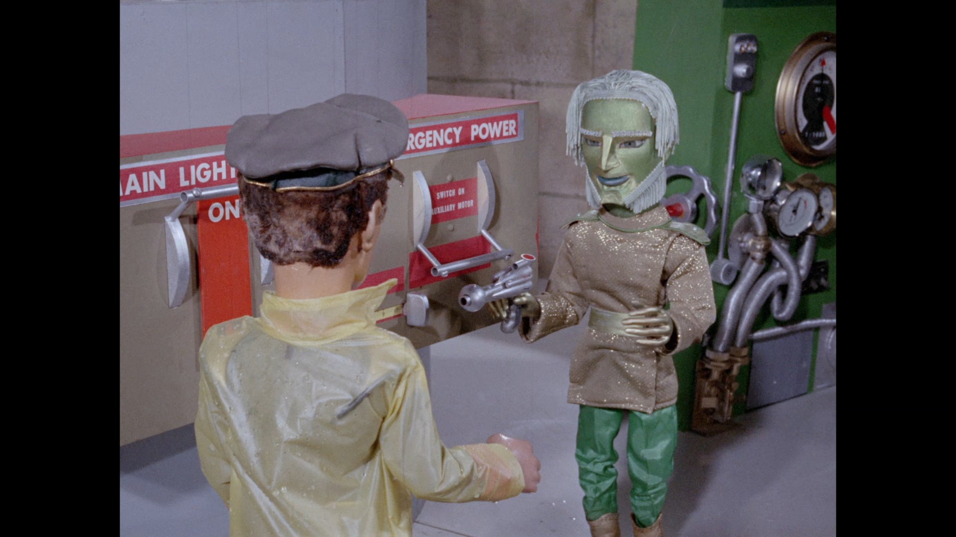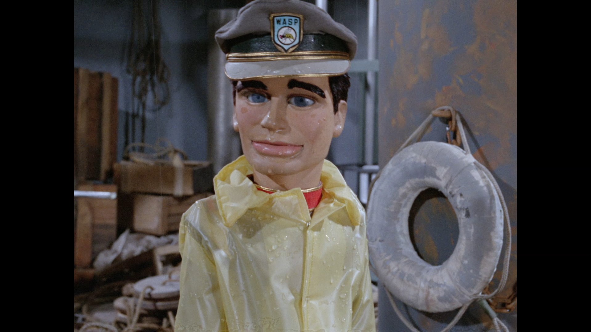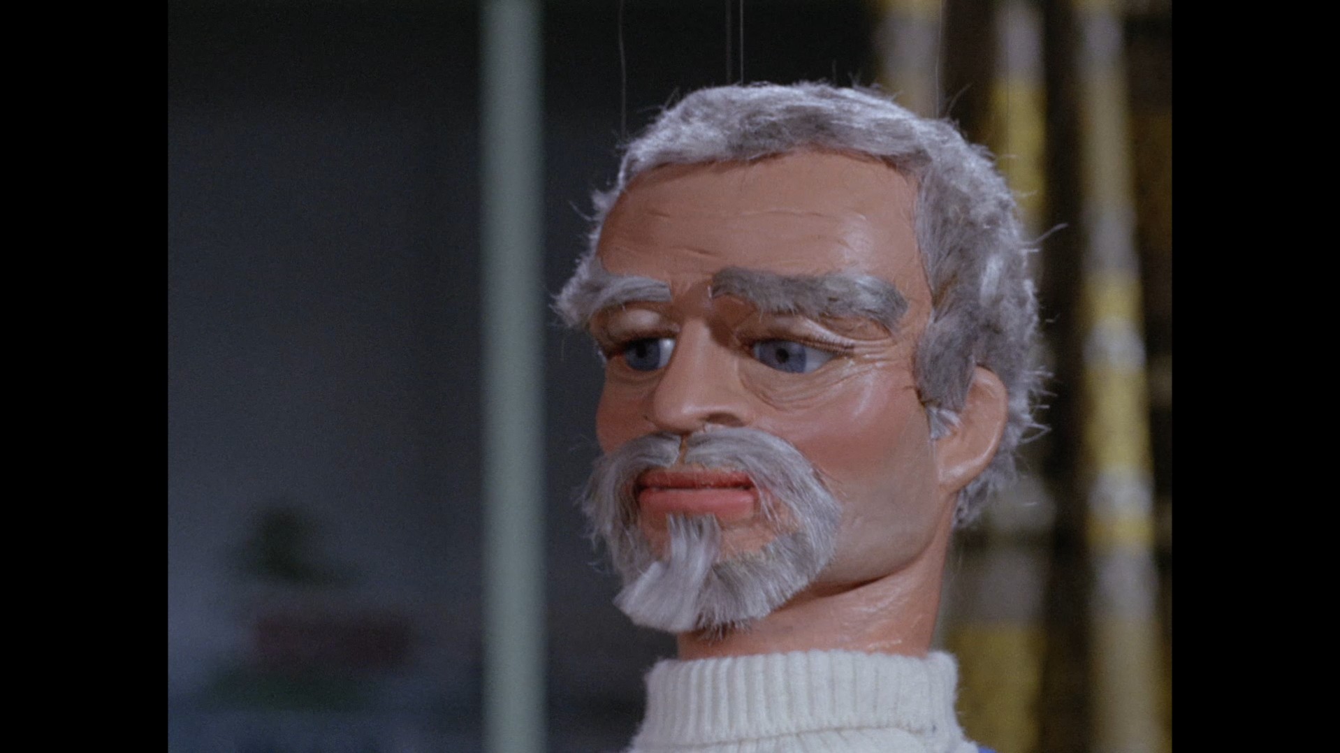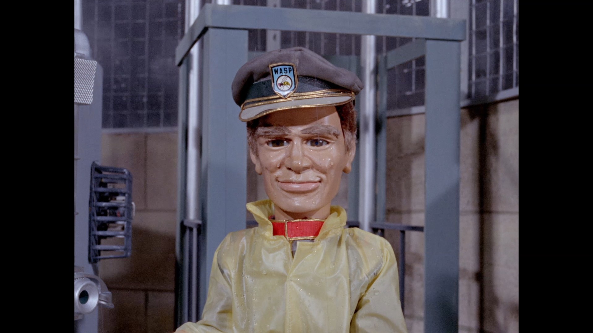 Troy steps out of the elevator at the top of the lighthouse, which is filmed at almost the right angle to not reveal the gap in the top of the elevator’s frame that allows Troy’s puppet wires to pass through… but not quite.