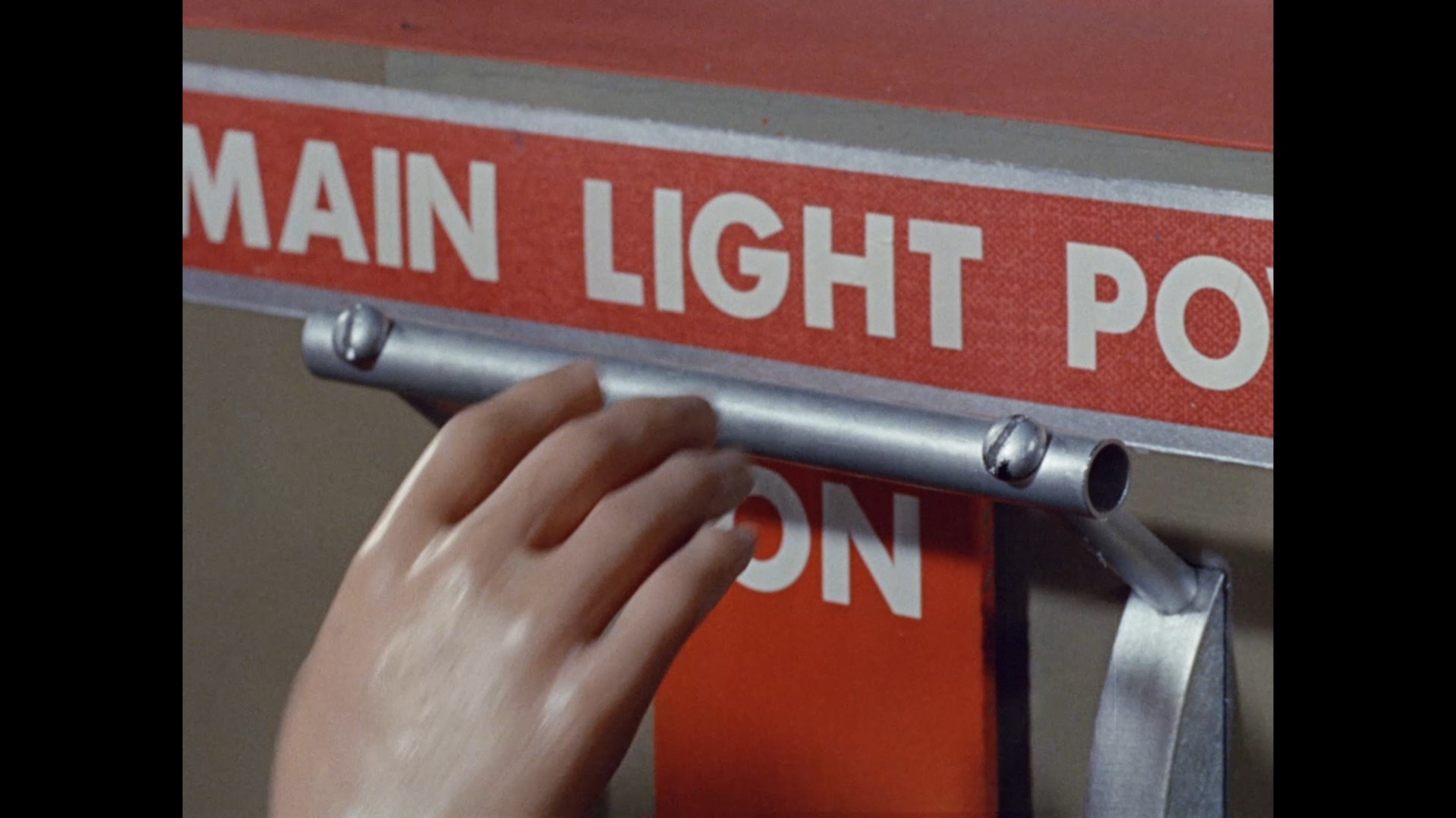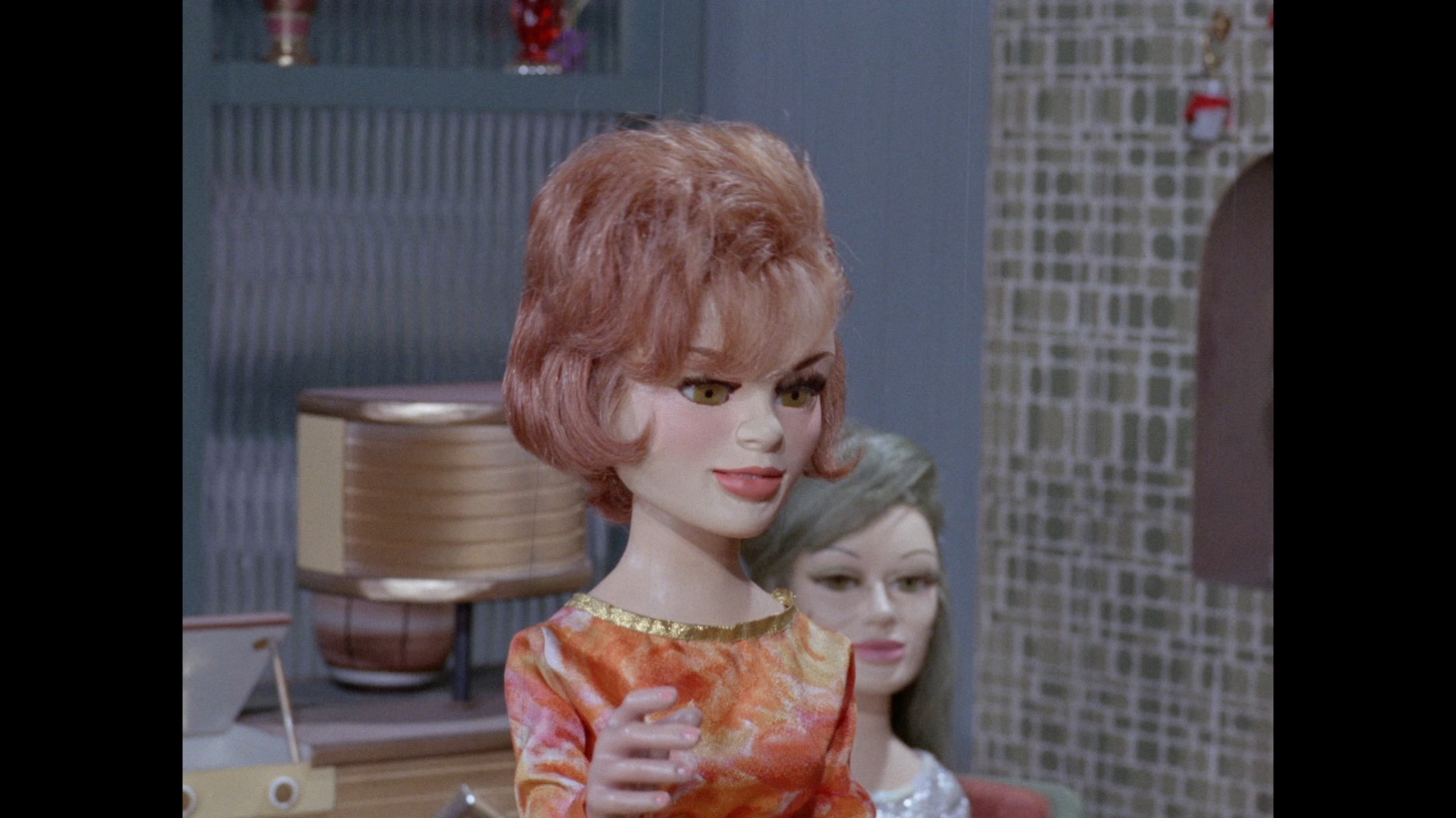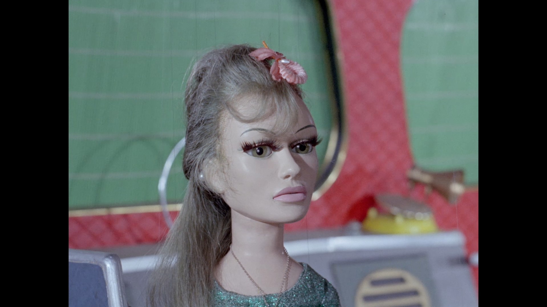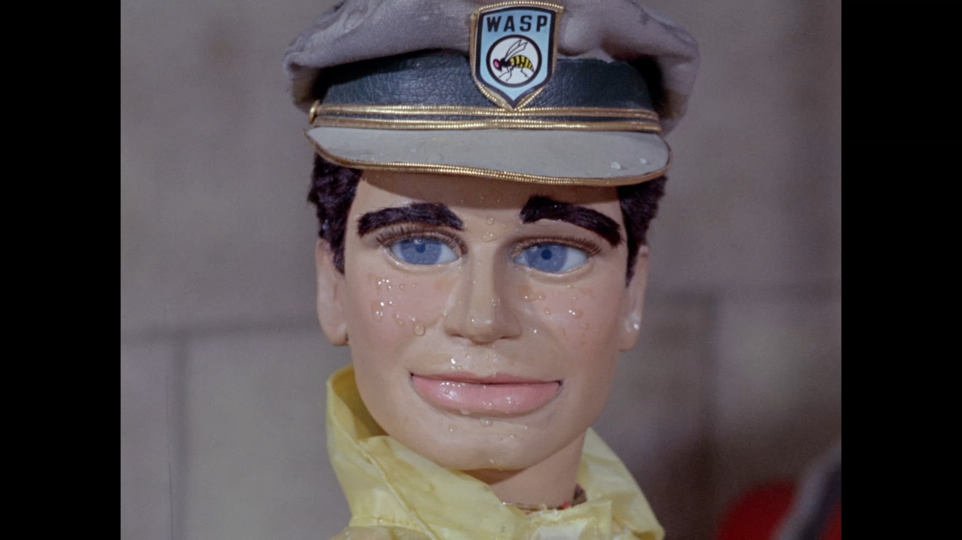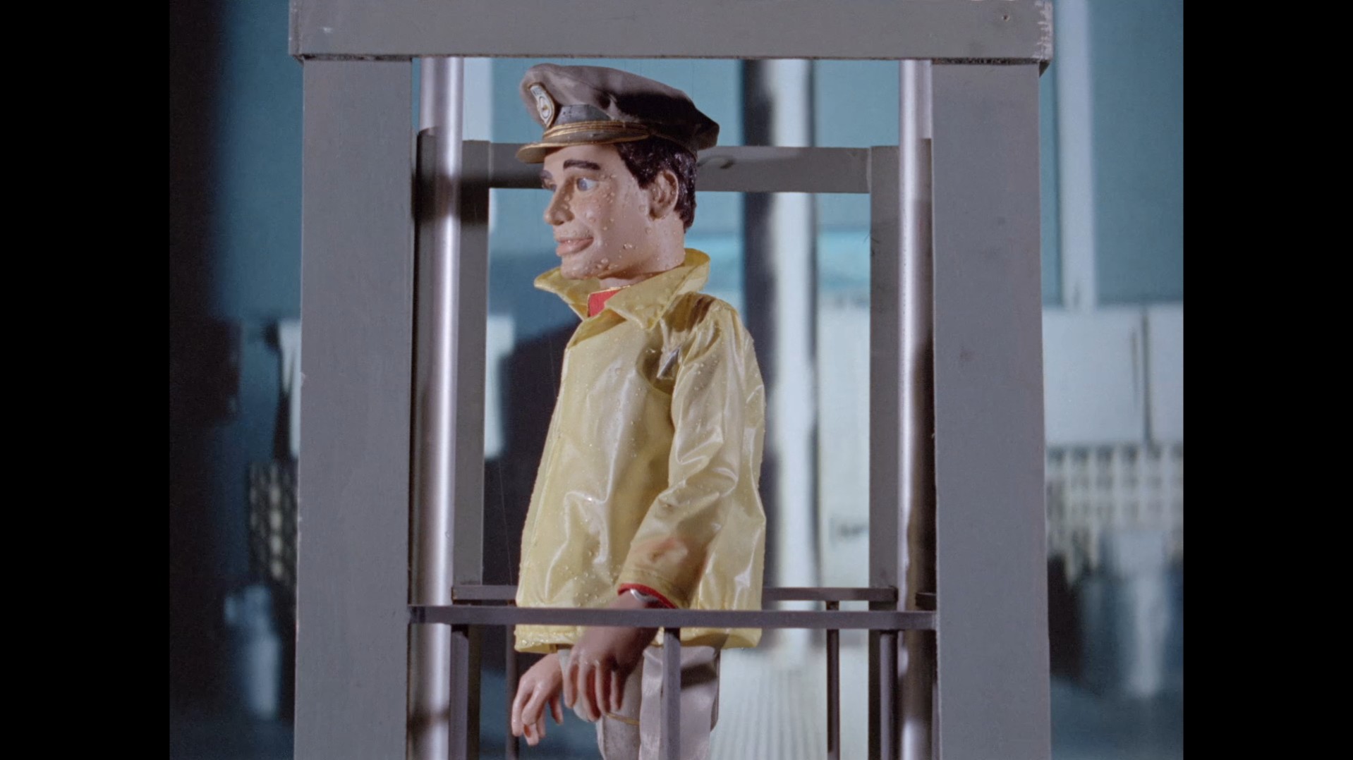 Troy steps out of the elevator at the top of the lighthouse, which is filmed at almost the right angle to not reveal the gap in the top of the elevator’s frame that allows Troy’s puppet wires to pass through… but not quite.