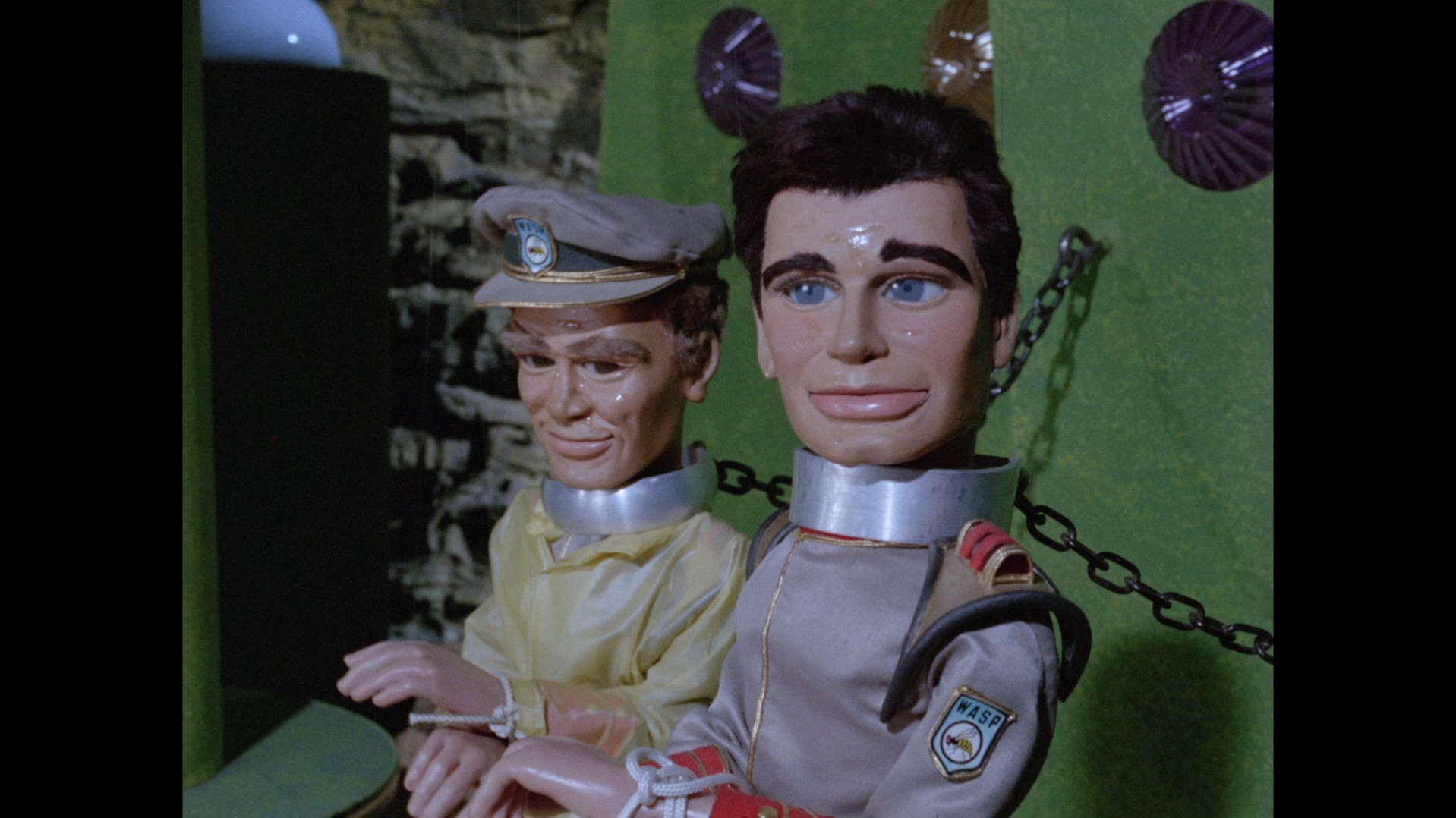 The lair of Lorif and his colleague, Chroma, is finally revealed. It’s pretty much exactly what you might expect from a subterranean base belonging to two Stingray villains with pointy faces. The main control unit Chroma is standing next to is the same one Titan had in Titanica during The Master Plan but redecorated. And standing by the wall in some slightly kinky manacles are Troy and Frank. Troy quips that Phones has taken his time reaching them, which is a bit flippin’ ungrateful.