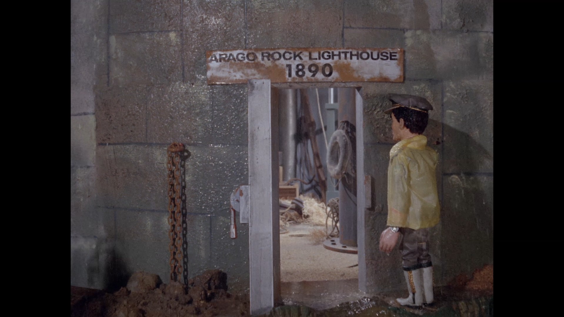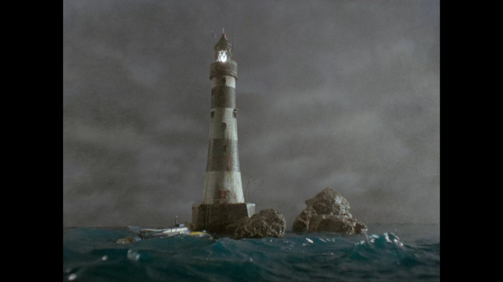 That back projection probably looks familiar to you because it’s actually the same footage which plays out behind the Stingray crew as they are lowered down the injector tubes, but obviously reversed to show Frank ascending instead of descending. It has the unfortunate side effect of basically making the lighthouse appear completely hollow inside with nothing but random gubbins between the ground floor and the light at the top.