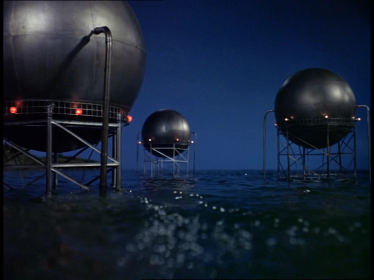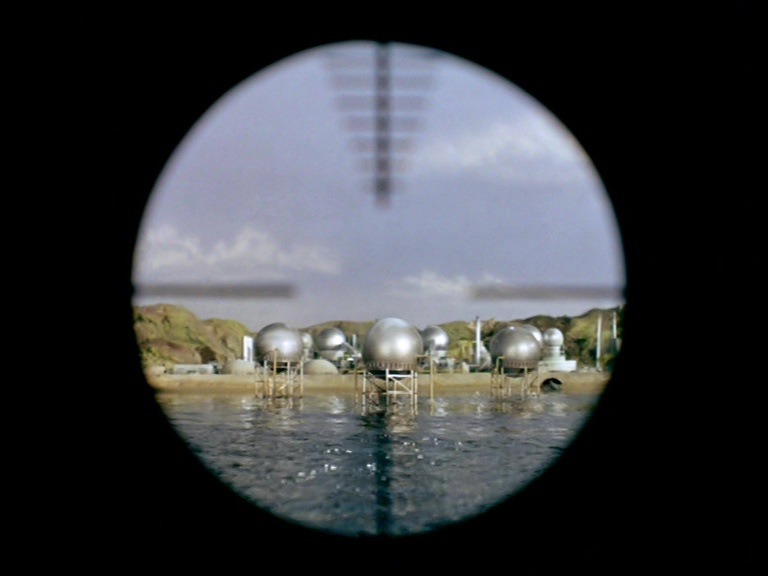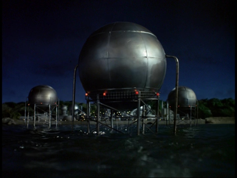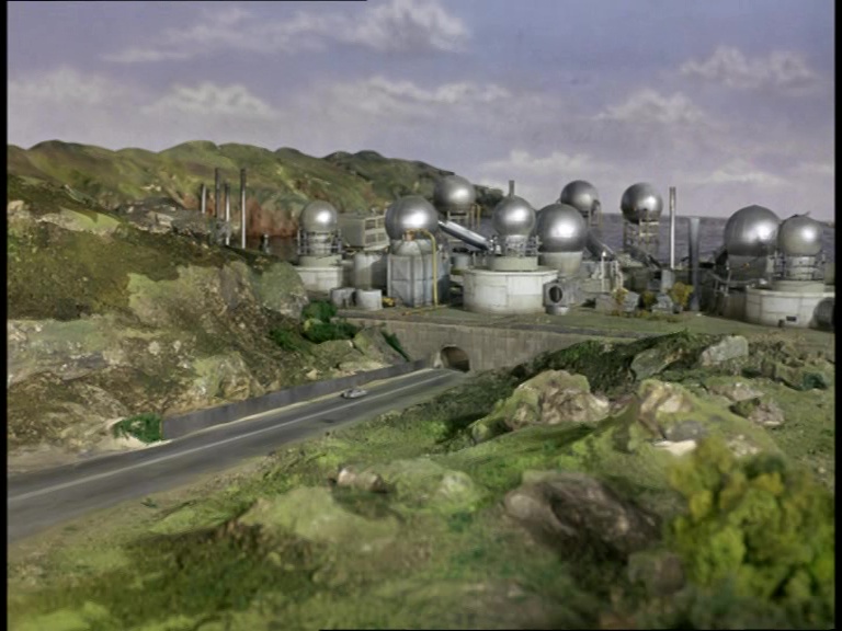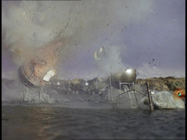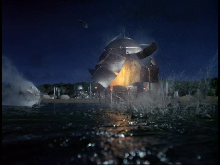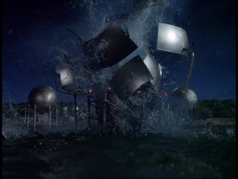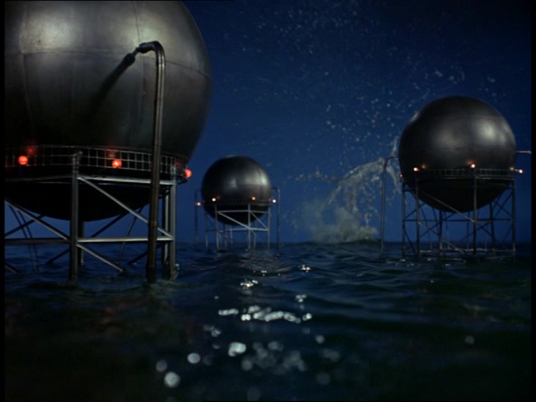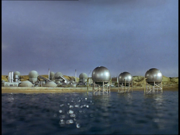 I must confess, I don’t like this shot very much. It really looks like a tiny miniature set. The edge of the water tank is clearly the edge of a water tank and not a horizon line. The plant itself is a bit of a cluttered mess of shiny plastic balls filmed from entirely the wrong angle to make them look big and imposing. The choice of camera angle doesn’t really play to the strengths of shooting model effects. Instead of trying to make small things look big, keeping everything in the far distance likes this makes the tiny things look even tinier.