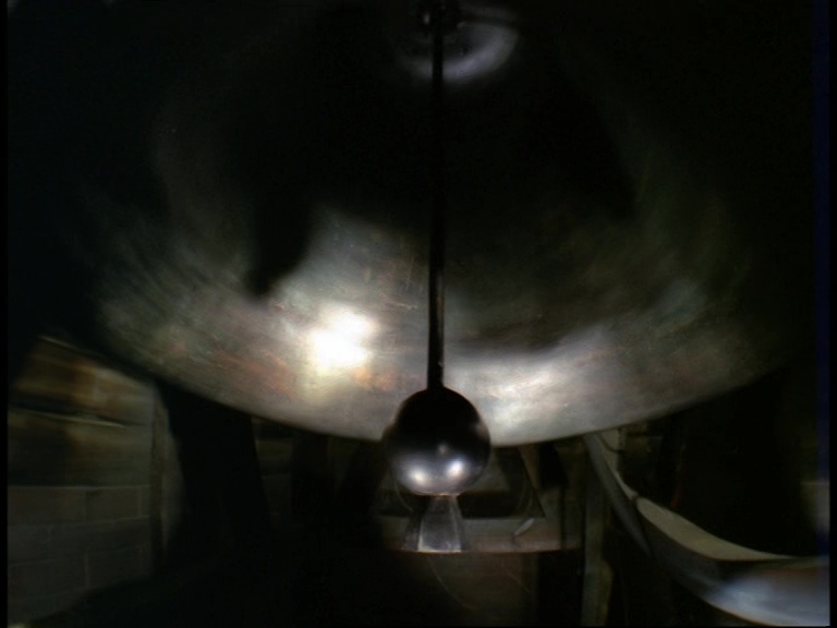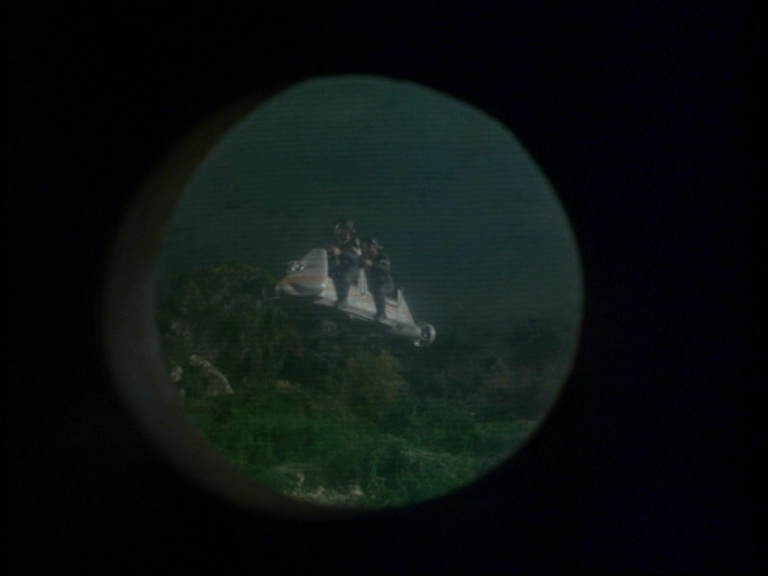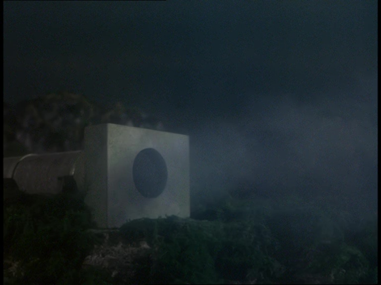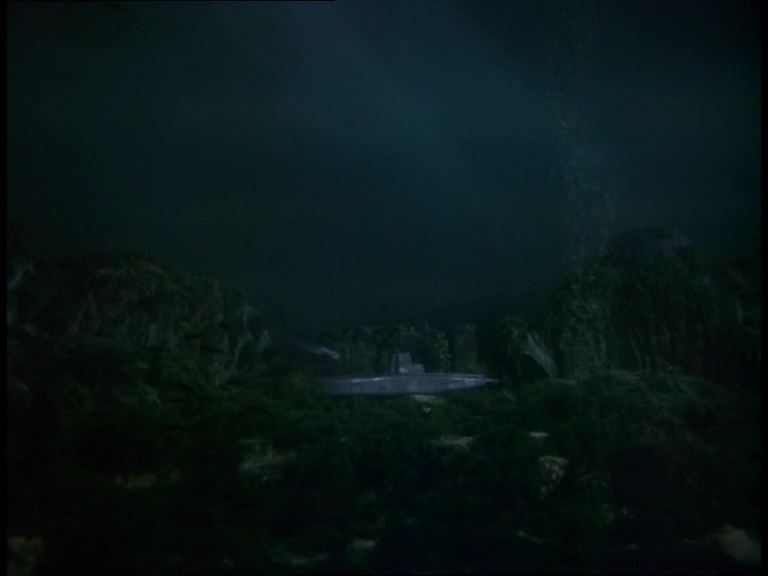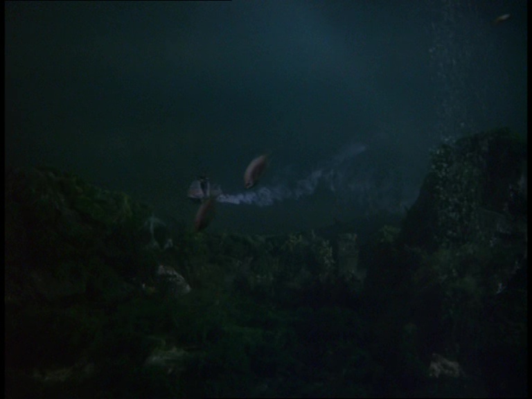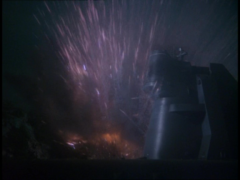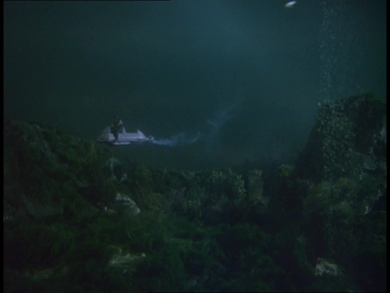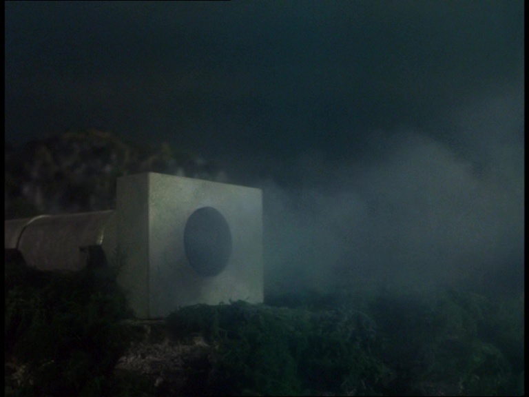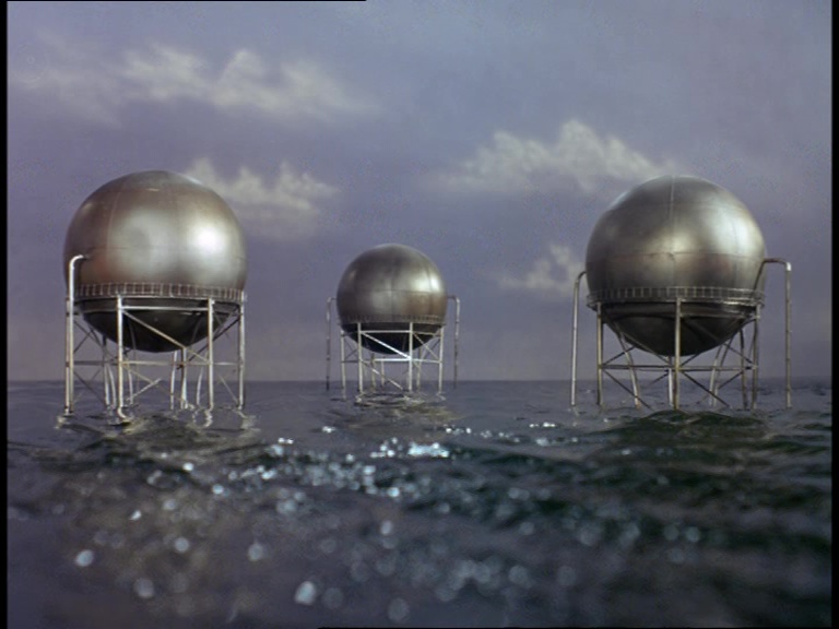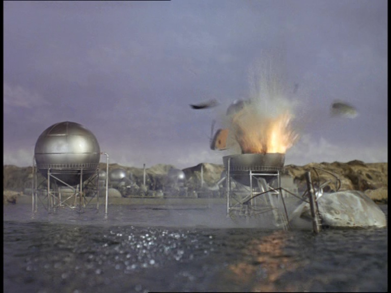 I must confess, I don’t like this shot very much. It really looks like a tiny miniature set. The edge of the water tank is clearly the edge of a water tank and not a horizon line. The plant itself is a bit of a cluttered mess of shiny plastic balls filmed from entirely the wrong angle to make them look big and imposing. The choice of camera angle doesn’t really play to the strengths of shooting model effects. Instead of trying to make small things look big, keeping everything in the far distance likes this makes the tiny things look even tinier.