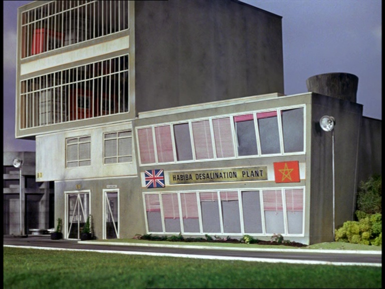 There’s some interesting items to note when comparing the script to the finished establishing shots on-screen. Firstly, it took a moment for Donald James to decide whether the spelling was going to be “HABIBI” or “HABIBA”. Secondly, the finished sequence is slightly less ambitious than its original description from the script. No camera movements at all, no Arabic writing under the main sign, no gatehouse, and most of the plant and shoreline is kept very far off in the distance so we can’t inspect the details too closely. The control building itself is a great model which attempts to capture the scale of the puppet set we’ll see in a moment…