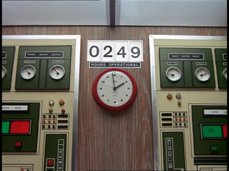 The dialogue for the rest of the scene is swapped around slightly too in order to make Unwin sound a bit more like an expert on the whole business, rather than Matthew. The scripted lines have Matthew assume that the sabotage was “an attempt to ignite a flash chamber.” This indicates that Donald James was intending for the plants to operate on the principles of old-fashioned distillation, rather than the up-and-coming reverse osmosis principle which was being developed at the time. Cor, I’m such a bleedin’ expert on desalination now. Time for a spin-off blog?