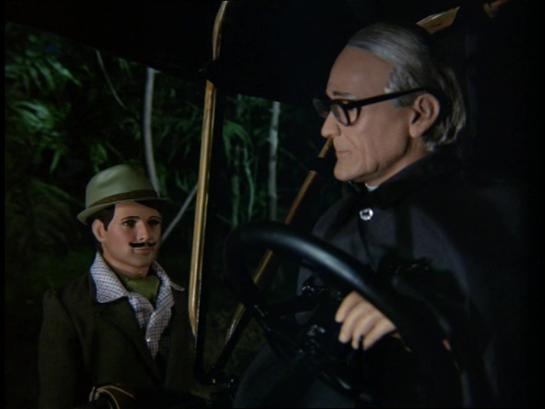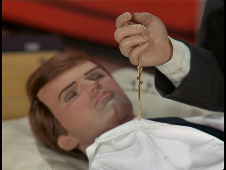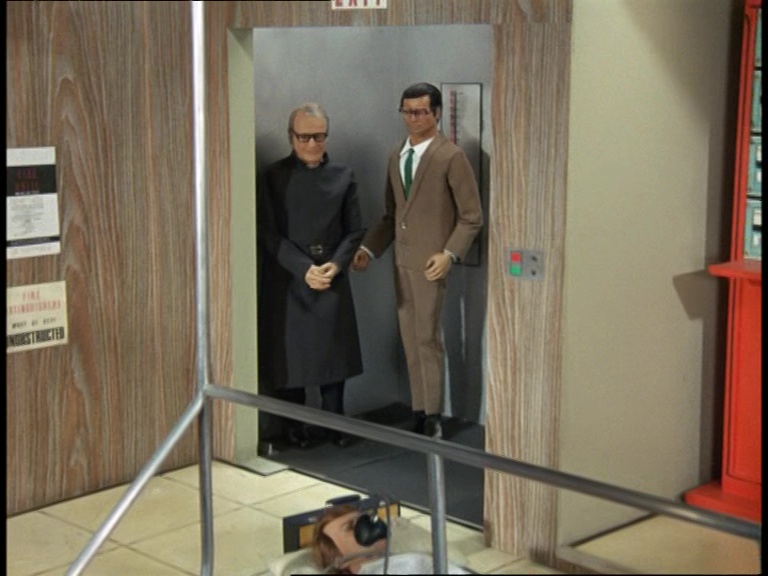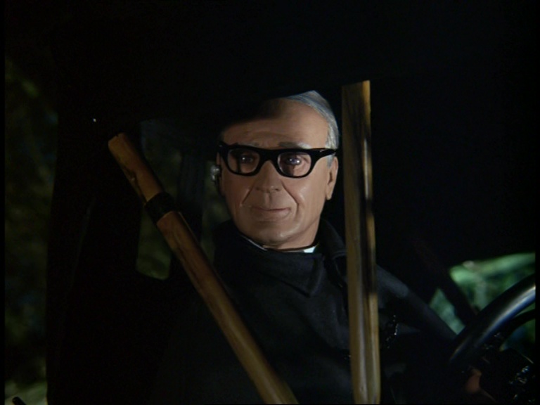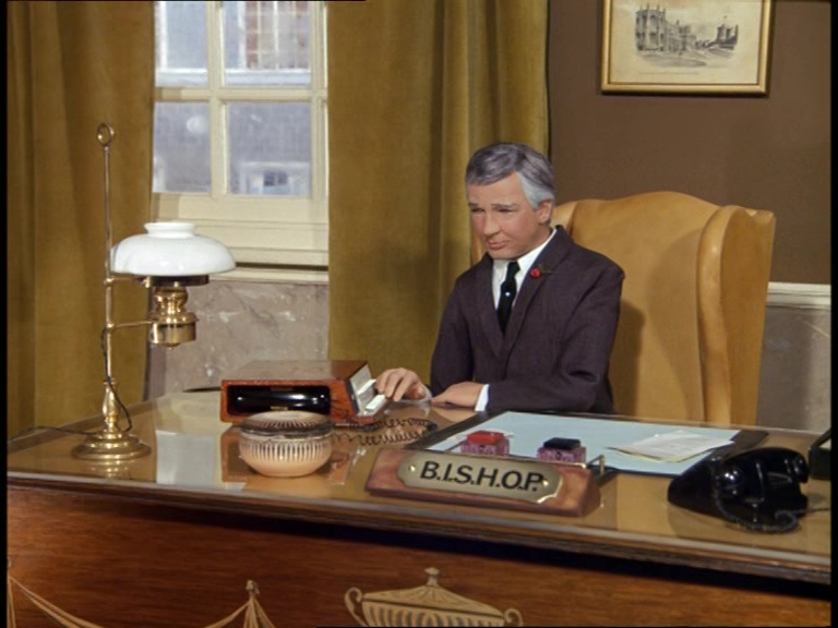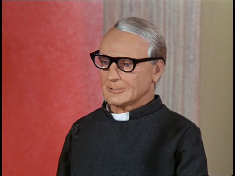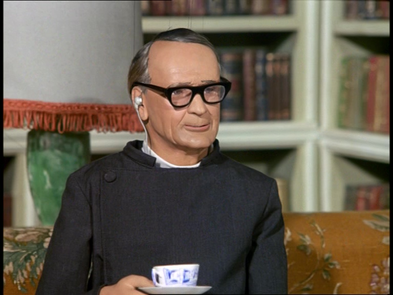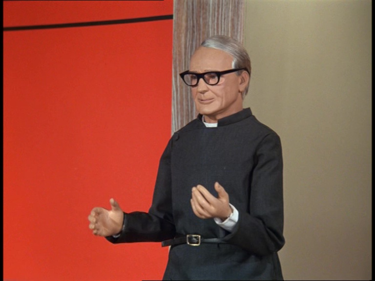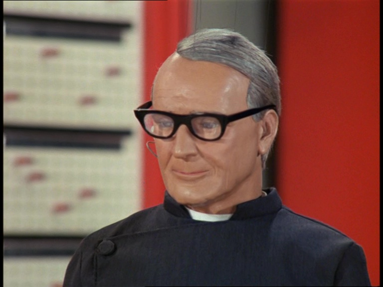 Father Unwin gets to enjoy looking smug for a moment. But, more importantly, I’m mystified as to how this set can have a ceiling while the puppets are standing and moving about on it. I think it’s some clever perspective trick with the camera and the placement of the large central ceiling panel which therefore hides the gap where the puppets’ wires and the bridge above would be positioned. It’s a remarkably sophisticated shot.