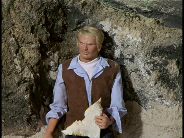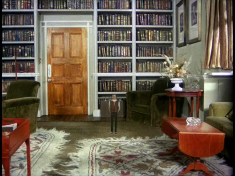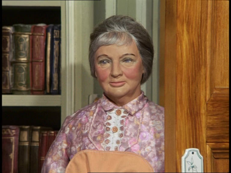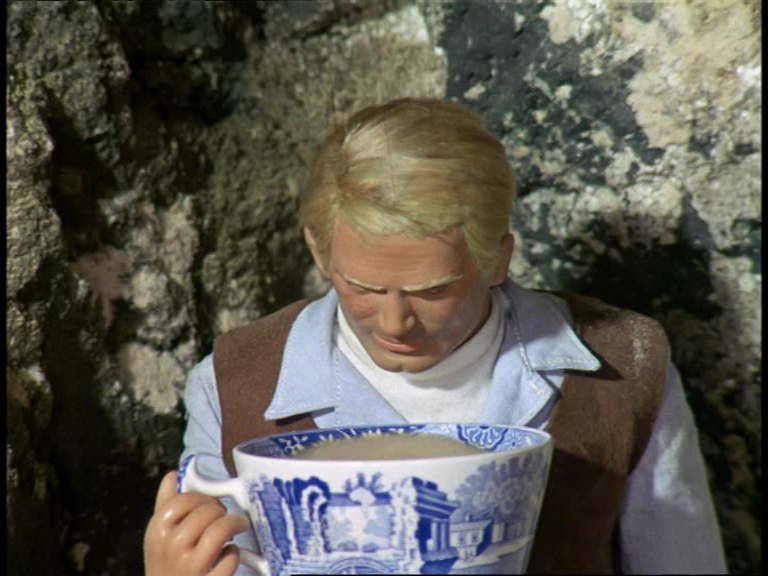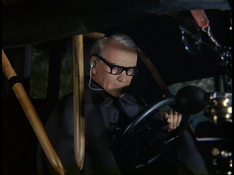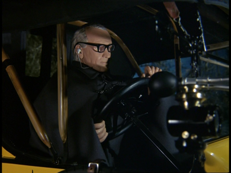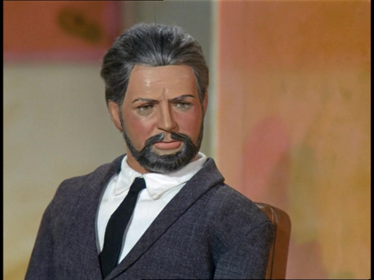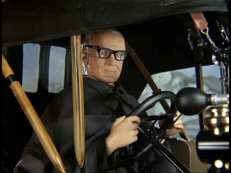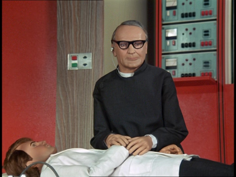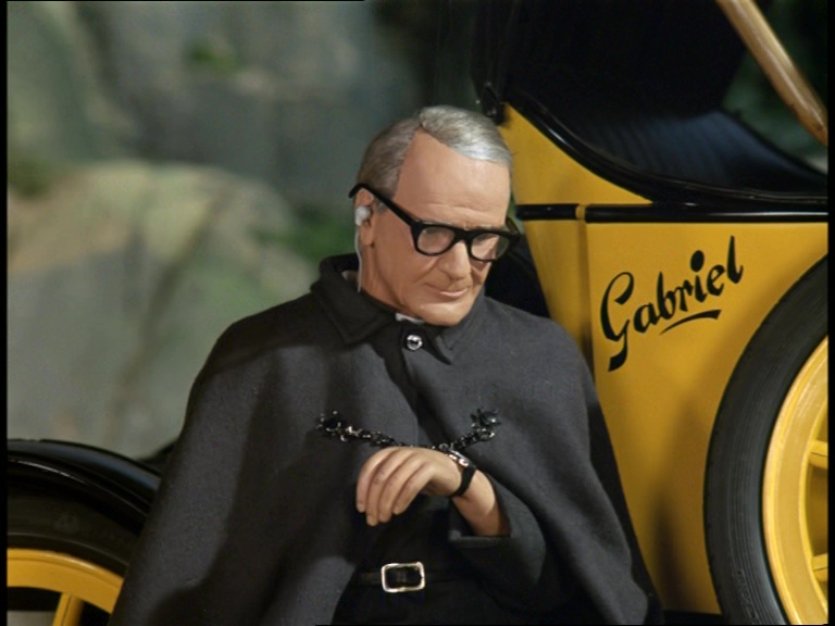 Father Unwin gets to enjoy looking smug for a moment. But, more importantly, I’m mystified as to how this set can have a ceiling while the puppets are standing and moving about on it. I think it’s some clever perspective trick with the camera and the placement of the large central ceiling panel which therefore hides the gap where the puppets’ wires and the bridge above would be positioned. It’s a remarkably sophisticated shot.