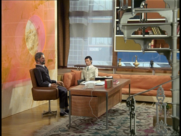 The penthouse office of Mr. Nielson is an ecclectic mix of modern and traditional design. In the foreground, viewers can spot the spiral staircase and living room rug stripped out of Professor McClaine’s cottage from Joe 90. Meanwhile the colourful translucent cutout on the wall is sourced from the Mysteron Complex seen in the Captain Scarlet episode, Crator 101. For several years, the Slough studios had been building up a healthy library of very futuristic set elements. Not much of that could fit comfortably in The Secret Service‘s contemporary sets, so art director Keith Wilson probably had to get quite clever with how he recycled different pieces from the archive.