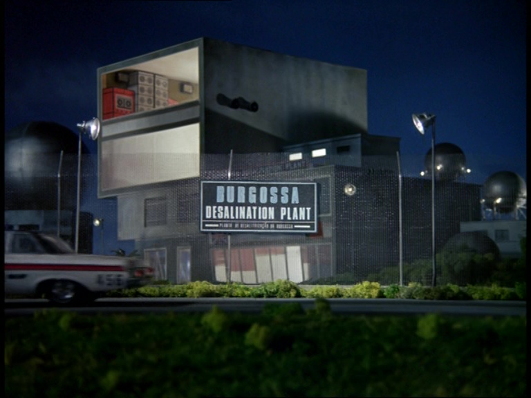 This is the Burgossa plant. Funnily enough, it looks pretty much identical to the Habiba plant which blew up earlier. In fairness to the effects team, that’s exactly how James’ script suggested it should look except now there should be dark jungle in the background because we’re in South America. Burgossa is likely a name made up from the Spanish city of Burgos. To fit the South American setting, the main sign for the plant has been translated into Portuguese. Flying to Brazil really would have stretched Ken Turner’s location budget so probably fair enough that all this is done with models.