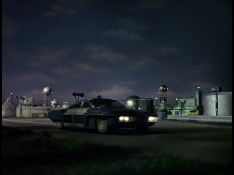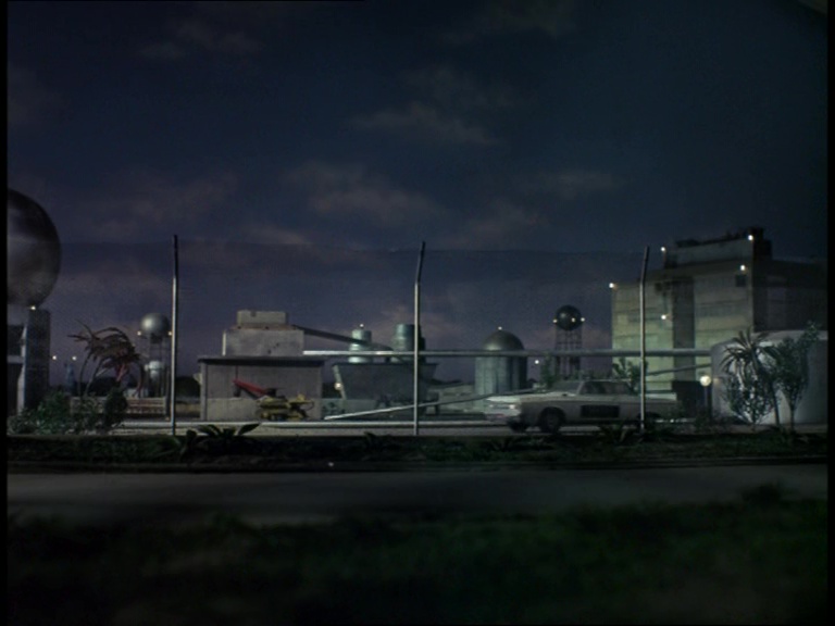 These nighttime shots of the plant are really quite nice. Sam Loover’s car from Joe 90 appears to have been modified to represent one of the patrol cars guarding the perimeter. A minimal amount of work has gone into transforming the Habiba control building into the Burgossa variant with the original sign covered up, one of the big windows changed, and a Portuguese flag slapped over the previous one, even though the script says we’re supposed to be in a Portuguese-speaking nation of South America, rather than in Portugal itself. Not really important seeing as Burgossa is a made-up place anyway, but it just suggests that in the day-to-day production shuffle, the model makers probably didn’t feel too bad about glossing over certain nuances in the script.