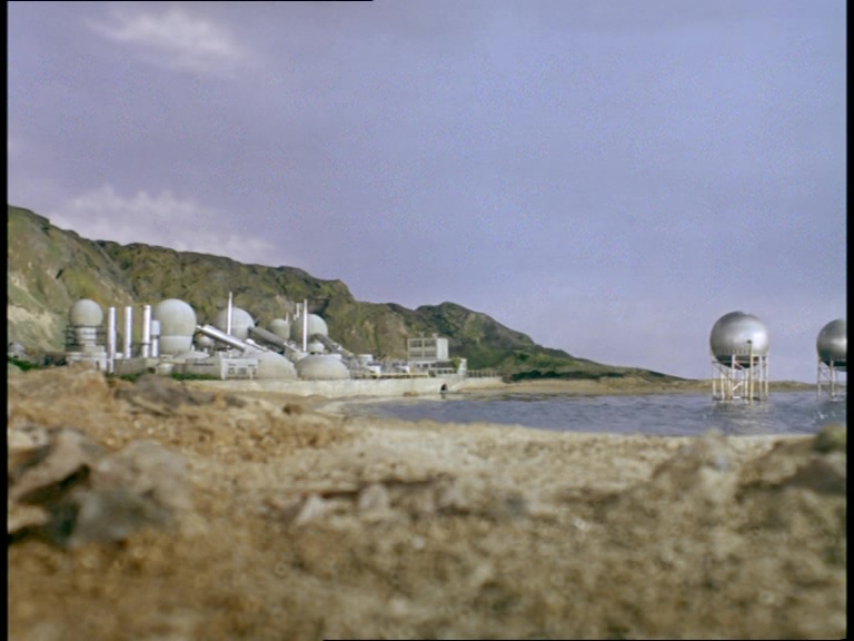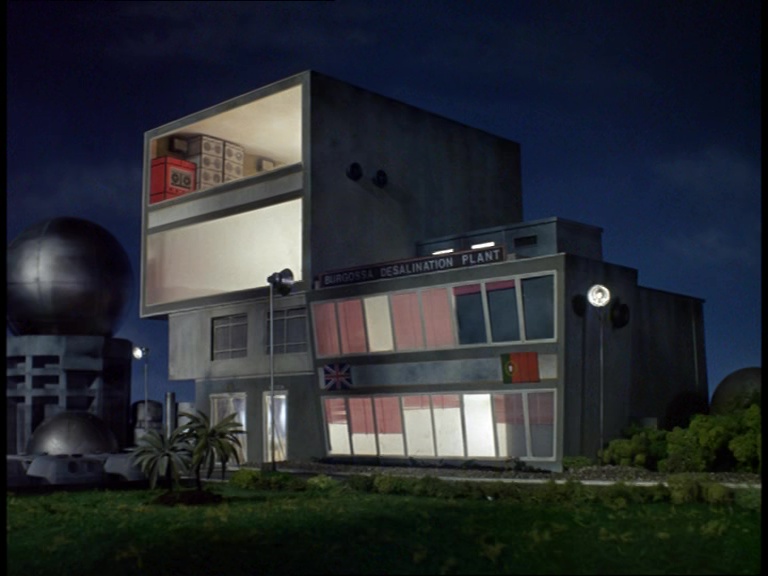 Already I can sense that the special effects team are a lot happier this week. We’re in much more familiar territory as we gaze across the water at the Habiba Desalination Plant complete with big tanks and random sticky-out bits. This is The Secret Service straying as far as it can towards a futuristic look without breaking out of its 1969-ish setting.