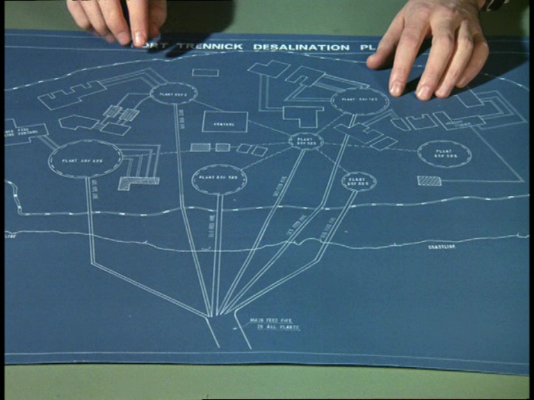 Over at the Vicarage, it turns out that Unwin and Matthew haven’t done a whole lot since being briefed by the Bishop. They’ve just been twiddling their thumbs waiting for Burgossa to explode before springing into action to save the final plant at Port Trennick. This one is located in England which is probably a tad more convenient for BISHOP and a lot more convenient for the Century 21 location unit. Unwin’s map of the plant is surprisingly well-detailed but technically innacurate. It shows the water tanks dotted about on-land rather than in the sea which is closer to how real-life desalination plants are built, and how Donald James described them in the script. The effects team presumably chose to put the water tanks in the middle of the sea because it looked cooler… which is fair enough.