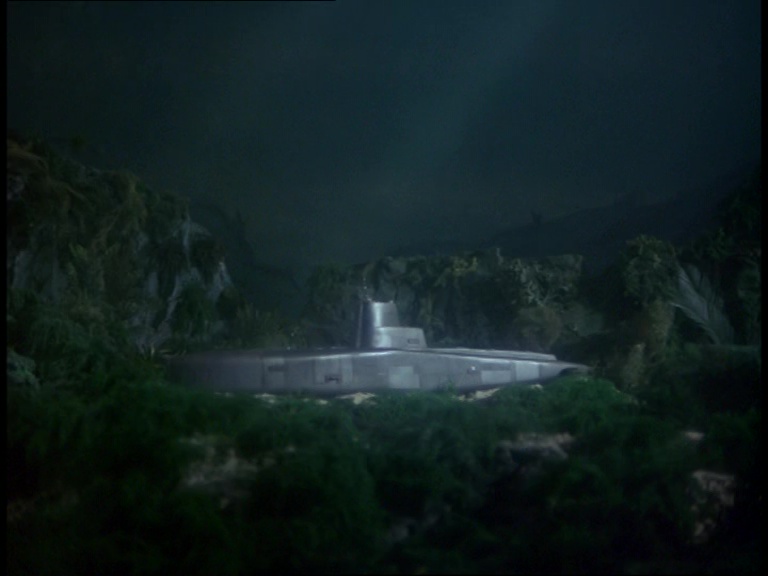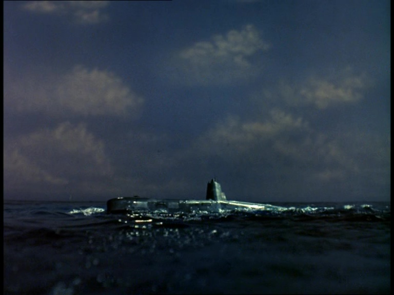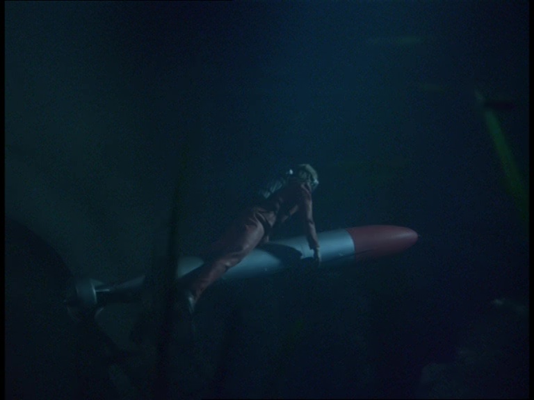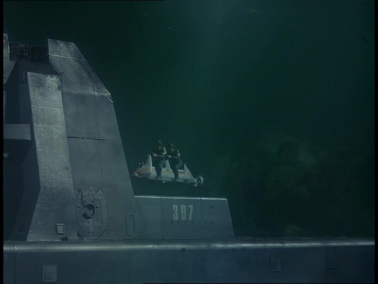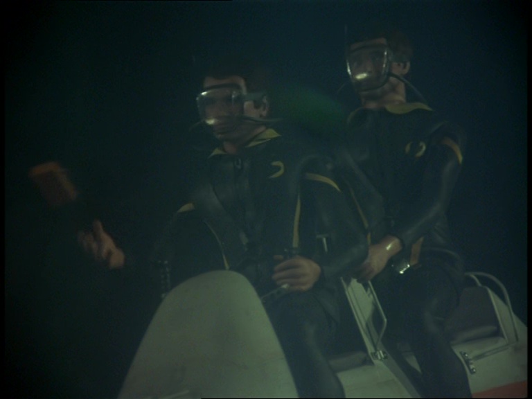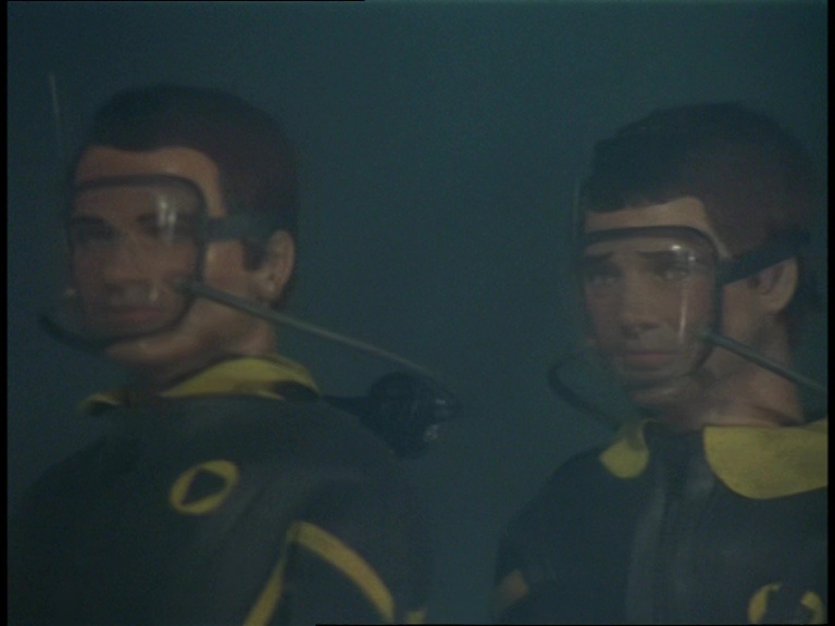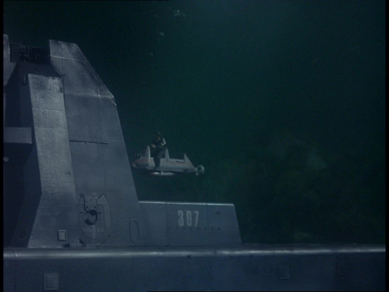 I guess because they can’t be bothered to swim, two frogmen leave the sub on the back of an underwater mobility scooter. Incidentally, Hartley’s submarine re-uses the same models in long shots and close-ups that have been used for several Century 21 subs such as the USS Panther II seen in the Captain Scarlet episode, White As Snow.