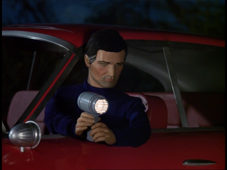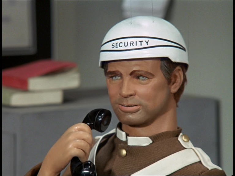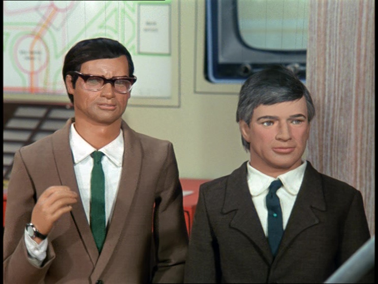 The contrast between this pre-titles sequence and the one we saw in A Case For The Bishop last week is pretty startling. The all-live-action approach has been replaced with the more familiar all-puppet-and-models approach. Instead of near-silent shots of the not-so-picturesque Slough Trading Estate at night, we’ve got a big and bustling and ultra-modern plant which explodes spectacularly without warning. I’m not really saying that one is better than the other because they’re setting out to achieve different things, but I do think it’s fascinating how different those goals are considering this is supposed to be the same show. This episode’s opening is much, much, much more in-line with what we’ve seen from previous Supermarionation shows both in terms of content and production methods.