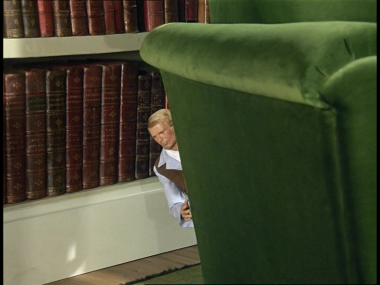 Finally, Unwin and Matthew are getting going and the Minimiser makes quick work of shrinking down the heroic gardener. It’s a very similar sequence to what we saw in A Case For The Bishop but this time Matthew is in his regular clothes instead of a fire suit, and the flowers and ashtray by the curtains have swapped positions…