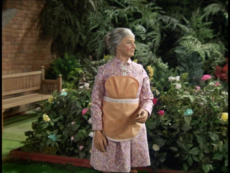 Mrs Appleby goes to look for Matthew in the garden by standing in the middle of the shrubs and acting like a disgruntled pelican. Curiously, the script has this scene preceding the one we just saw with Matthew and Unwin. It was presumably swapped around to just shift the emphasis somewhat.