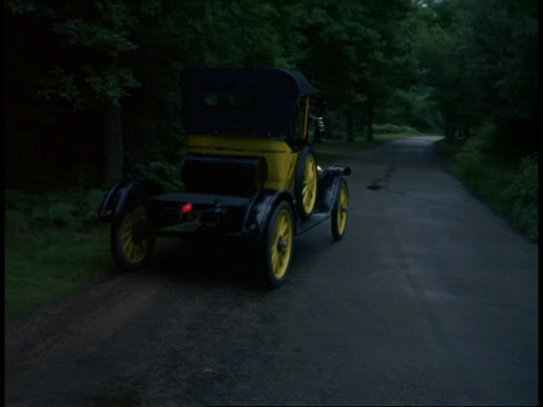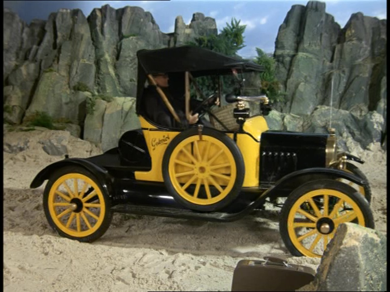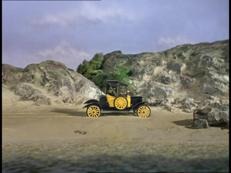 Presumably tugged off the set by an unseen wire, the entire puppet-sized Gabriel prop with Father Unwin inside drives off the beach. Either that or its the remote-controlled version seen more prominently later in the series. This shot really is the sort of thing that the location unit was intended for, but clearly nobody could be bothered to drive the real Model T all the way to Skegness or wherever and risk getting it stuck in the sand.
