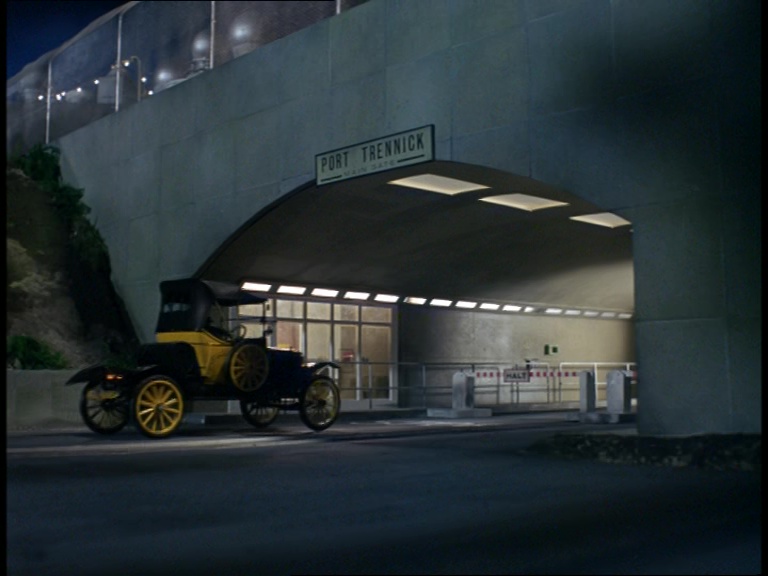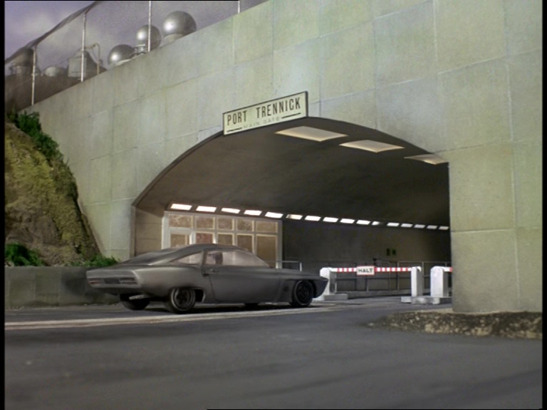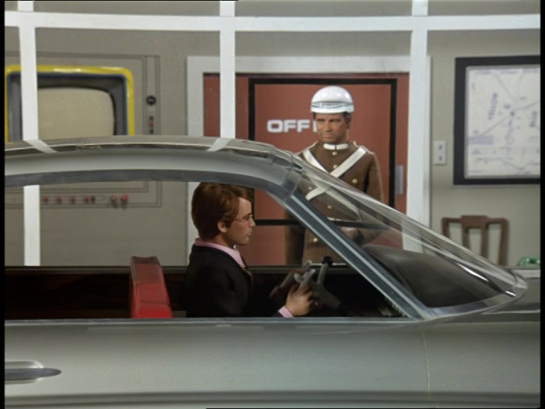 Back at ground level, the tunnel entrance to Port Trennick looks a bit more impressive. Blake is driving Sam Loover’s car. This might be one of those practical reasons why the Captain Scarlet puppet was chosen to portray Blake. A version of the puppet would have already been available with the under-control mechanics necessary for him to be operated without wires from inside the car. Incidentally, the guard’s helmet would have been pinched straight off the head of one of the police officers from the final scene of the final Joe 90 episode produced, Viva Cordova.