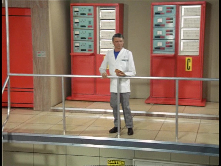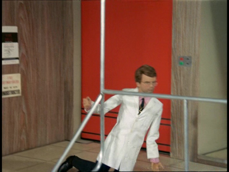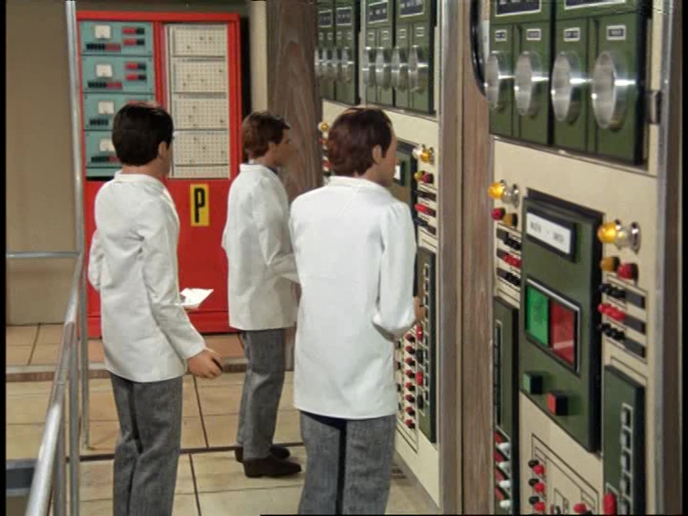 Unwin’s finally made it to the control room. One brief bit of dialogue is cut from the script: Looking directly at the dying man on the floor he asks, “Is this the man?” Of course, Williams should have childishly responded to that, “Oh no, that’s just Kevin, he’s always passing out on the floor in the middle of his shift. Probably all that gin what does it.” Fortunately Tony Barwick used the common sense that all good script editors should be blessed with to remove dialogue that points out the bleedin’ obvious.