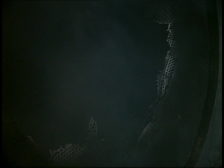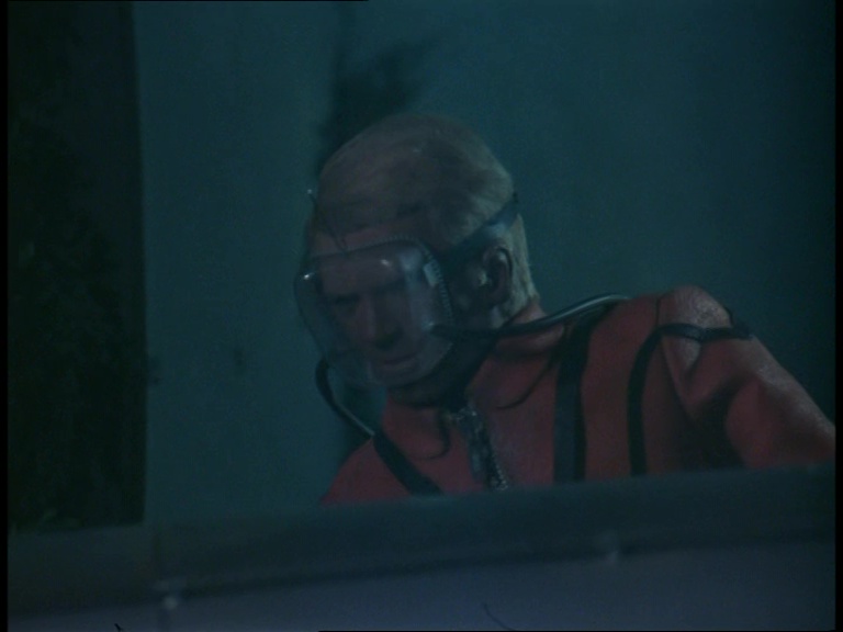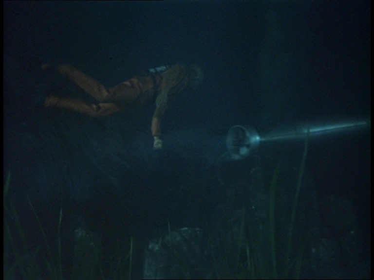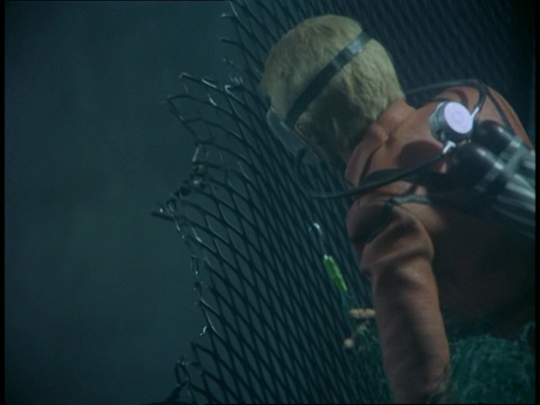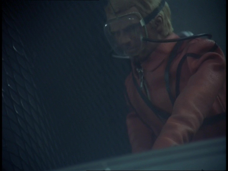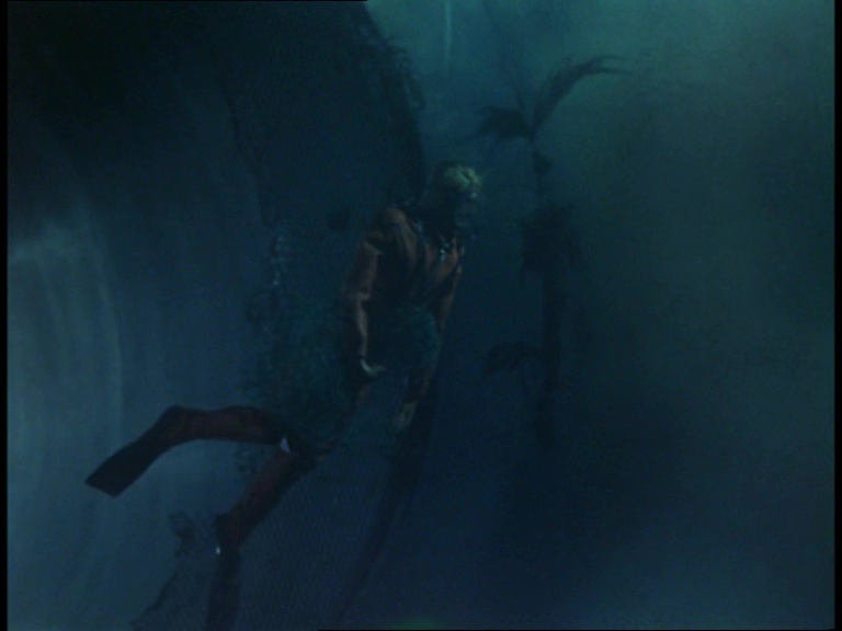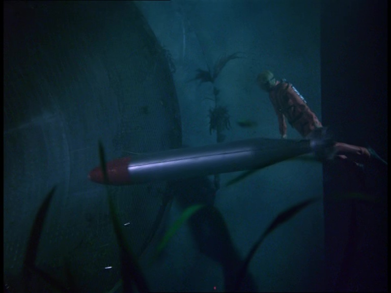 The underwater mobility scooter leaves the sub again as Matthew reaches the end of the pipeline and starts putting his handy net to work. A few fish are present in the water tank in front of the camera but the production team probably didn’t want too many swimming around messing with the already warped sense of scale. It’s worth noting again that compared with the original script, many of these scenes have been swapped around into a timeline which I daresay makes the danger feel more imminent. The sequence of events in the script feels slightly more laboured.