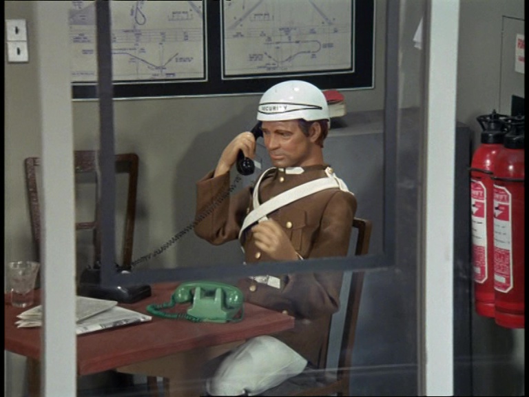 As you were probably expecting, the interior of the Burgossa plant is just like the one we saw earlier except the technicians are wearing different-coloured jumpers and new badges. Joining Plant Director Mr. Green (named after his suit?), is the project’s engineer, Tom Williams – a man you’ll probably recognise as the dashing Captain Grey from Captain Scarlet. Mr. Green is extraordinarily laid back given that the plant is about to hit the cursed 250-hour mark. But he’s confident that nobody will be able to get in and sabotage the place what with all the guards on patrol. If Burgossa’s security team is anything like the twerps who work at Marineville, I’d start running now mate.